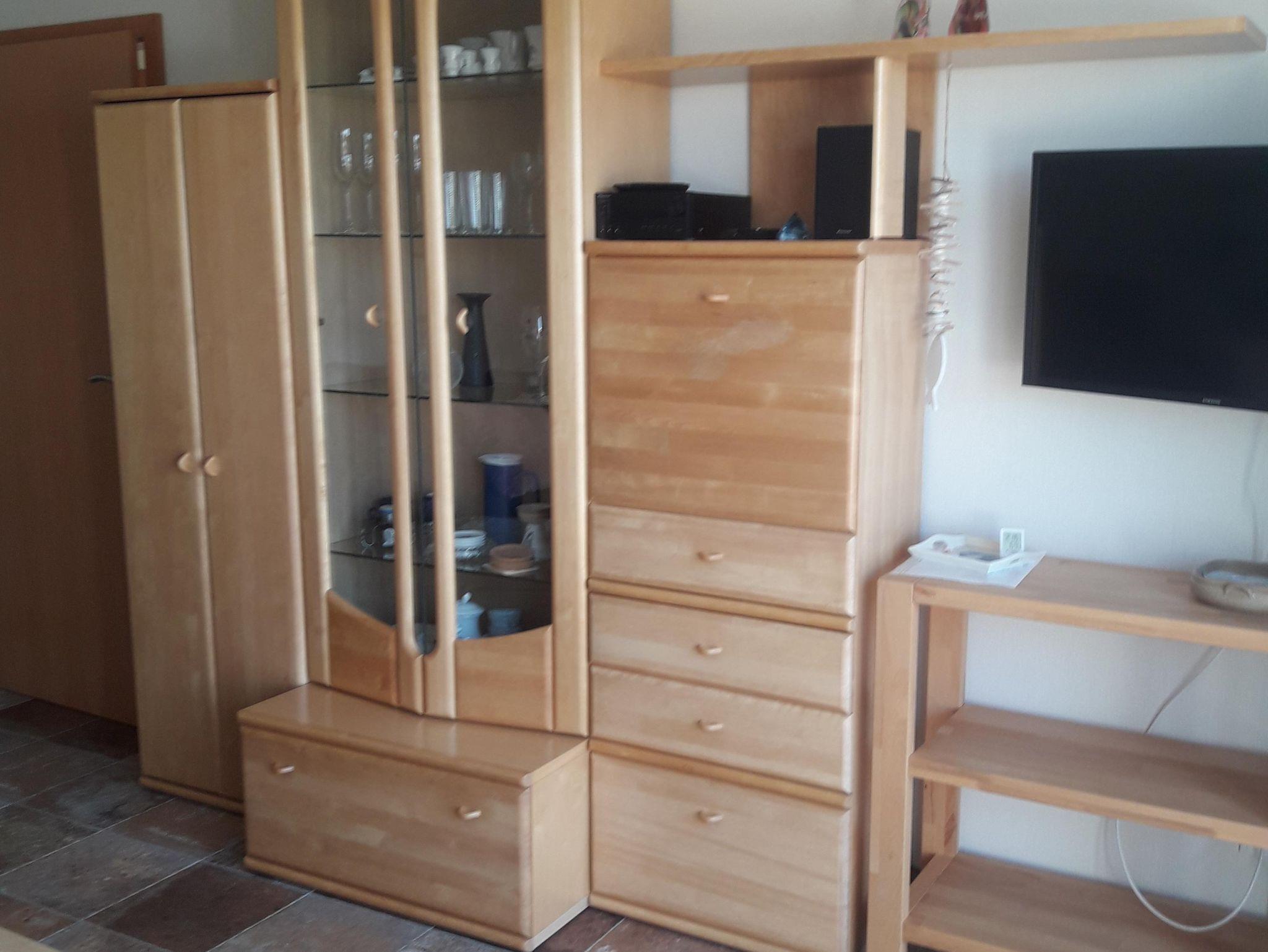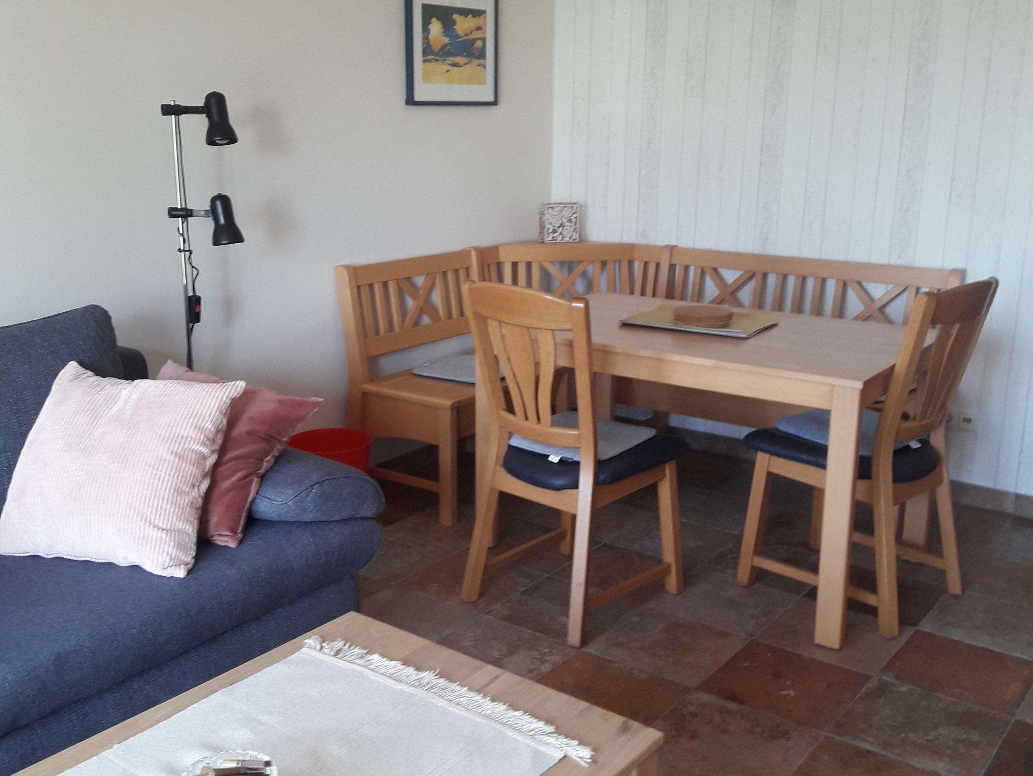 Sitz- und Essecke, Sat-TV und DVD-Player. 1 Schlafzimmer mit Doppelbett, großem Kleiderschrank und Frisiertisch,