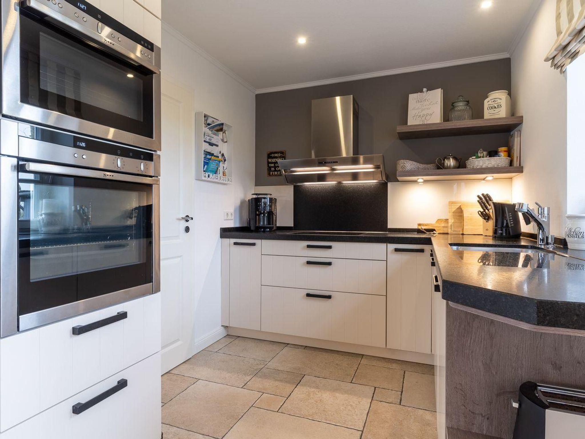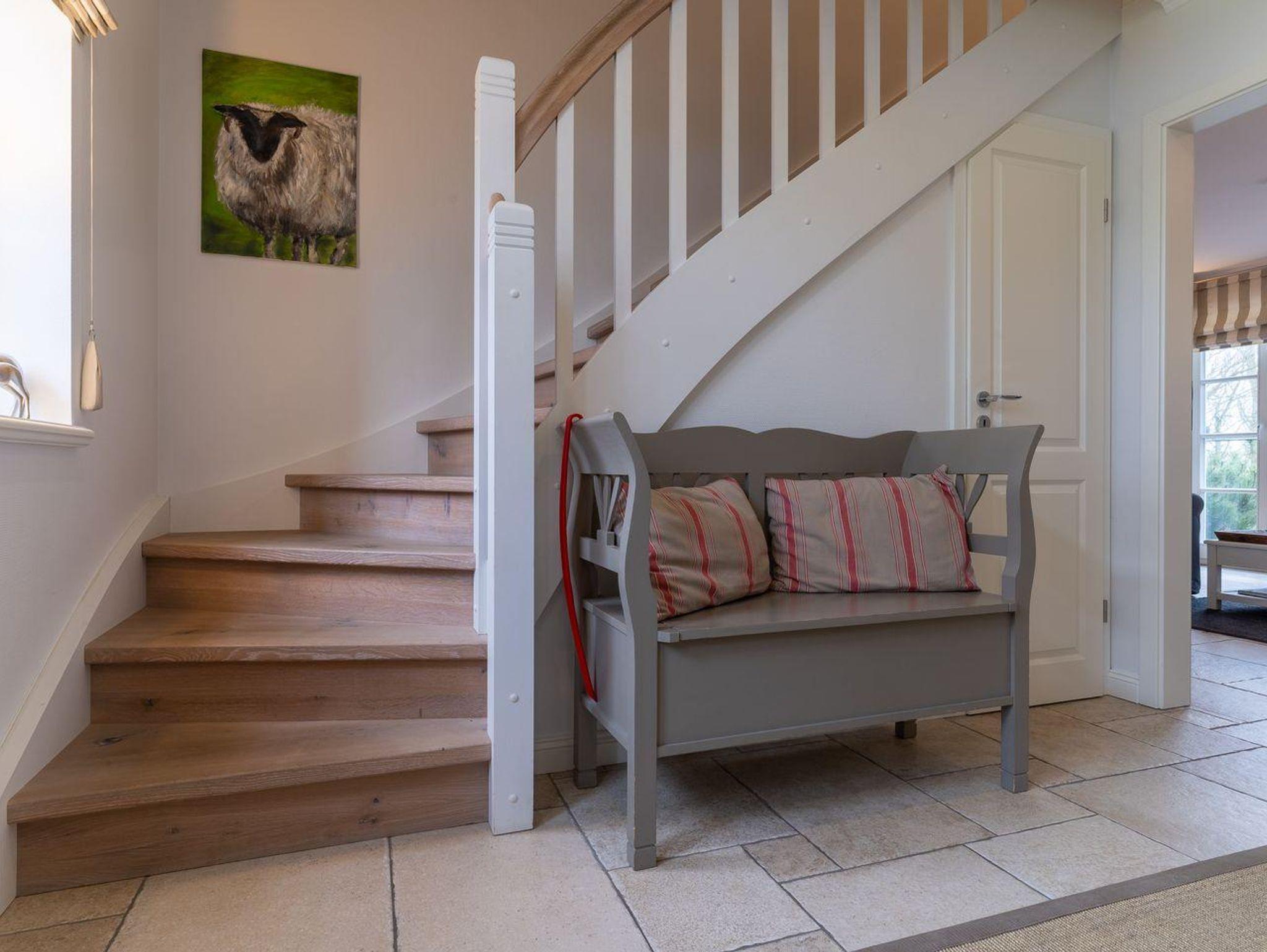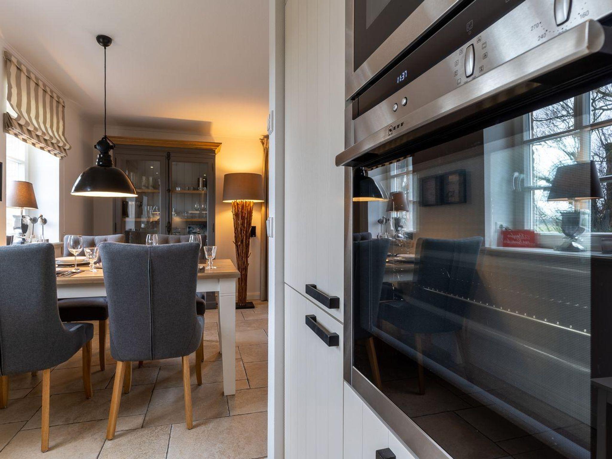 Eine Haushälfte unter Reet, ca. 100 m² Wohnfläche auf 2 Ebenen, auf großzügigem Grundstück mit ca. 1.200 m² und Terrasse. Im EG befinden sich ein Duschbad mit barrierefreier Dusche und WC, ein Schlafzimmer mit einem 1,60 x 2 m Doppelbett, das gemütliche Wohn/Esszimmer mit Kaminofen, offener, hochwertiger Küche sowie einem Wirtschaftsraum mit Waschtrockner. Im OG befinden sich das großzügige Elternschlafzimmer mit Boxspringbett 1,80 x 2 m und einem Einbauschrank, ein Kinderzimmer mit zwei Einzelbetten 1 x 2 m plus Einbauschrank sowie einem Duschbad mit Komfortdusche, Doppelwaschbecken und Handtuchheizung und WC. Im gesamten Haus liegt eine Fußbodenheizung, im EG unter Fliesen im OG unter weiß gekalkten Eichendielen.