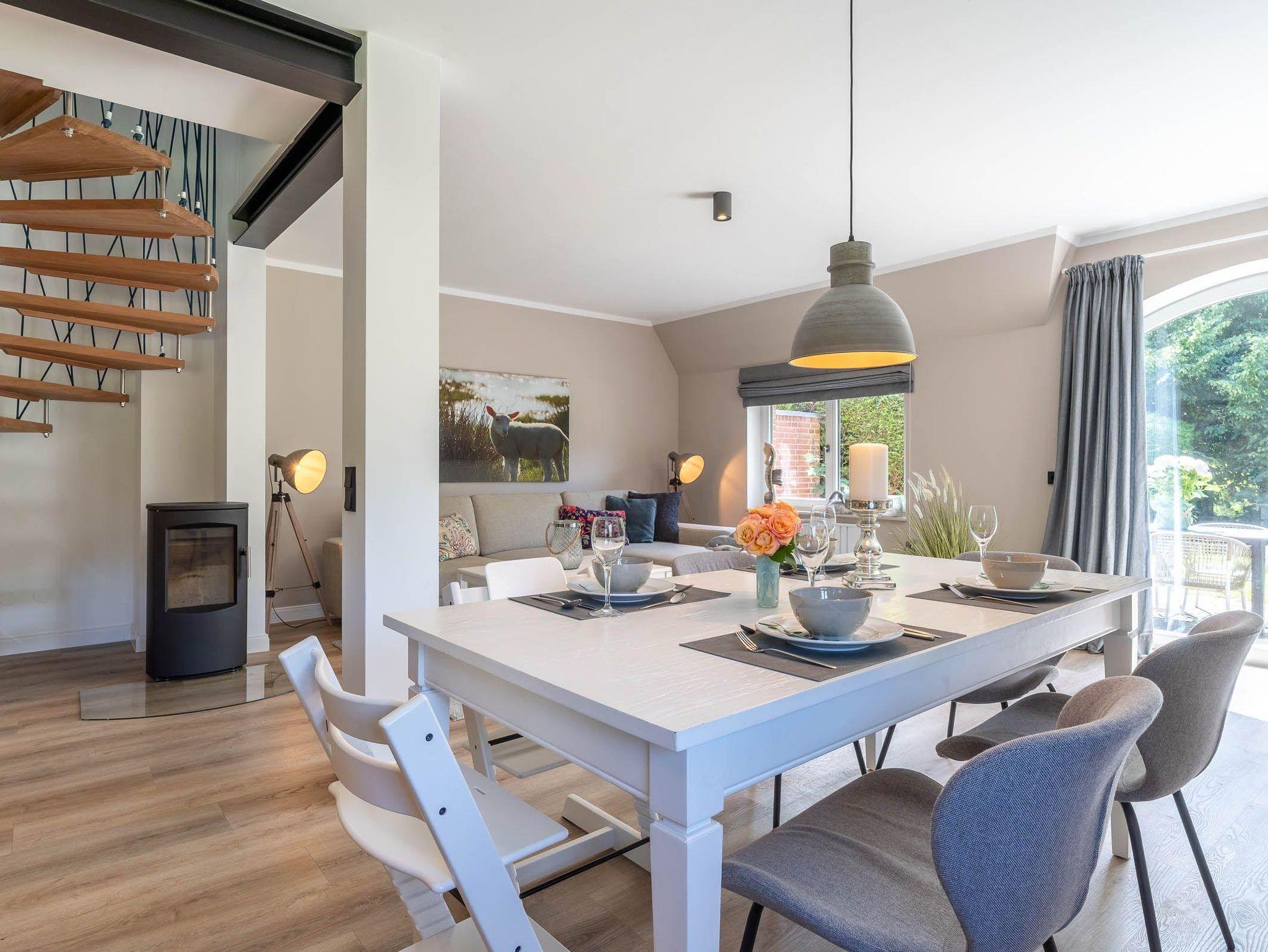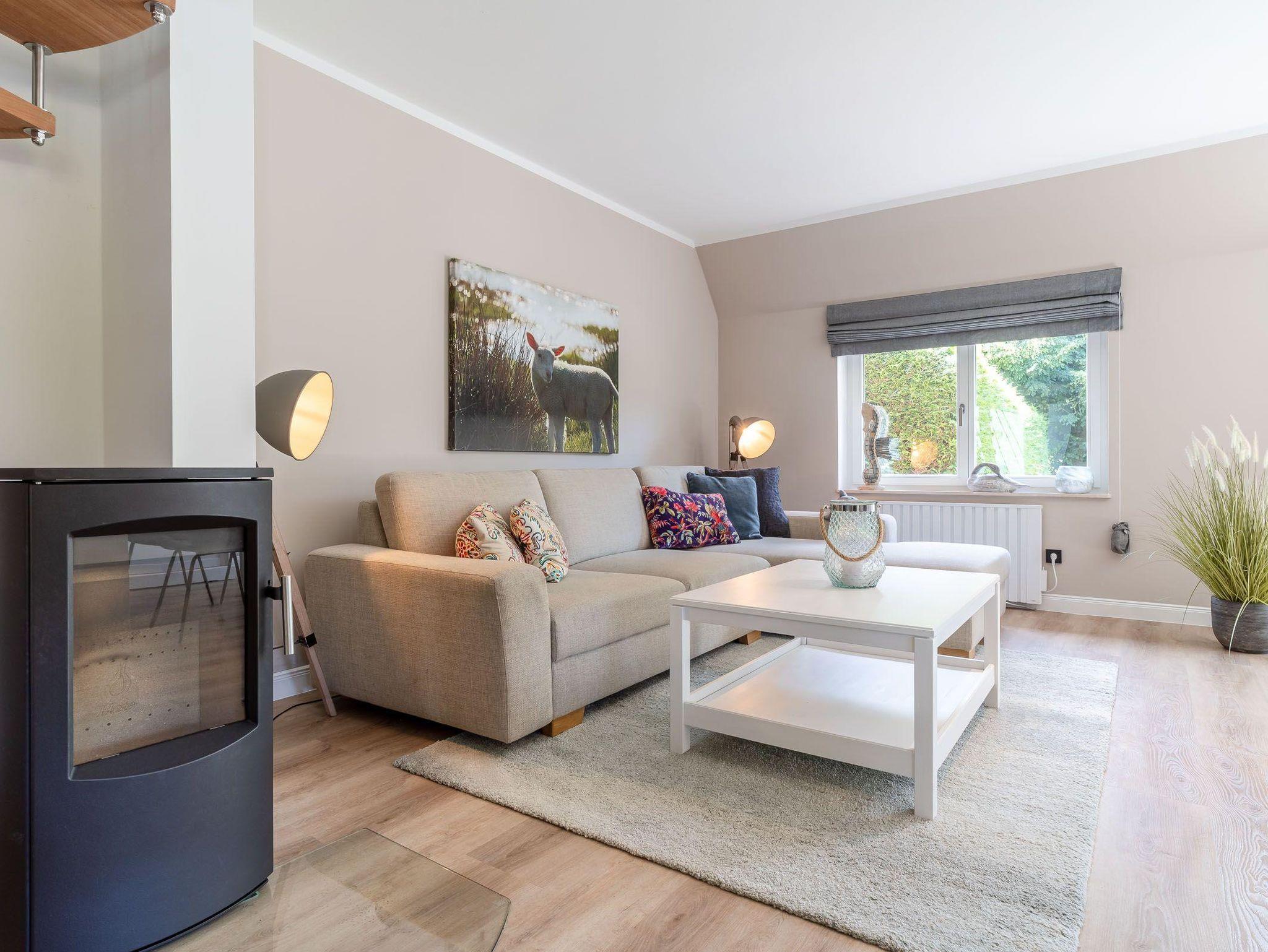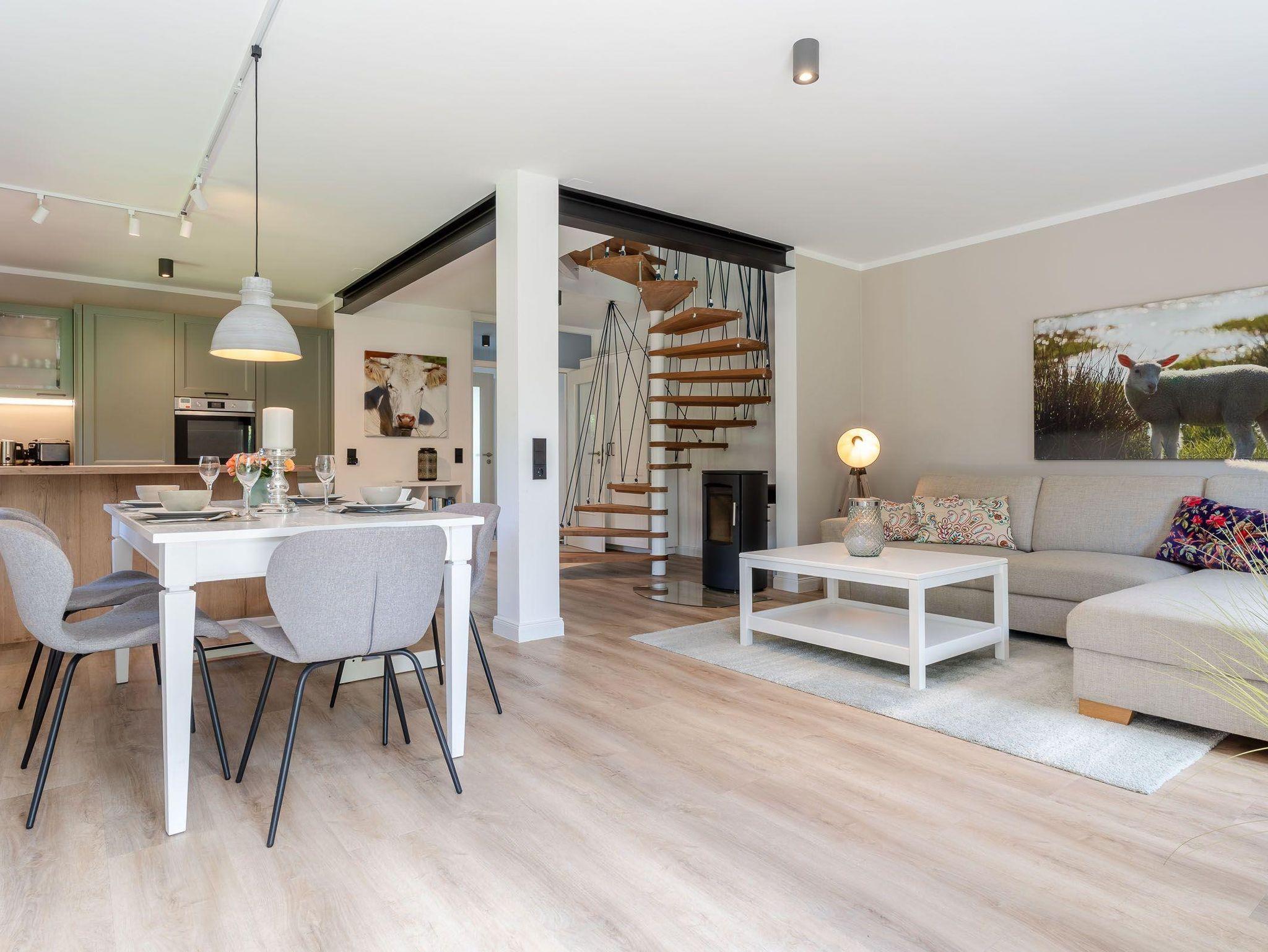 Auf rund 95 Quadratmetern Wohnfläche bietet der Mini-Haubarg großzügig Platz für bis zu 4 Personen – ideal für Familien, Paare oder Freunde, die das Besondere suchen. Im großzügigen Wohn- und Essbereich sorgt ein hochwertiger Heizkamin für gemütliche Abende. Von hier aus gelangen Sie direkt auf die Sonnenterrasse mit Blick in den eingewachsenen Privatgarten, eingefasst von Friesenwall und blühenden Buschrosen – ein echtes Idyll.