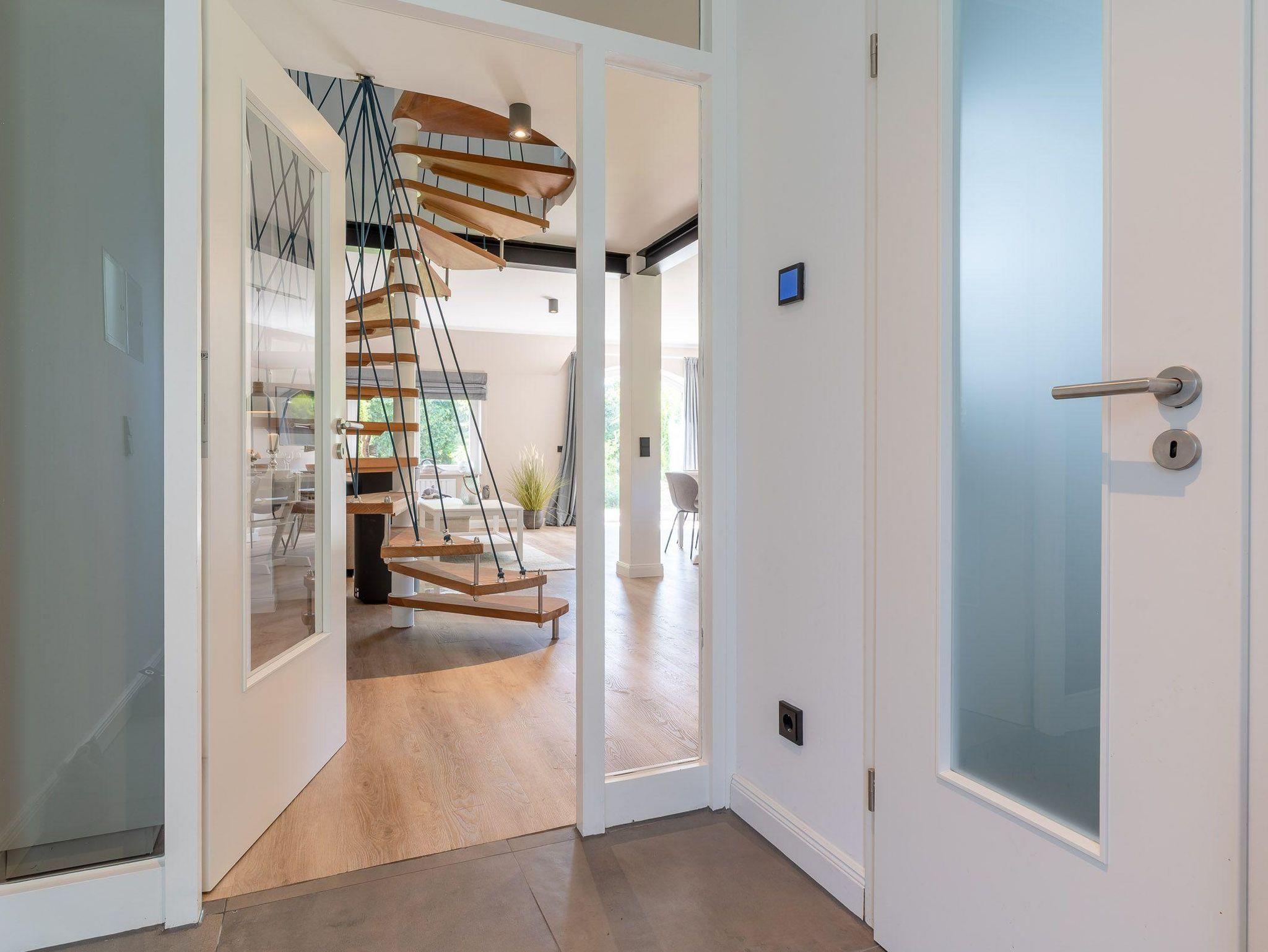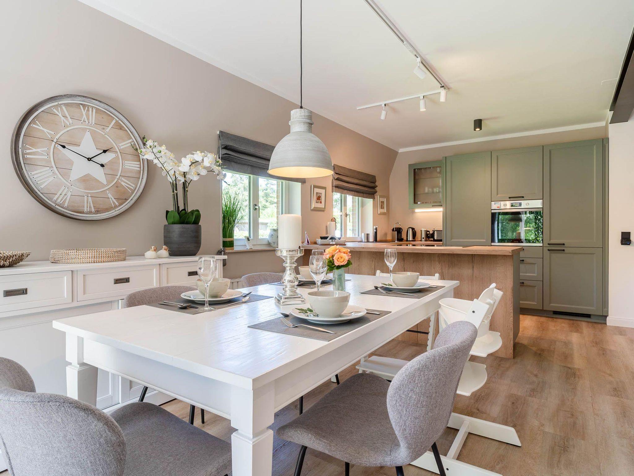 Die moderne, voll ausgestattete Wohnküche mit Kochinsel, hochwertigem Mobiliar und großzügigem Esstisch lässt keine Wünsche offen. Ein separates Gäste-WC rundet das Erdgeschoss ab.