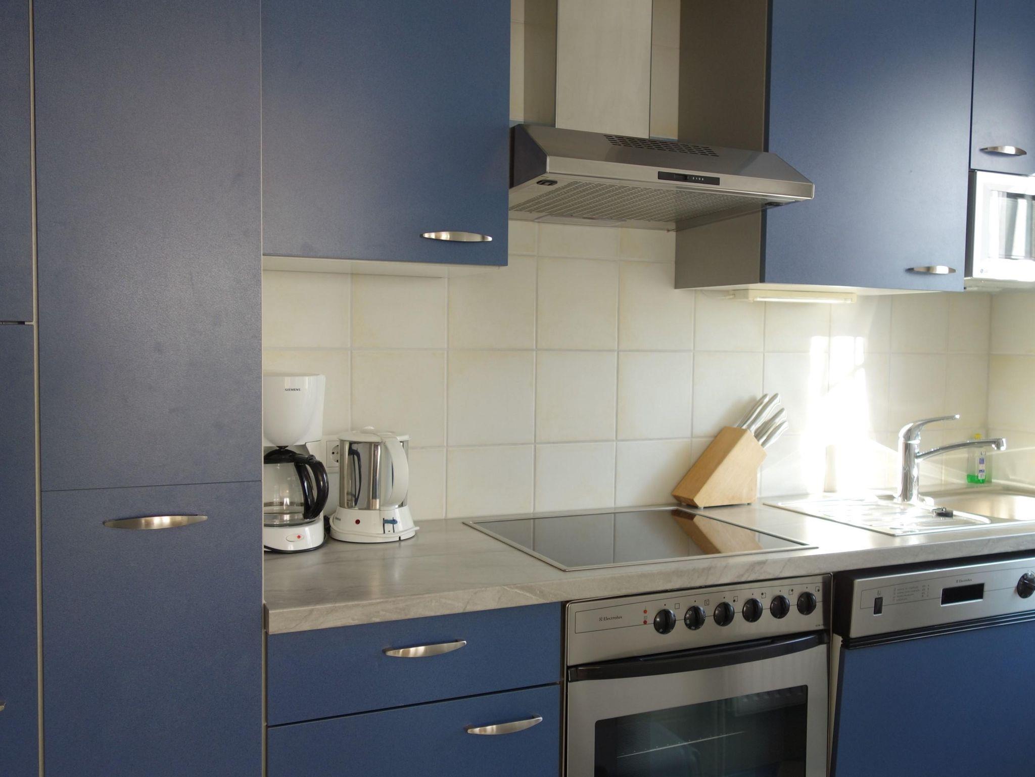 - komplett eingerichtete Einbauküche, Geschirrspüler, Herd mit Ceran-Kochfeld und Backofen, Mikrowelle, Kühlschrank, Tiefkühlschrank, Kaffeemaschine, Toaster, Mixer, Wasserkocher, reichlich Geschirr, Gläser, Besteck u. Edelstahltöpfe