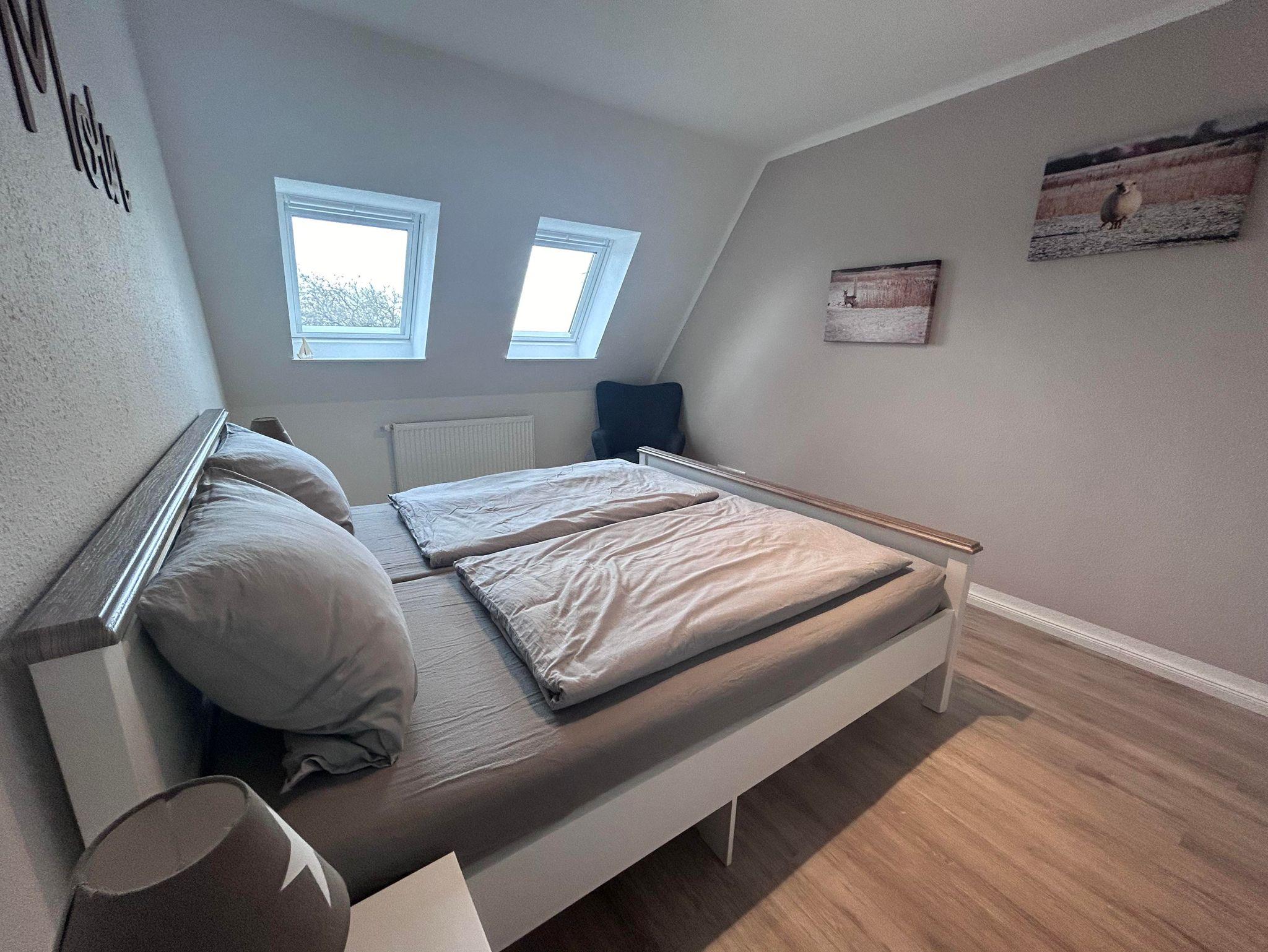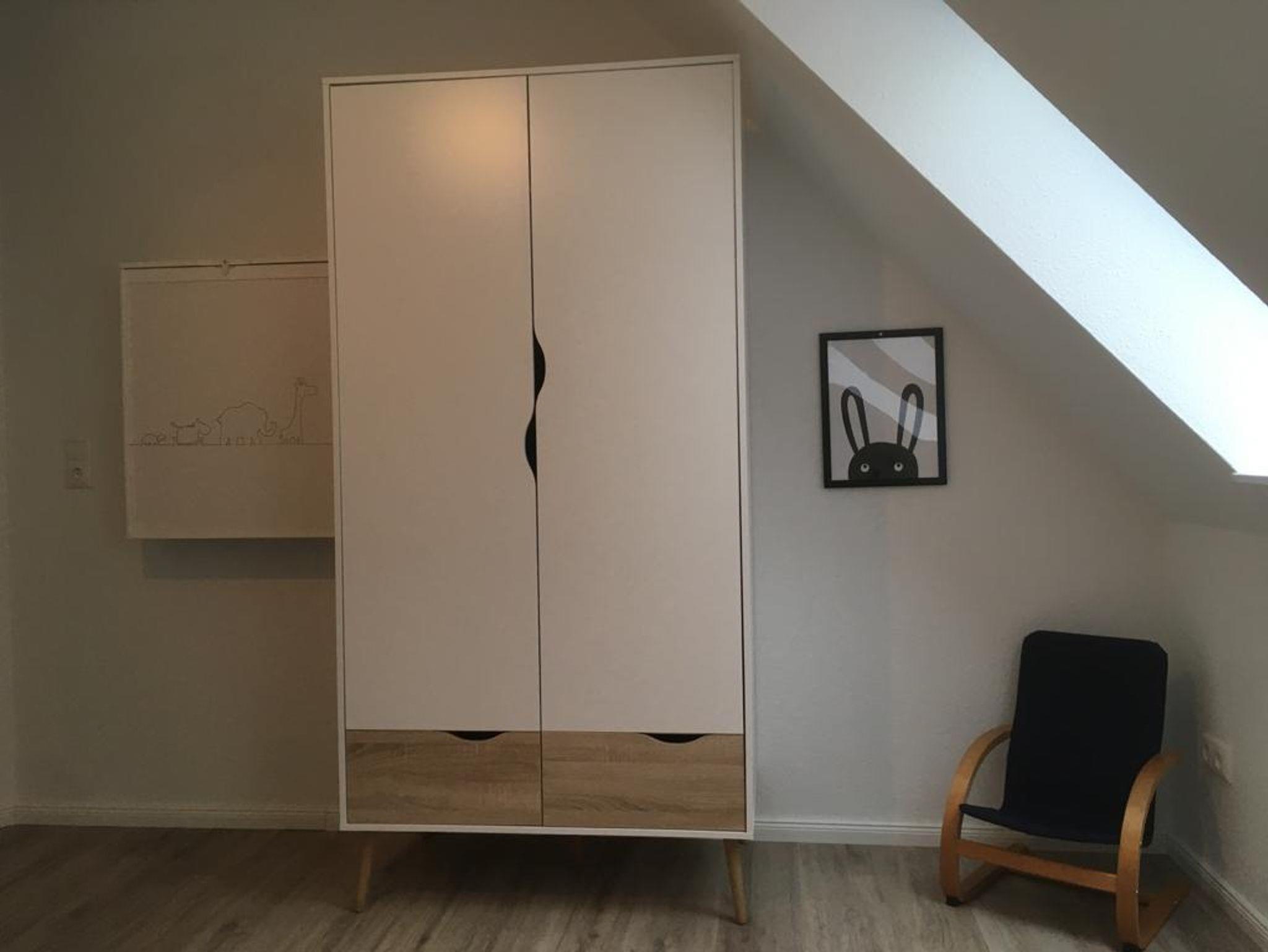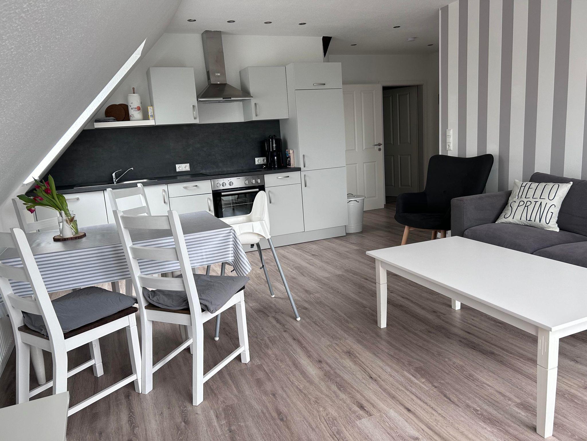 Unsere neu entstandene Obergeschosswohnung hat eine Wohnfläche von ca. 60 qm. Der Wohnraum ist hell, modern und gemütlich eingerichtet. Der Wohn/Essbereich bietet aureichend Platz für die ganze Familie. Das Elternschlafzimmer hat ein Doppelbett (180x200cm). Das Kinderzimmer verfügt über ein Etagenbett und ein Einzelbett. Die vollausgestattete Küche bietet Ihnen alles, was Sie für Ihren Urlaub benötigen u.a. Geschirrspüler, Backofen, Mikrowelle, Kaffeemaschine etc. In der Wohnung befindet sich ein Duschbad mit Handtuchwärmer. Die Wohnung hat direkten Blick über die tollen Panoramafenster und ausklappbaren Mini Balkon in den Garten und Spielplatz. In einem separaten Raum gibt es die Möglichkeit gegen Gebühr zu waschen und zu trocknen.