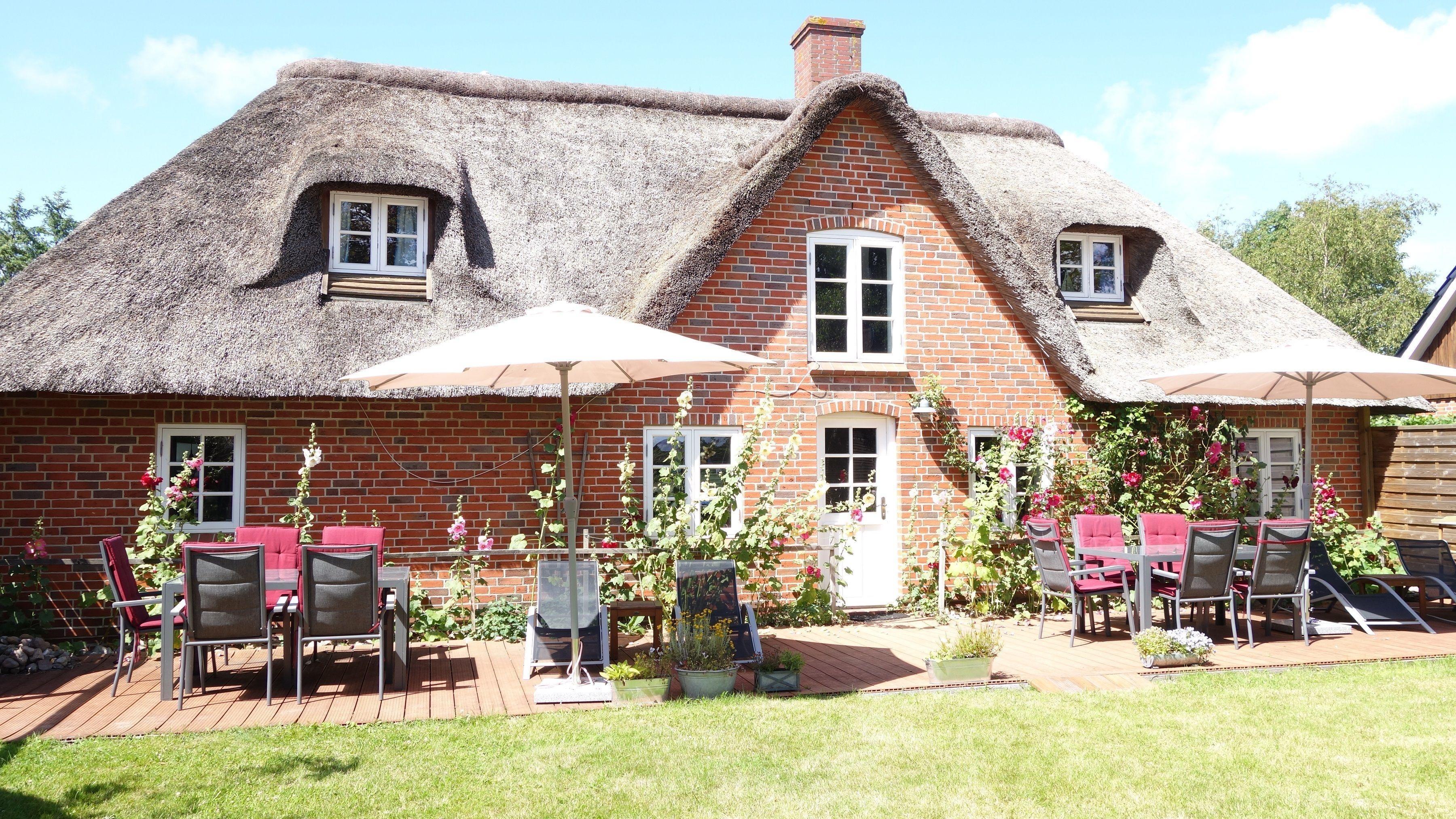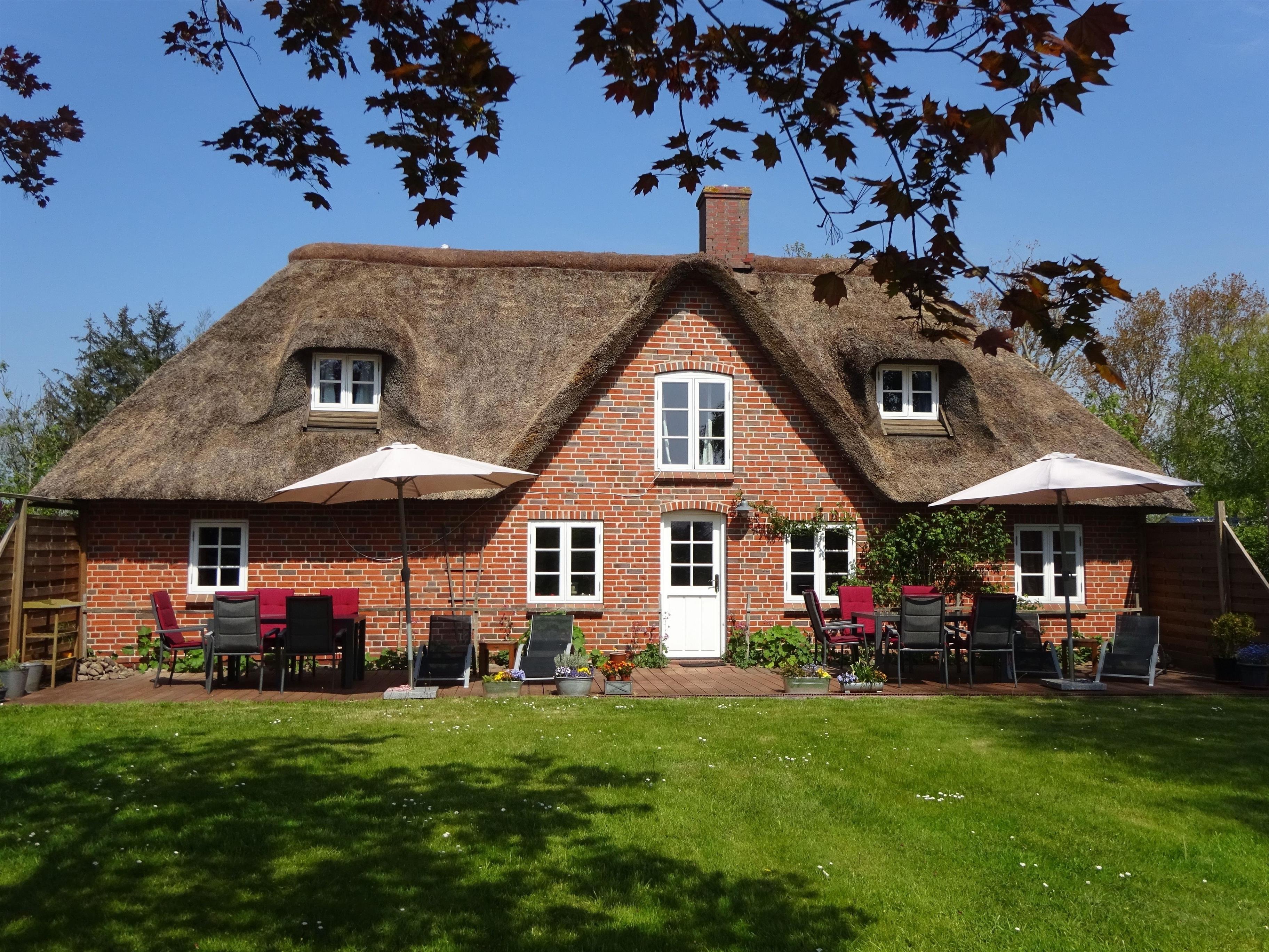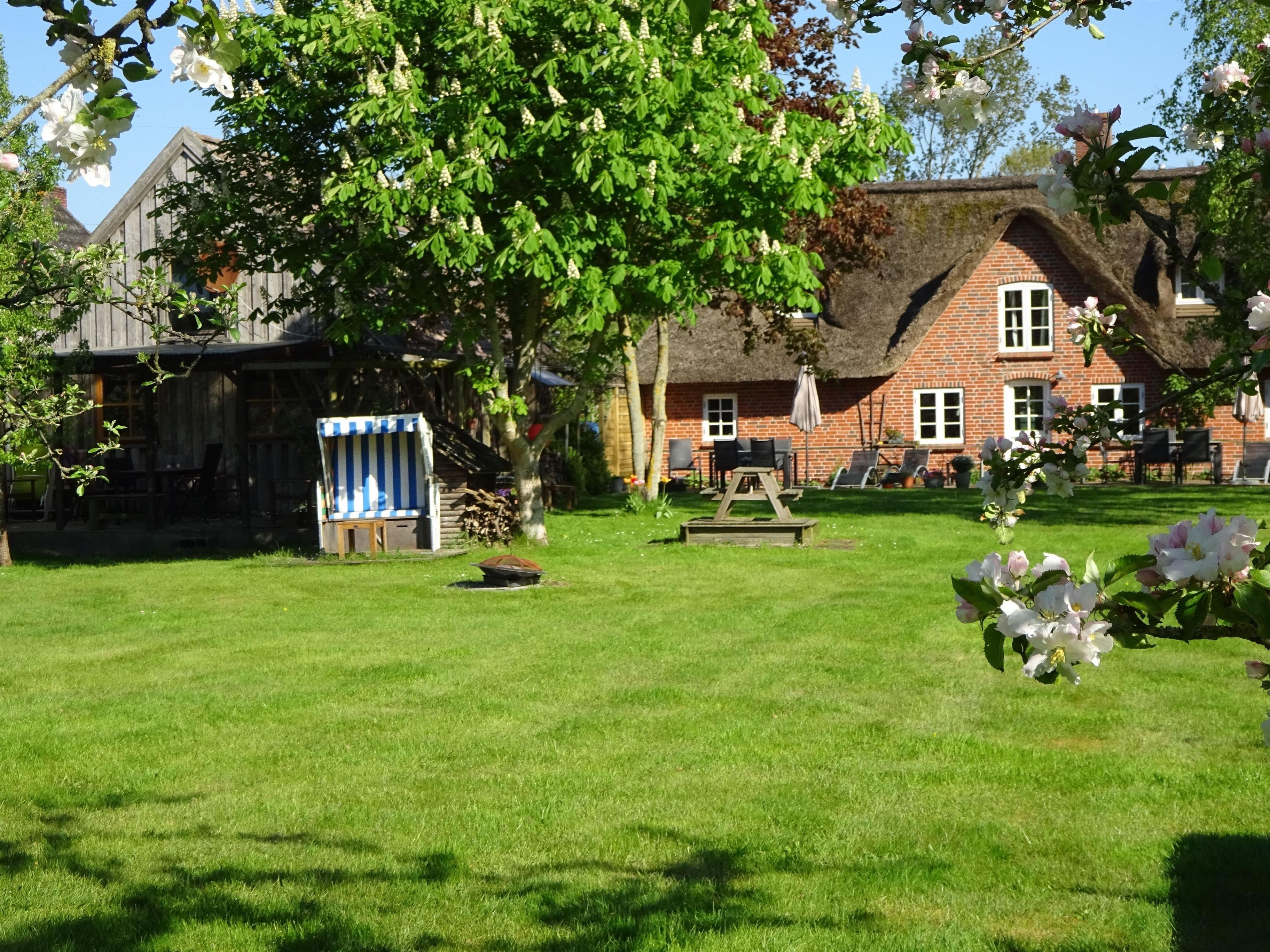 Gemütliche Reetdach-Ferienwohnung in Tating mit großem Garten und Kaminofen, ideal für Familien und Naturfreunde.