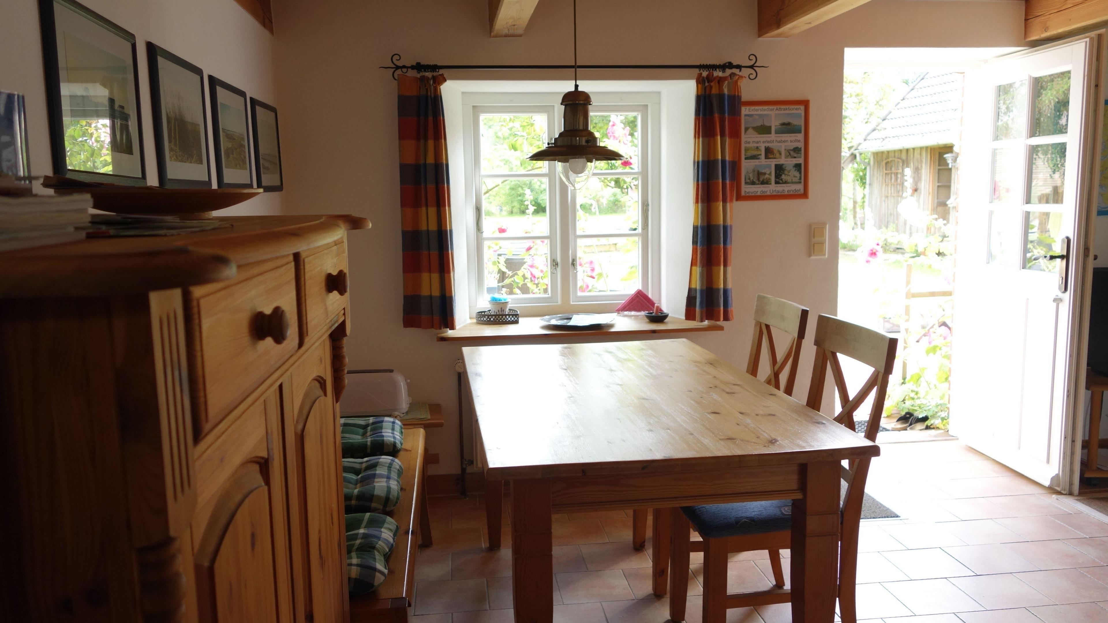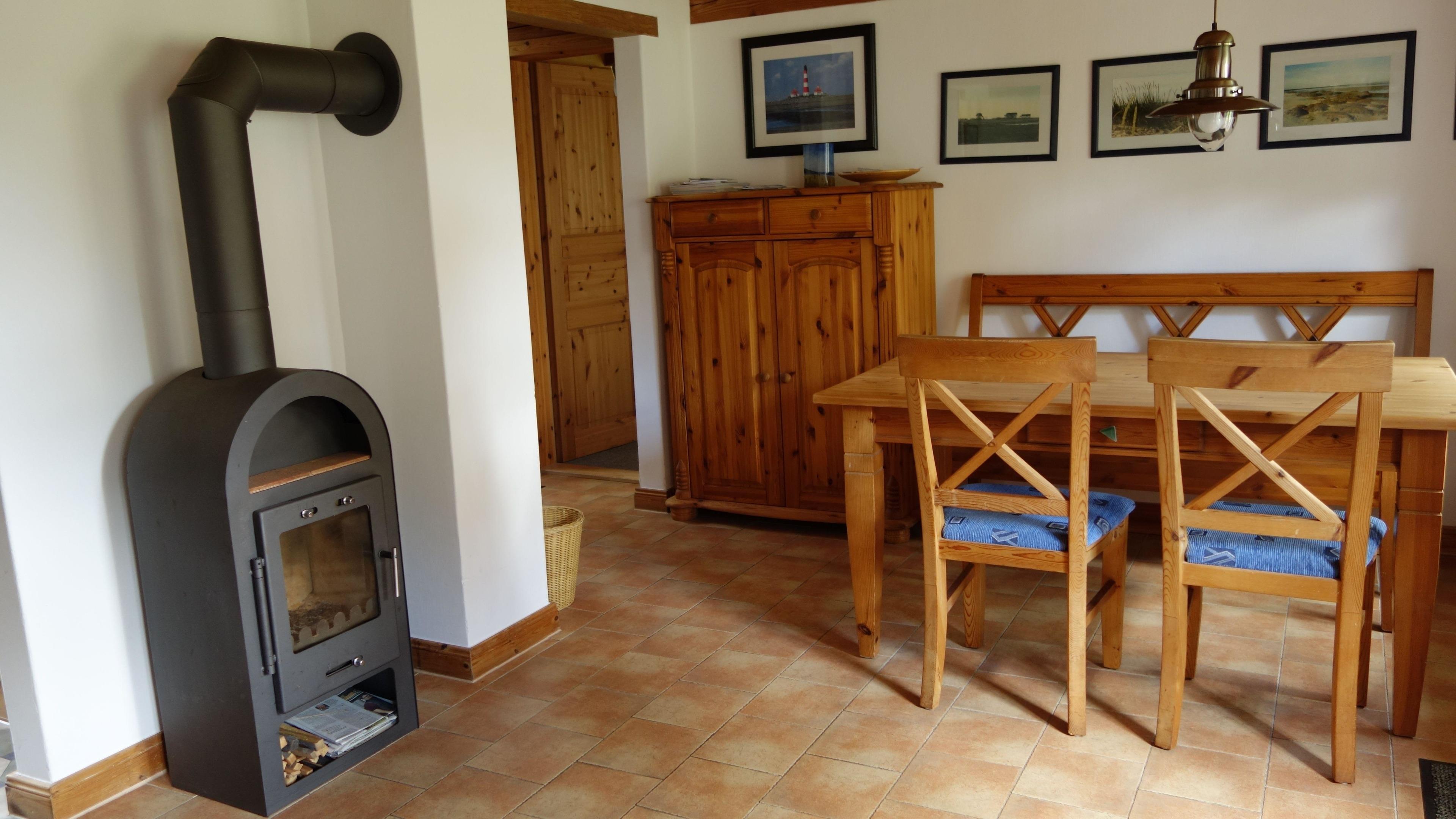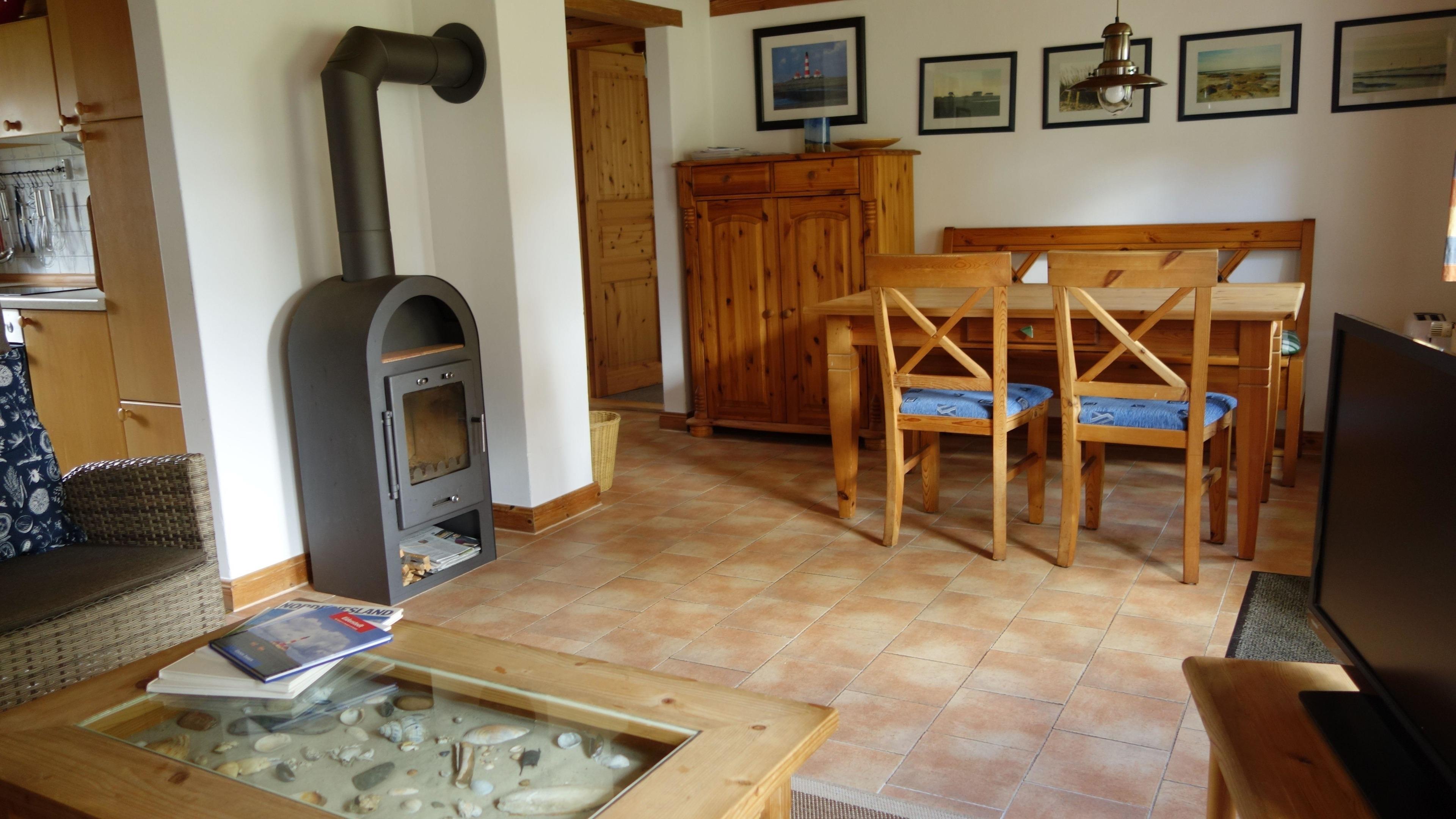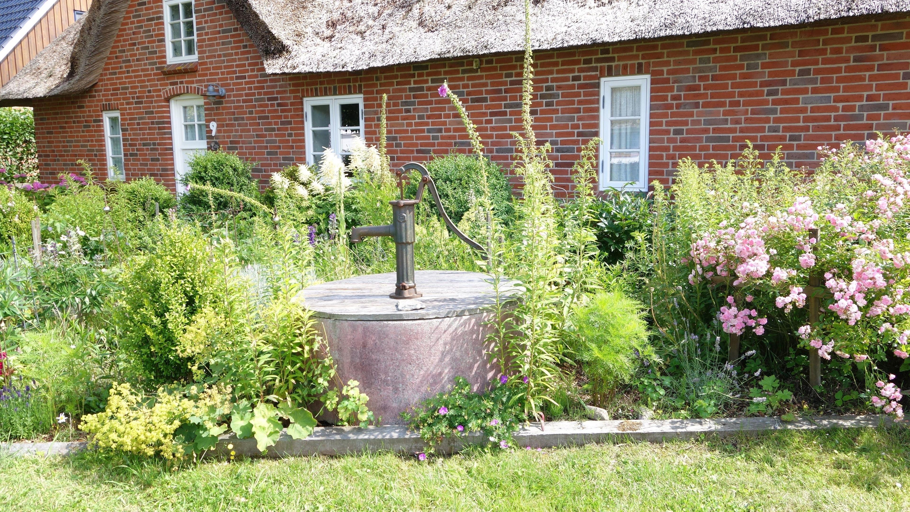 Gemütliche Reetdach-Ferienwohnung in Tating mit großem Garten und Kaminofen, ideal für Familien und Naturfreunde.