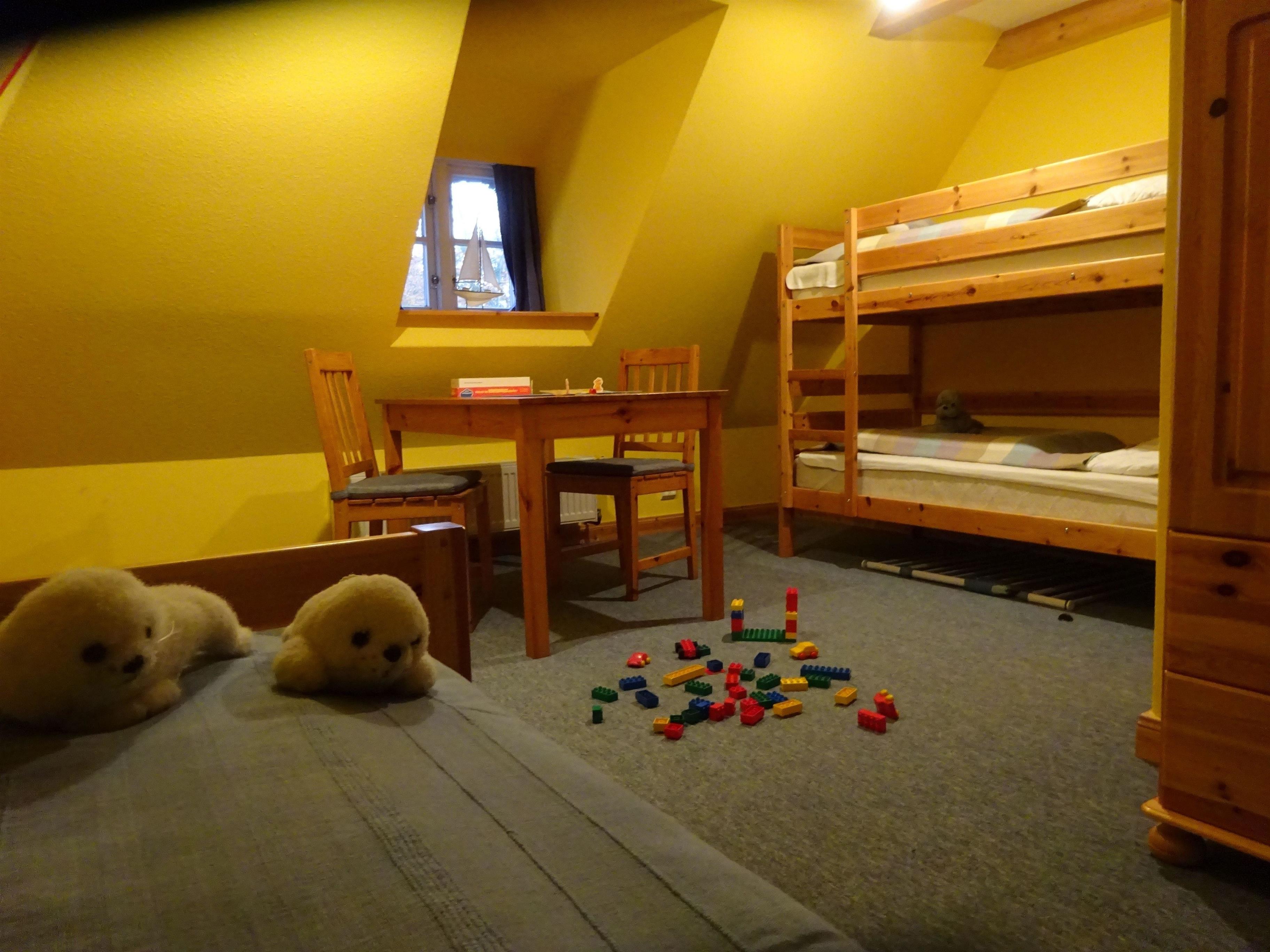 Essplatz. Das Küchenzubehör und Besteck ist für 5 Personen vorhanden. Im Anschluss daran liegt der Wohnbereich mit Sofa, Couchtisch, zwei Rattanstühlen und dem großen Essbereich. Ein besonderes Plus ist der Kaminofen. Sie haben von hier einen direkten Zugang zur möblierten Terrasse (rechte Hälfte - siehe Foto) , sowie dem 1800 qm großen Garten mit Schaukel, Sandkiste und Trampolin. Weiter befindet sich im EG das Elternschlafzimmer mit einem Doppelbett (Platz für ein Kinderreisebett ist vorhanden). Auch das Duschbad befindet sich im Erdgeschoss. Im Dachgeschoss liegt das Kinderzimmer mit einem Etagenbett und einem Einzelbett. Es befindet sich zusätzlich ein Tisch mit Stühlen im Zimmer zum Spielen, Malen u.a..