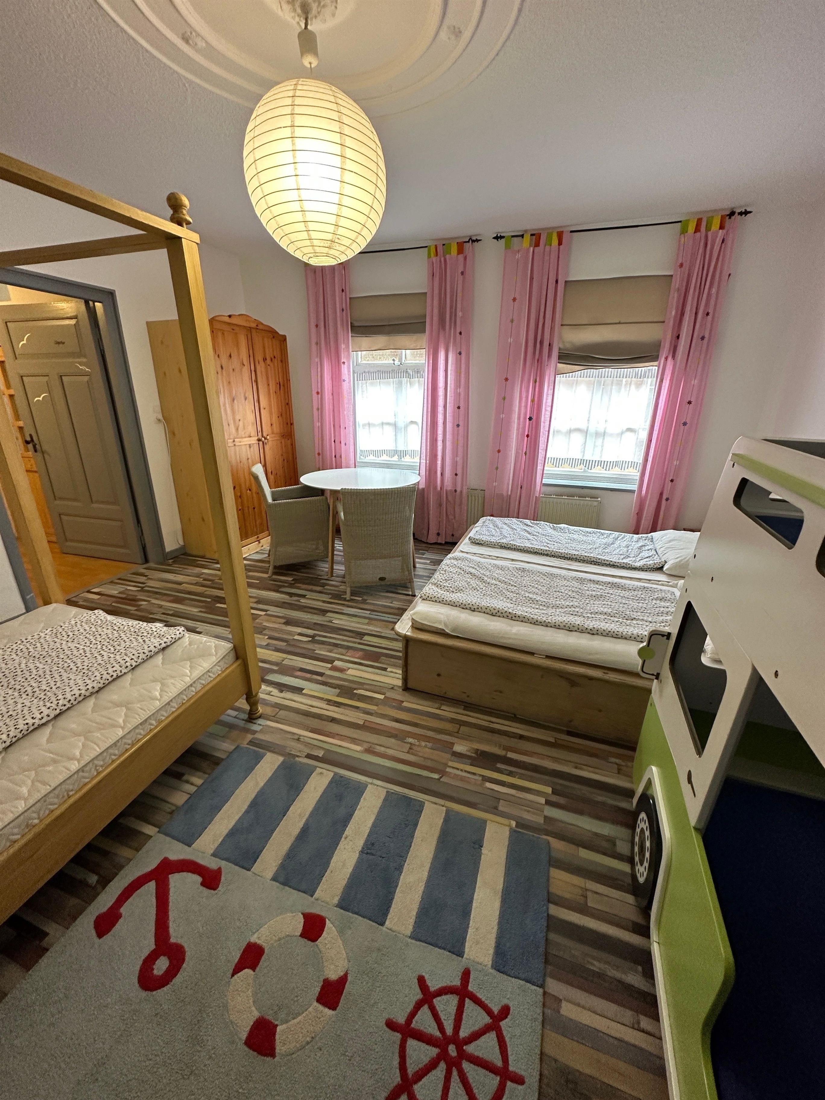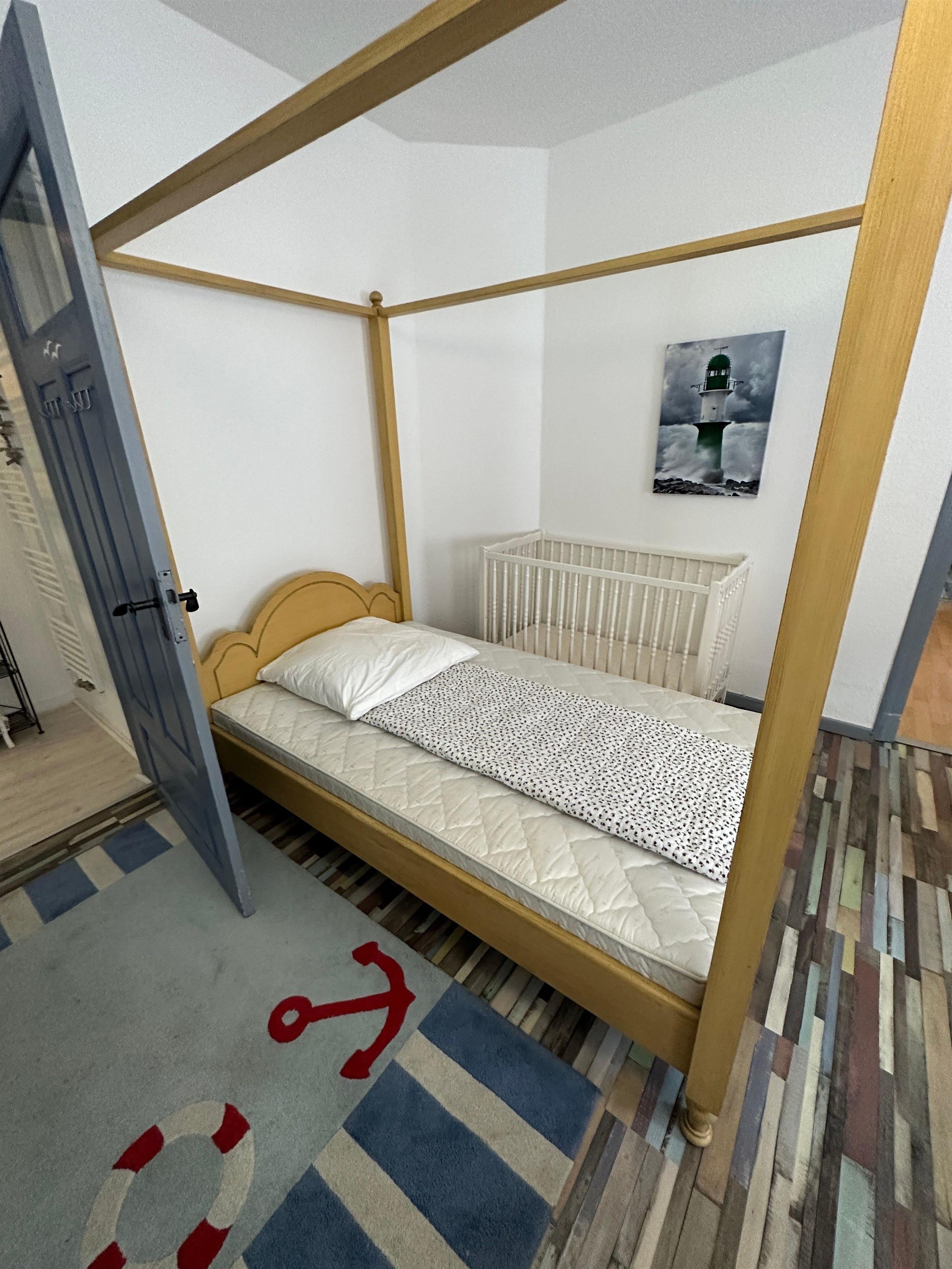 1 kleines Schlafzimmer mit Doppelbett, 1 großes Schlafzimmer / Familienzimmer (1 Doppelbett, 1 großes Himmelbett, feststehendes Kinderbett und 1 Doppelstockbett) mit direktem Zugang zum Bad.