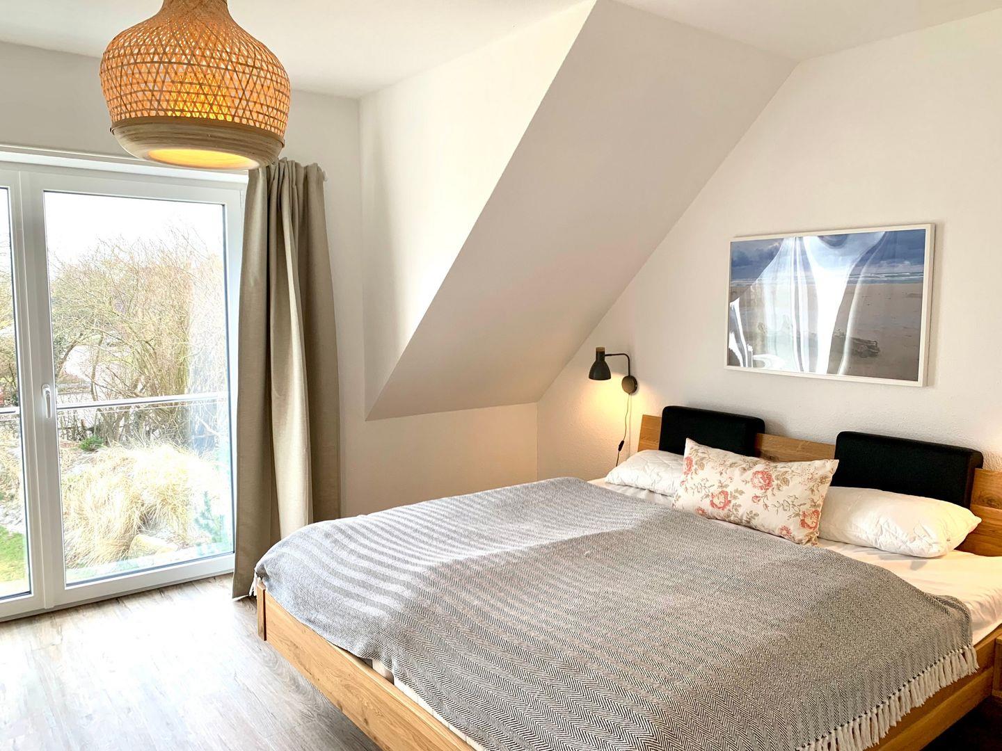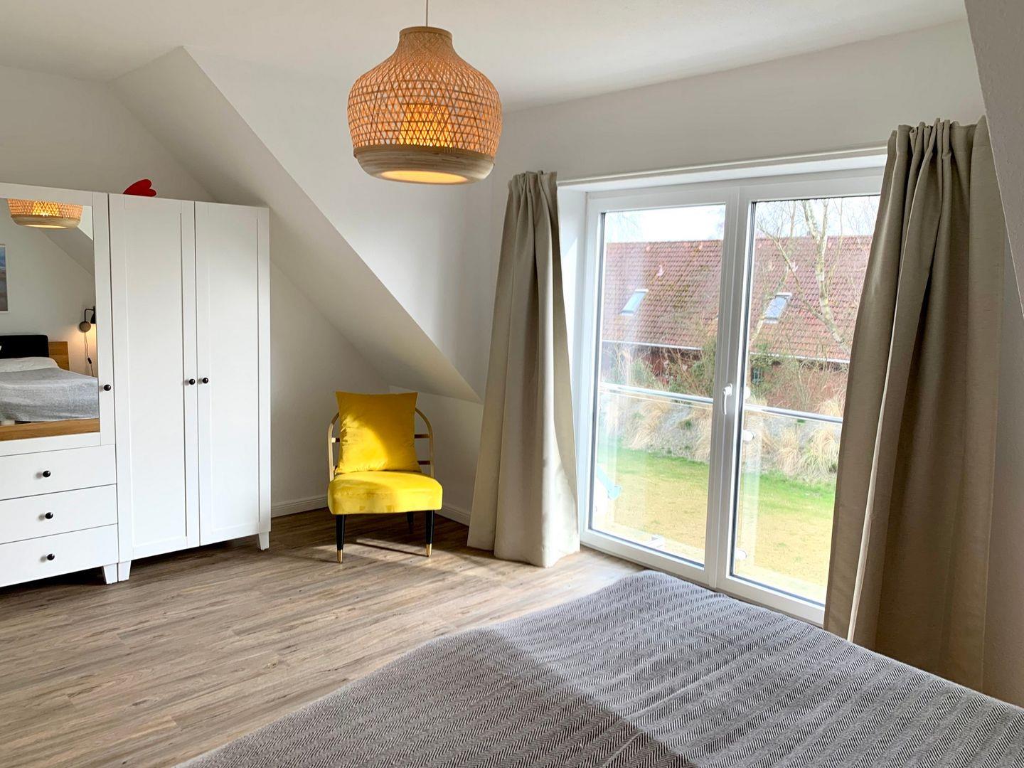 Das große, wunderbar helle Schlafzimmer bietet dank großem Panoramafenster einen tollen Ausblick in den Garten und ins Grüne.