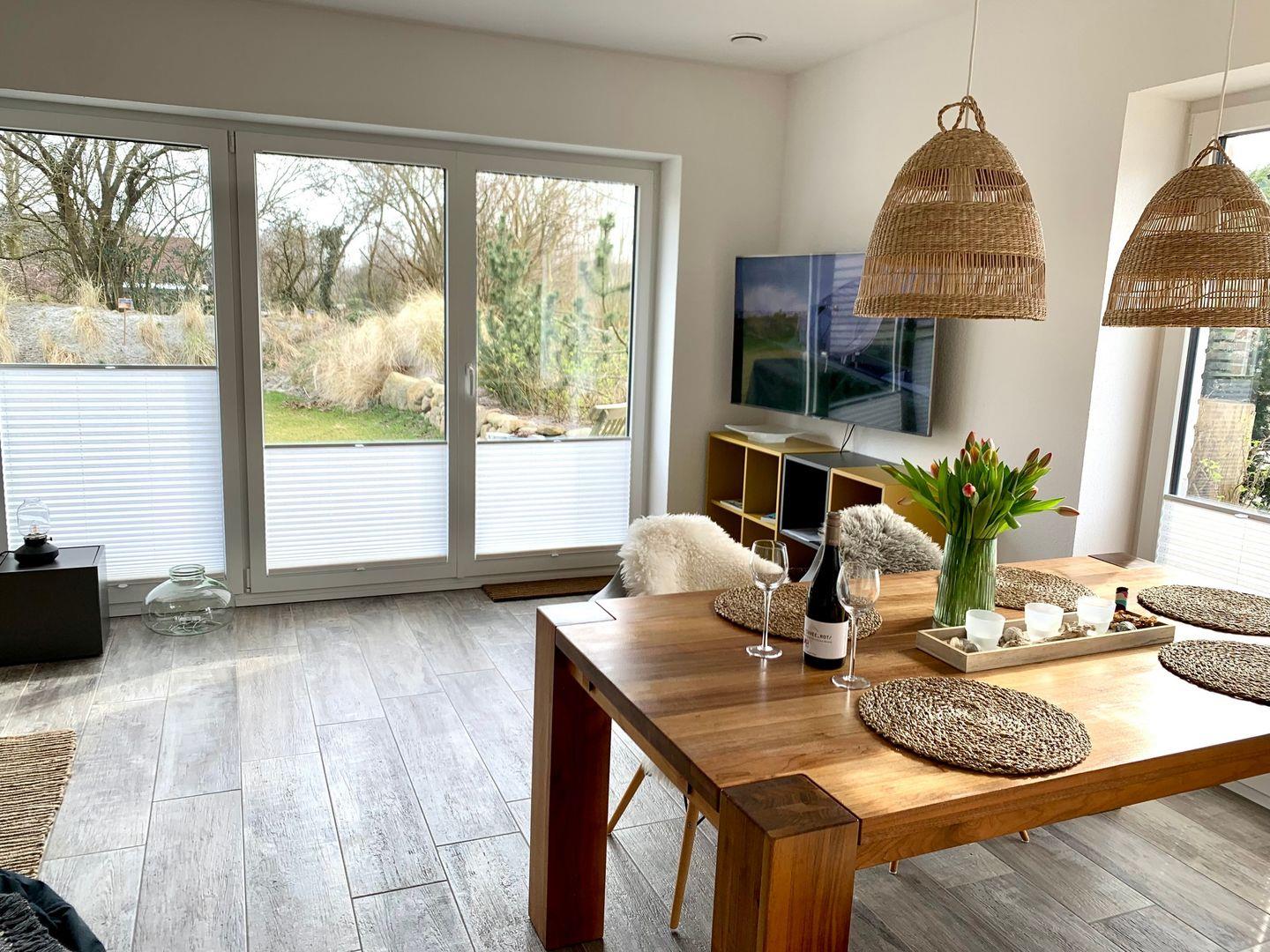 Die urgemütliche Couchgarnitur und ein komfortabler Sitzsack bieten eine tolle Grundlage für gemütliche, gemeinsame Stunden bei guten Filmen oder toller Musik. Dafür sorgt der große 55 Zoll Flachbild-TV des kleinen Knutt, kostenfreies W-LAN sorgt für noch mehr Unterhaltungsmöglichkeiten. In edlen Echtholz präsentiert sich der große Esstisch, an dem die ganze Familie zum Essen, zu Brettspielen und zum Beisammensitzen Platz findet.