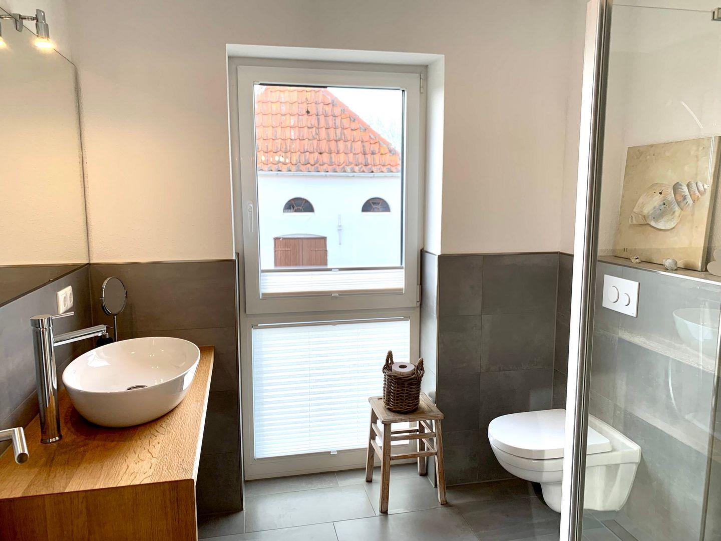 Das moderne, helle Badezimmer verfügt über eine ebenerdige Dusche, ein edles Waschbecken und WC.