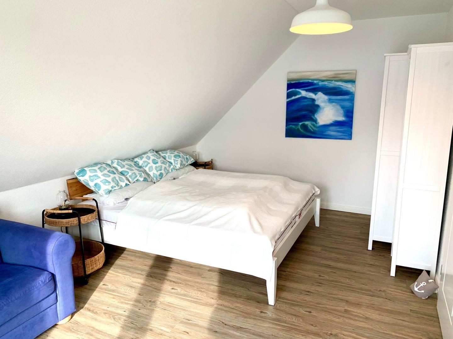 Ein 180x200cm Doppelbett gehört nebst großem Kleiderschrank zur Ausstattung.
