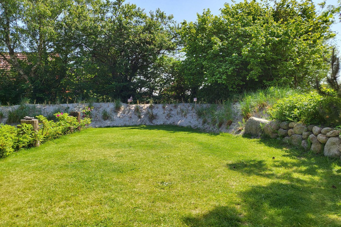 Ein mit Dünengras bewachsener Wall umringt den großen, grünen Garten.