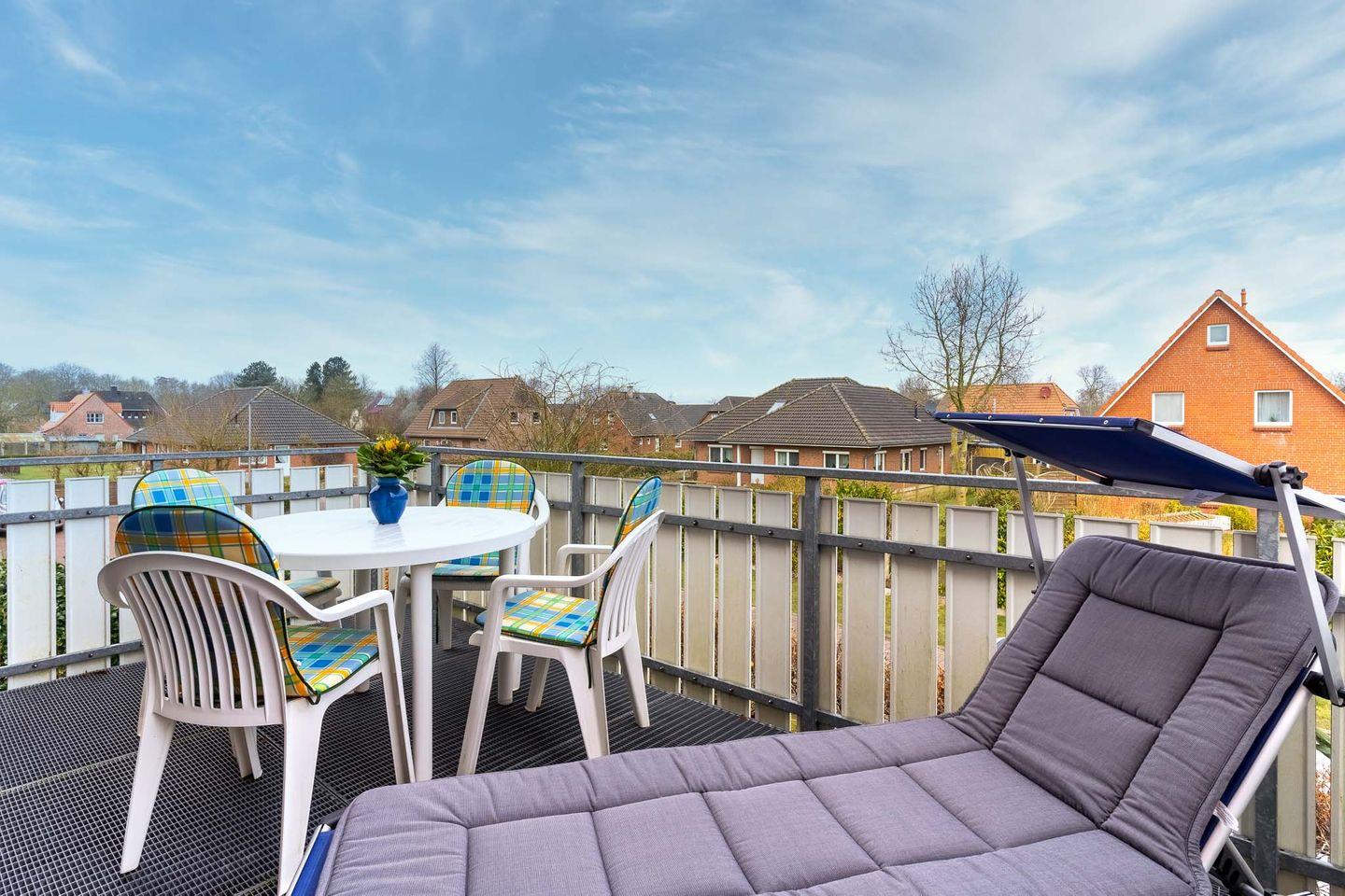 Ein separater Treppenaufgang führt Sie direkt zum möblierten Nord-Balkon, der zum Entspannen und Genießen einlädt. Hier können Sie morgens bei einer Tasse Kaffee die frische Nordseeluft einatmen oder am Abend den Tag bei einem Glas Wein ausklingen lassen.