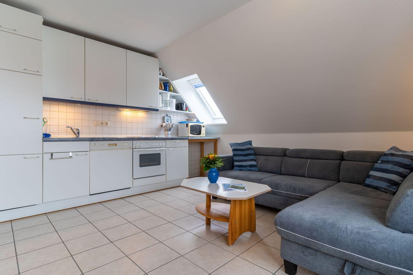 In der voll ausgestatteten Wohnküche können Sie Ihre kulinarischen Fähigkeiten unter Beweis stellen und gemeinsam mit Familie oder Freunden ein leckeres Essen zaubern. Der Essbereich bietet Platz für bis zu vier Personen und lädt zum gemütlichen Verweilen ein.