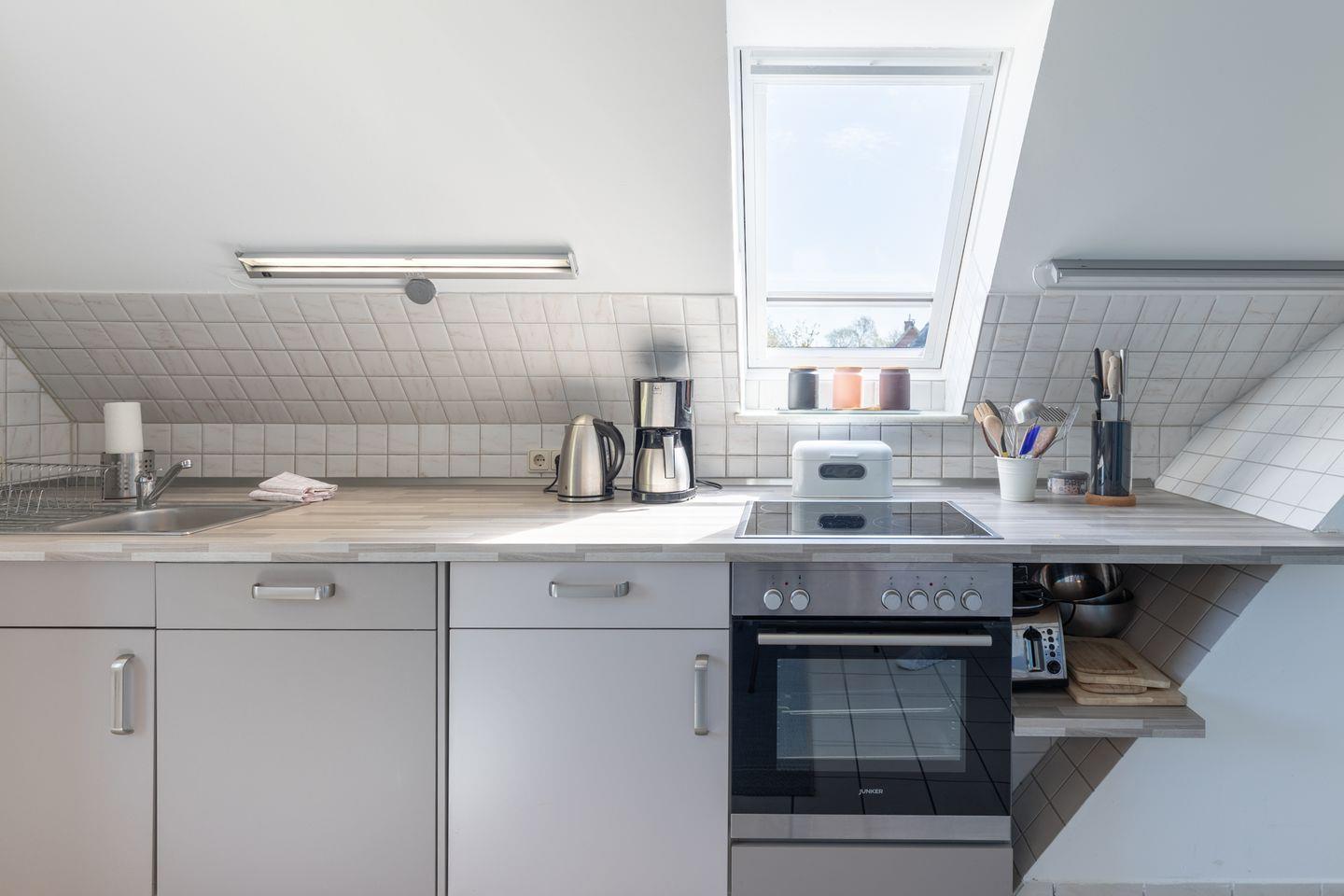 Zur Wohnung gehört eine geschlossene Küche, die sehr gut ausgestattet ist: Geschirrspüler, Kühlschrank, Gefrierfach, Backofen, Ceranfeld mit 4 Kochplatten, Dunstabzugshaube, Filterkaffee-Maschine (Filtergröße 4), Wasserkocher und ein Toaster.