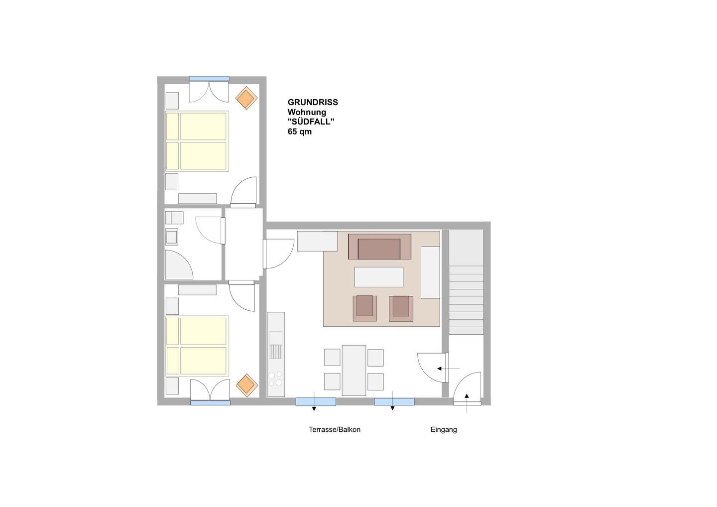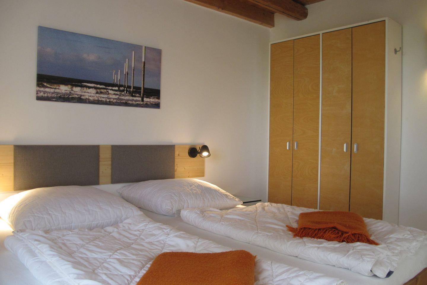 Die 60 qm große Wohnung ist im Erdgeschoss mit Terrasse untergebracht. Sie besteht aus je zwei Doppelzimmern mit dazwischen liegendem Duschbad und einem großzügigen Wohn-Essraum (bis 4 Personen). Die Wohnung ist hochwertig ausgestattet. Die Wohnräume sind gefliest, in den Schlafräumen sind Echtholzdielen verlegt.