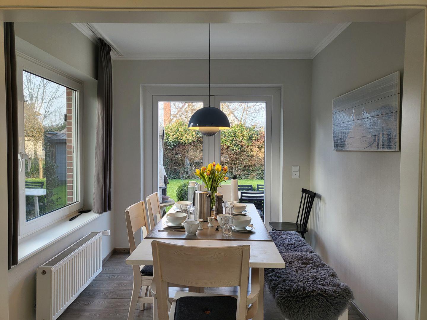 Dat Huuske Tating ist modern gestaltet und kinder- und familienfreundlich ausgestattet. Auf einer Wohnfläche von 140qm verfügt es im Erdgeschoss über einen Flur, einen großzügigen Wohnraum mit angrenzendem Essbereich, eine hochwertige Küche, ein Schlafzimmer mit 2x2m-Bett sowie ein Duschbad und einen Hauswirtschaftsraum. Über diesen gelangt man durch eine Außentür in den Anbau mit Sauna Ruhebereich und weiterem Bad mit Dusche und WC.