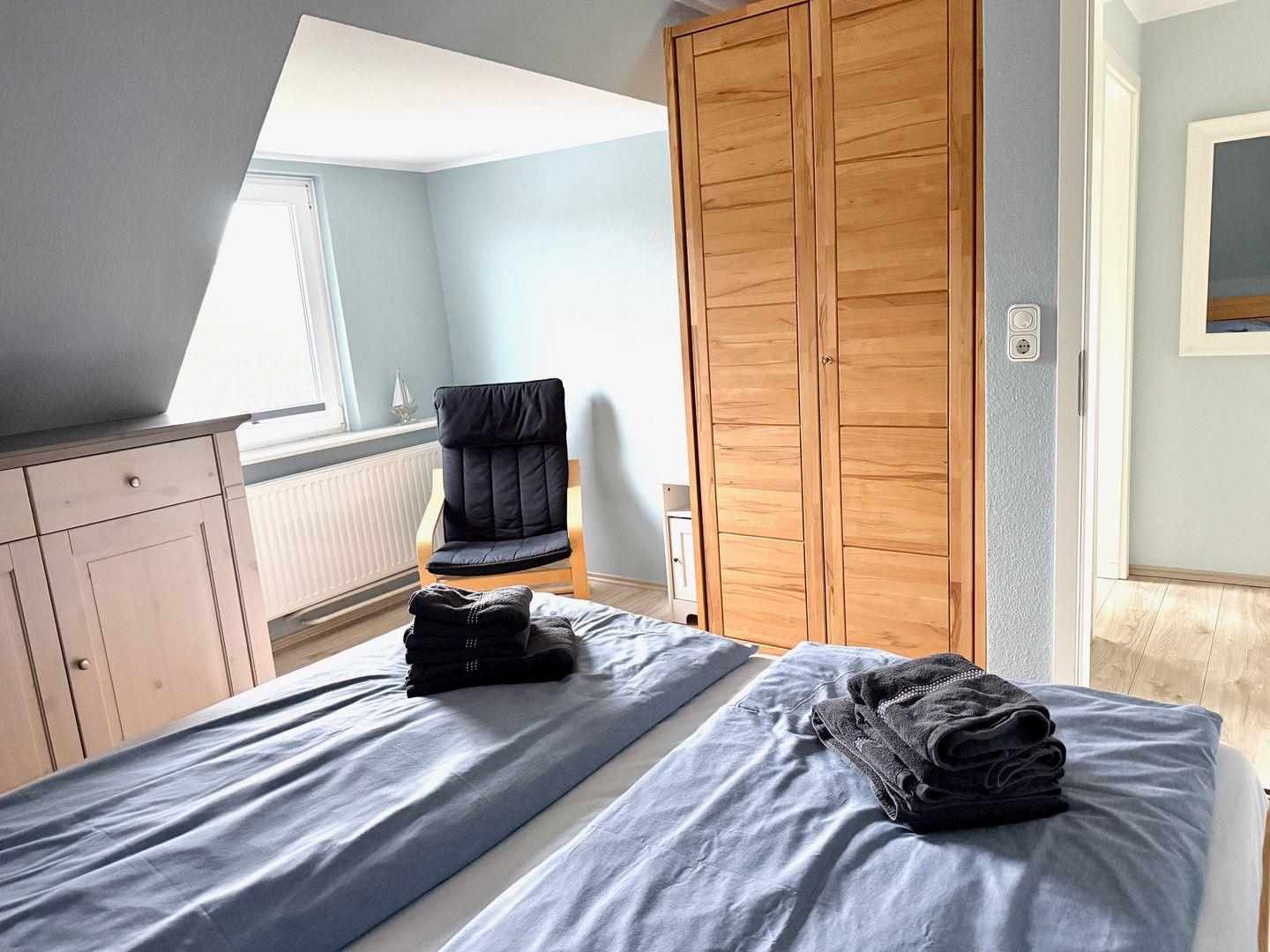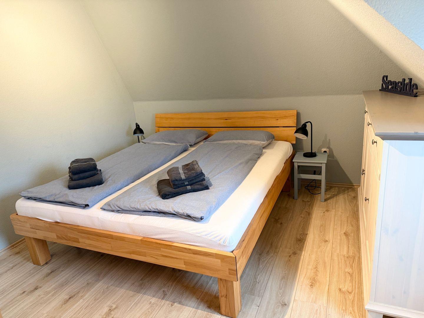 Im Obergeschoss befinden sich drei weitere Schlafzimmer mit Doppelbetten (1x 140x200 & 2x 180x200) und ein kleines Bad mit Toilette und Waschbecken.