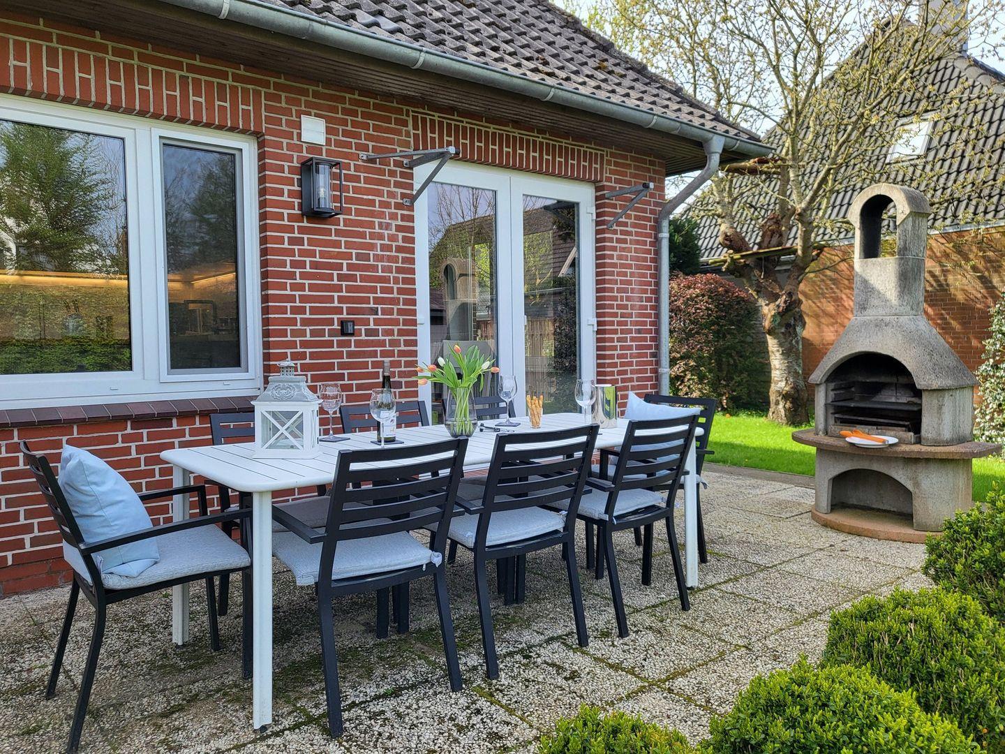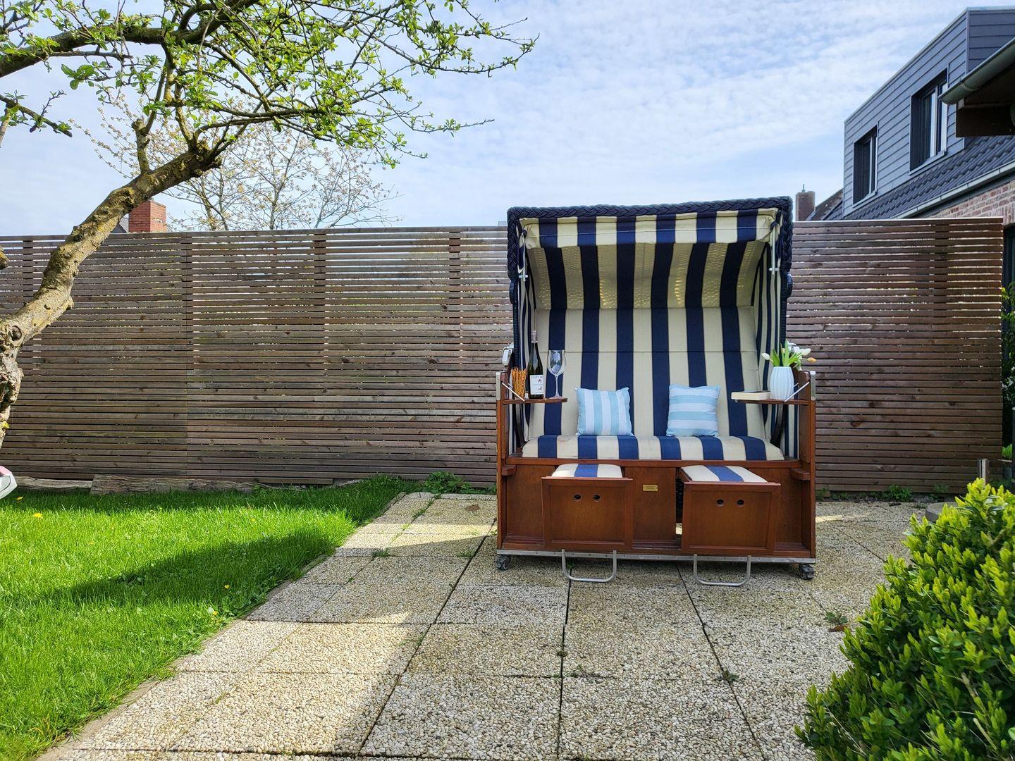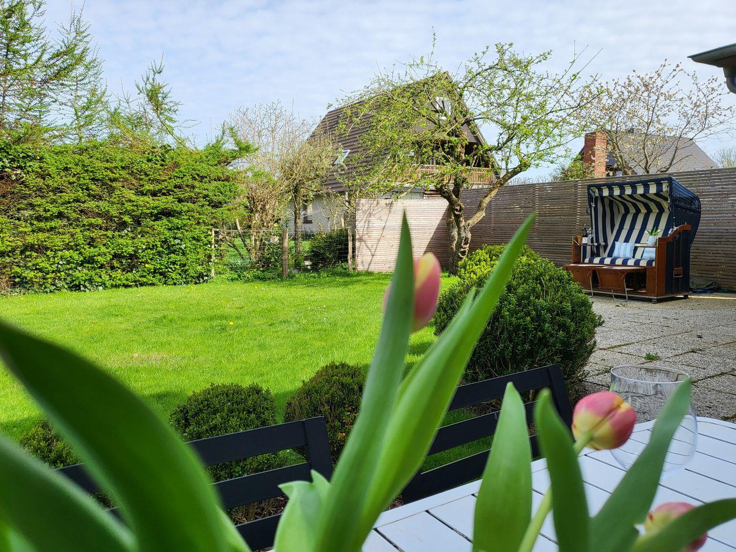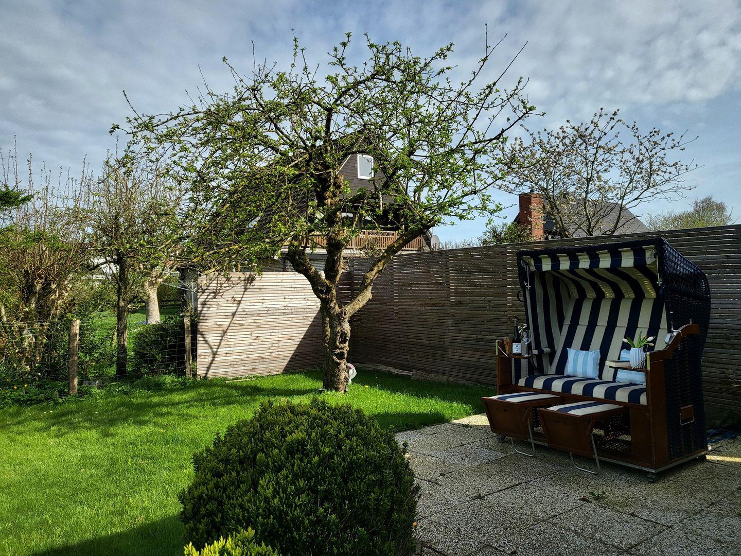 Zum Huuske Tating gehört außerdem ein uneinsehbarer Garten mit altem Baumbestand, Gartenmöbeln und Außenkamin.