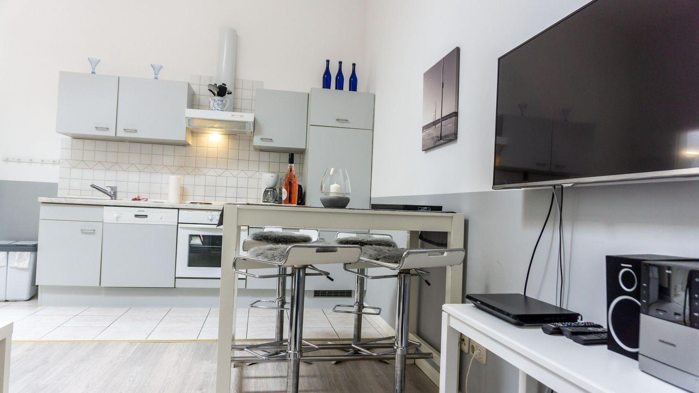 Die Unterkunft befindet sich im ersten Stock und verfügt über zwei geschmackvoll eingerichtete Schlafzimmer, die für erholsame Nächte sorgen. Der helle und einladende Wohnbereich ist offen gestaltet und harmonisch mit der Küche verbunden, wodurch eine angenehme Atmosphäre für gemeinsame Stunden entsteht. Die Ausstattung der Küche lässt keine Wünsche offen: von einem Herd mit Ceranfeld über einen Backofen, eine Spülmaschine bis hin zu einer Kaffeemaschine und einem Toaster – alles steht bereit, um kulinarische Köstlichkeiten zuzubereiten. Ein Hochtisch für angenehme Mahlzeiten sowie eine gemütliche Sofaecke tragen zu einem angenehmen Wohngefühl bei.