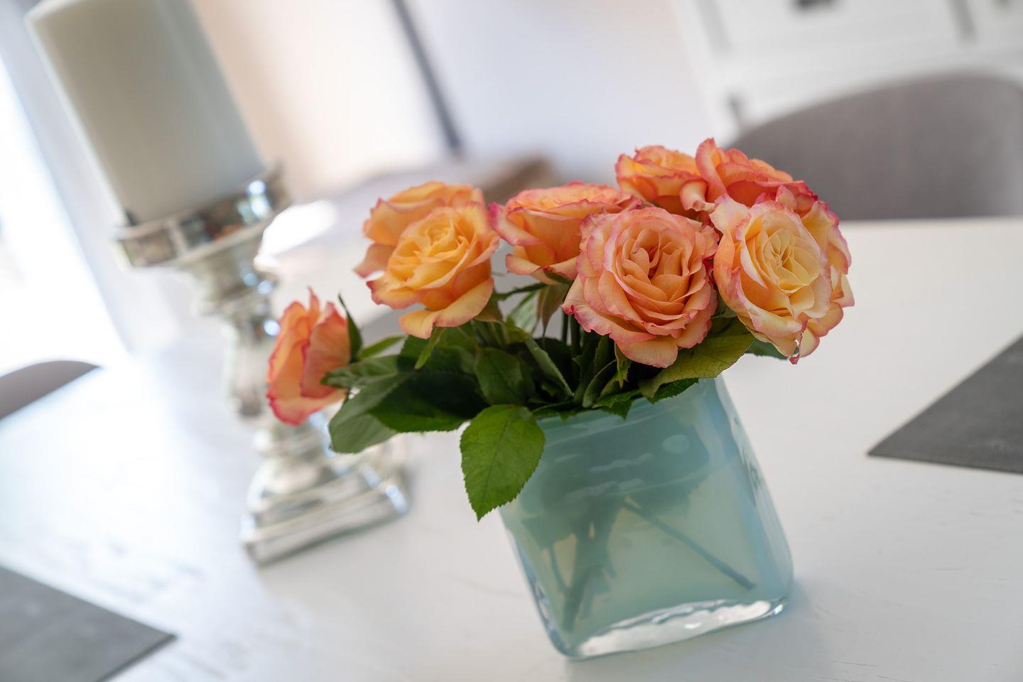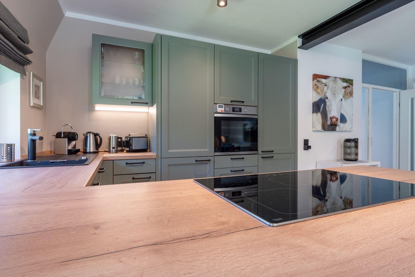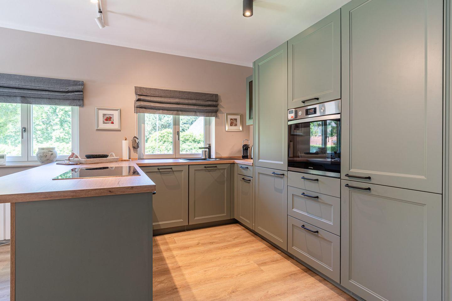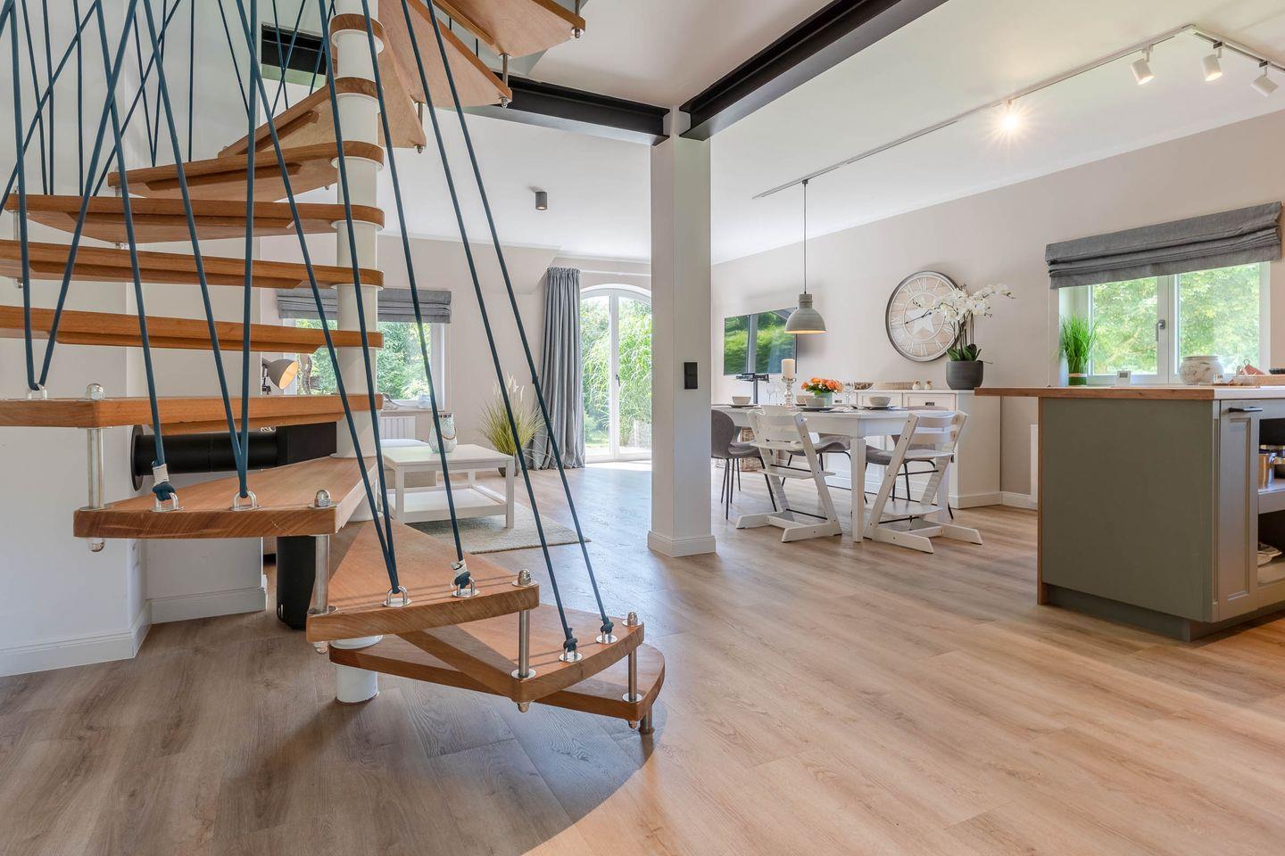 Die moderne, voll ausgestattete Wohnküche mit Kochinsel, hochwertigem Mobiliar und großzügigem Esstisch lässt keine Wünsche offen. Ein separates Gäste-WC rundet das Erdgeschoss ab.