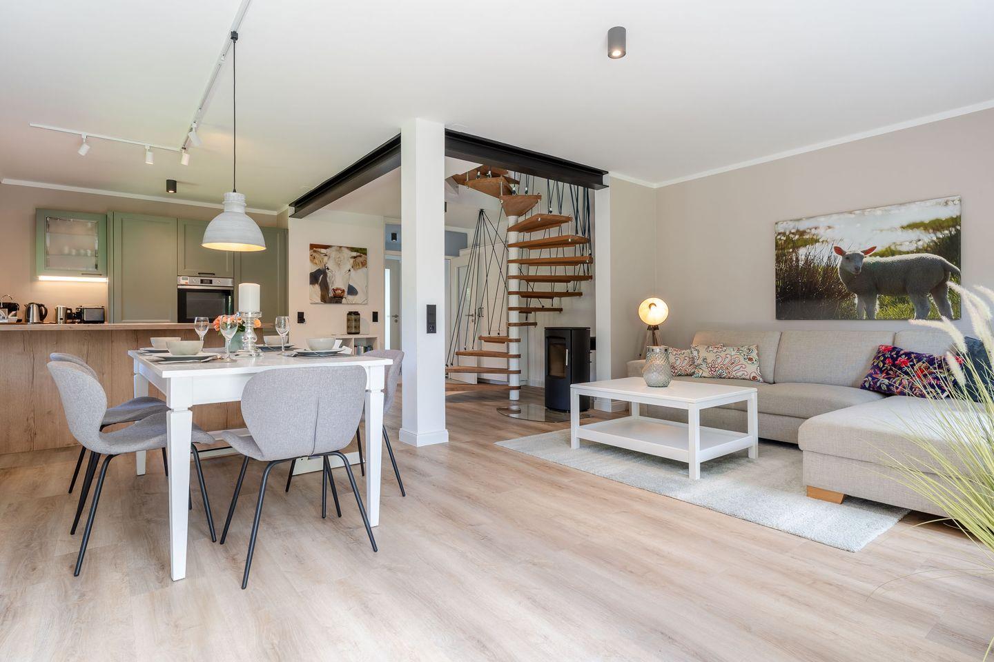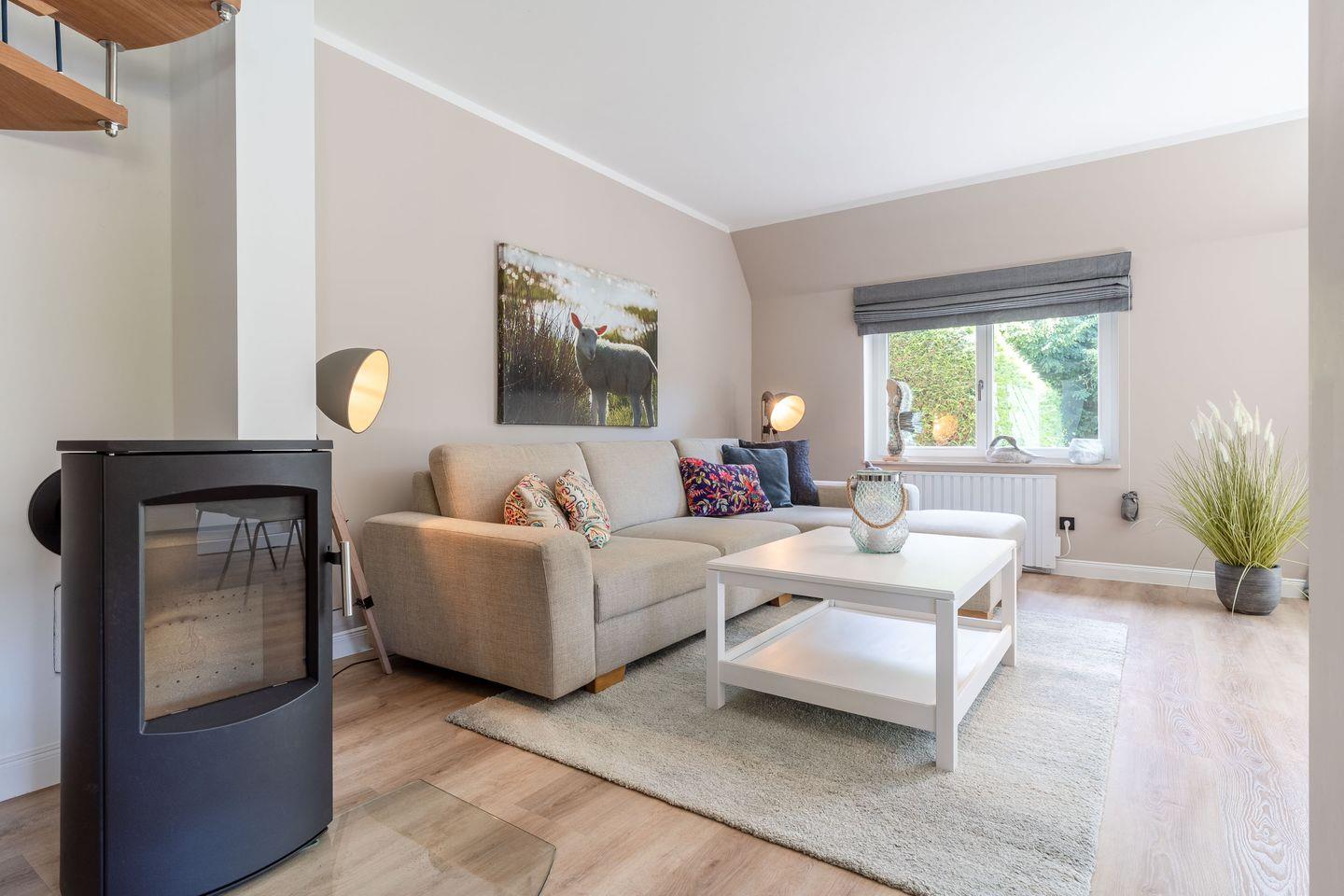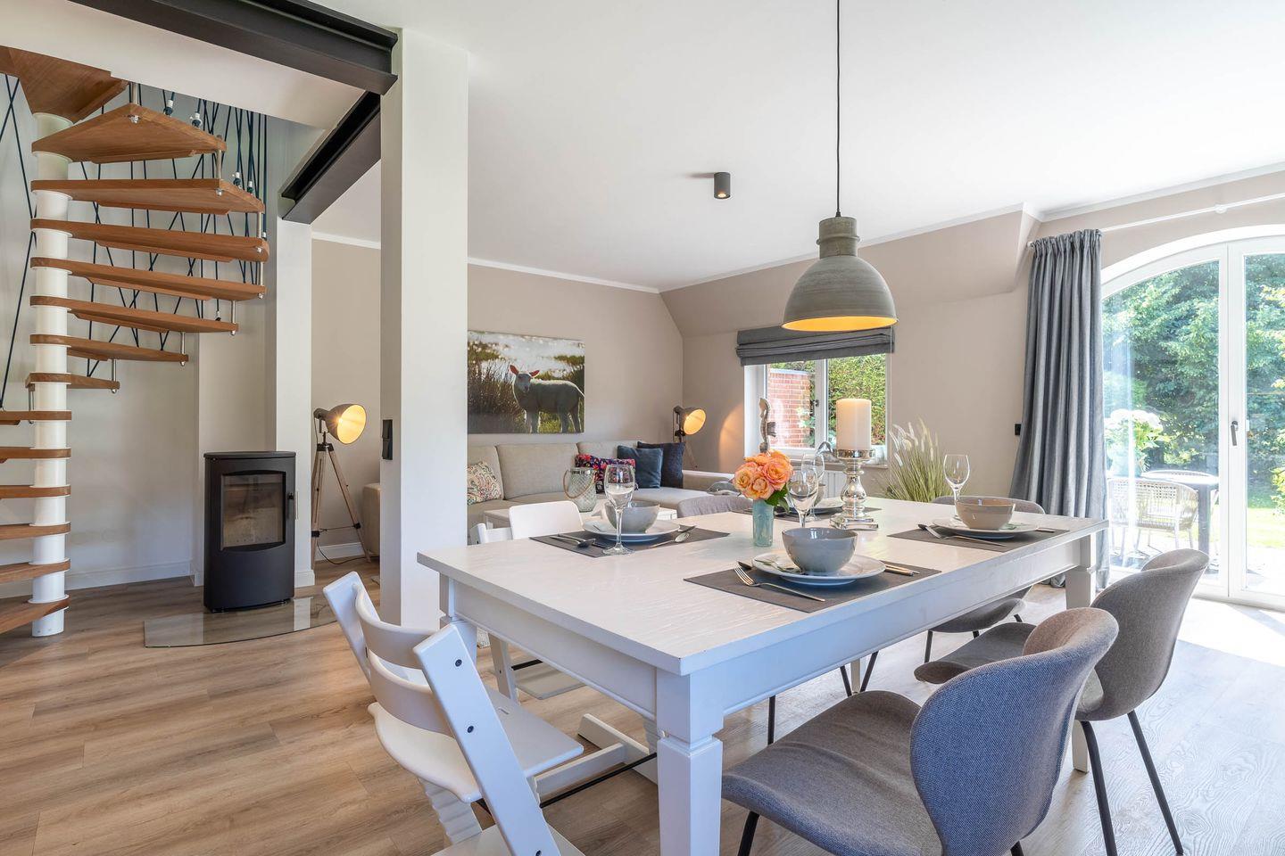 Auf rund 95 Quadratmetern Wohnfläche bietet der Mini-Haubarg großzügig Platz für bis zu 4 Personen – ideal für Familien, Paare oder Freunde, die das Besondere suchen. Im großzügigen Wohn- und Essbereich sorgt ein hochwertiger Heizkamin für gemütliche Abende. Von hier aus gelangen Sie direkt auf die Sonnenterrasse mit Blick in den eingewachsenen Privatgarten, eingefasst von Friesenwall und blühenden Buschrosen – ein echtes Idyll.