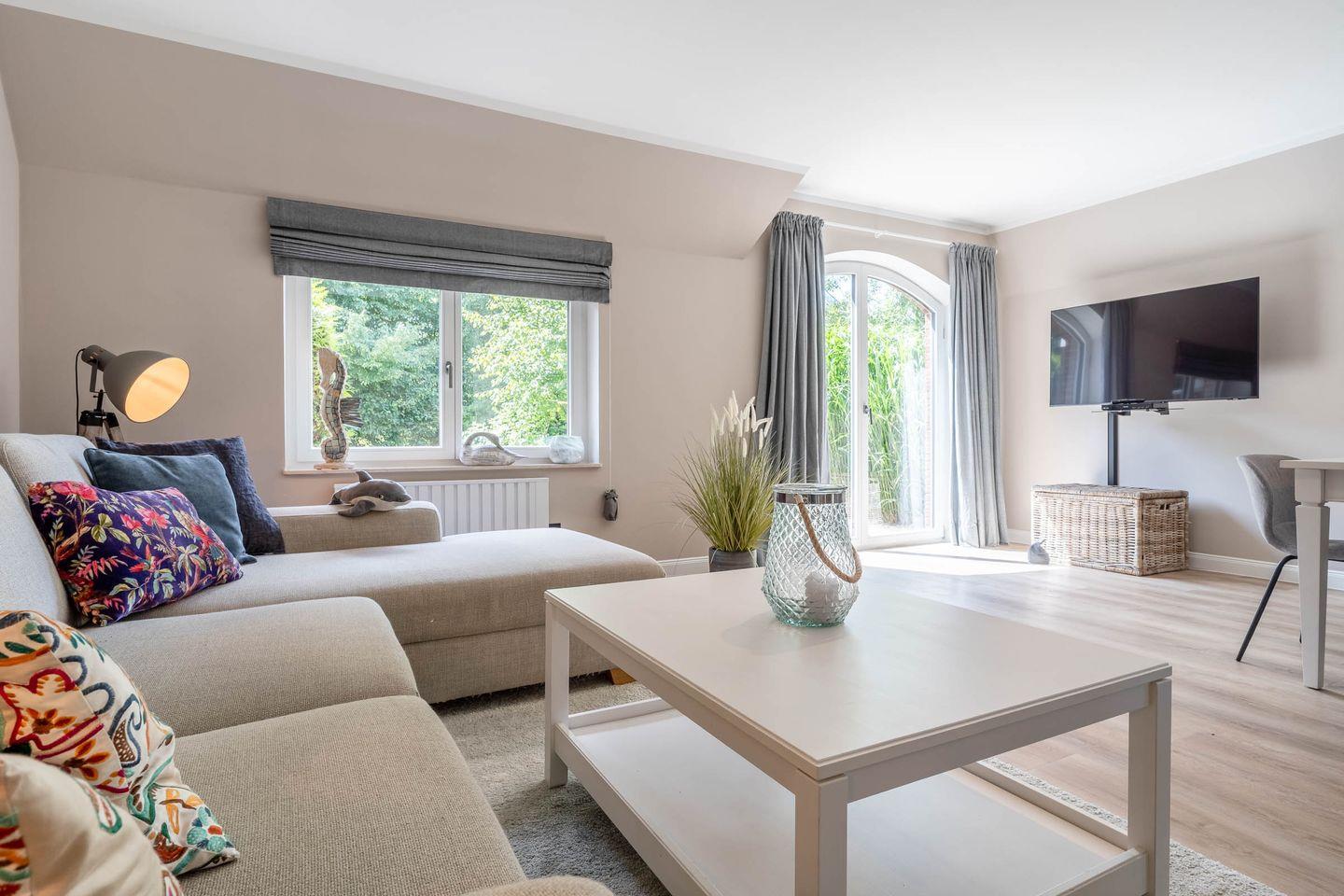 Großes Wohn-/Esszimmer mit Kamin und Terrasse im eigenen Garten, 2 Schlafzimmer (1x Doppelbett, 1x 2 Einzelbetten), modernes Duschbad + Gäste-WC, hochwertige Küche mit Kochinsel, Wasch-Trockner, WLAN, TV.