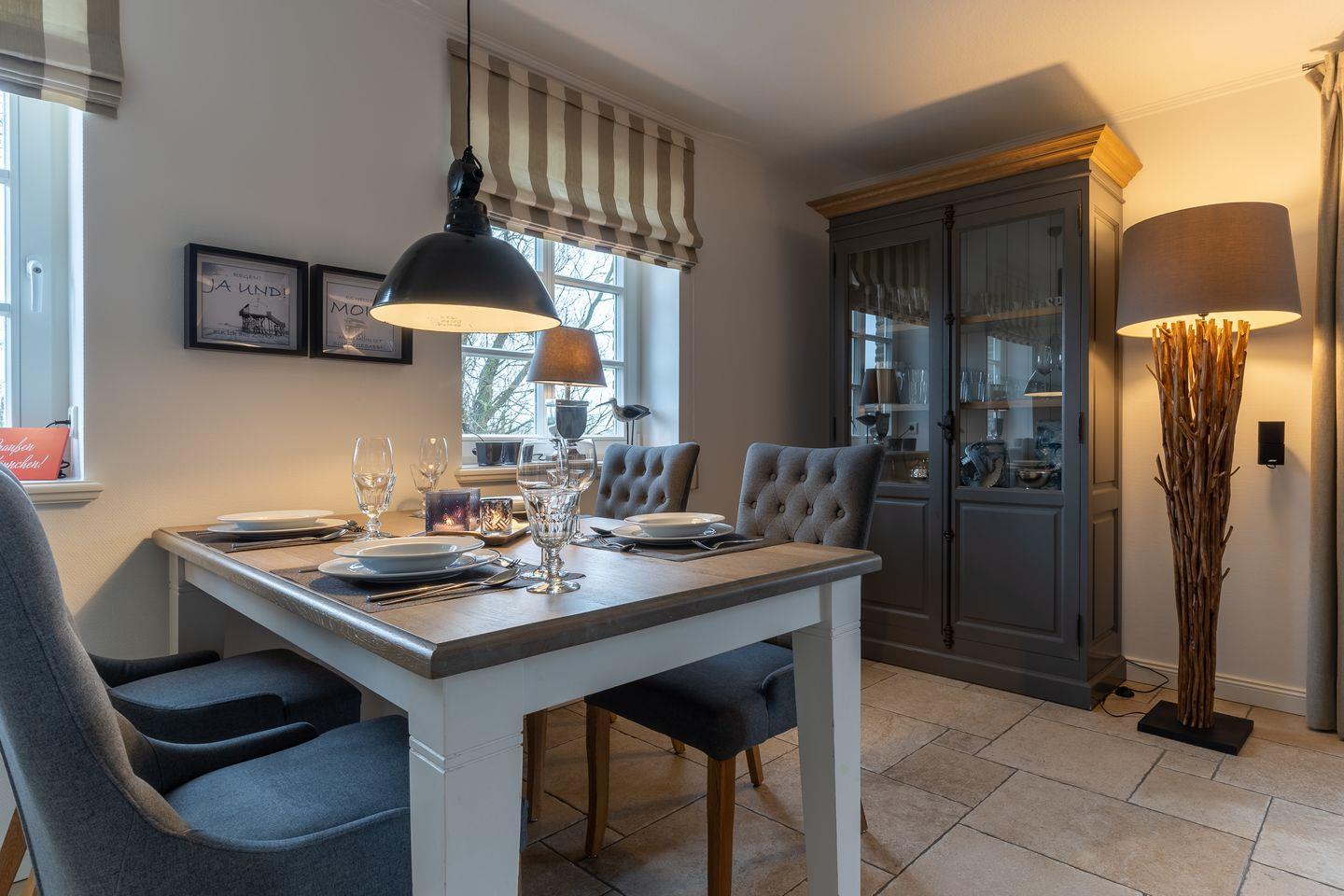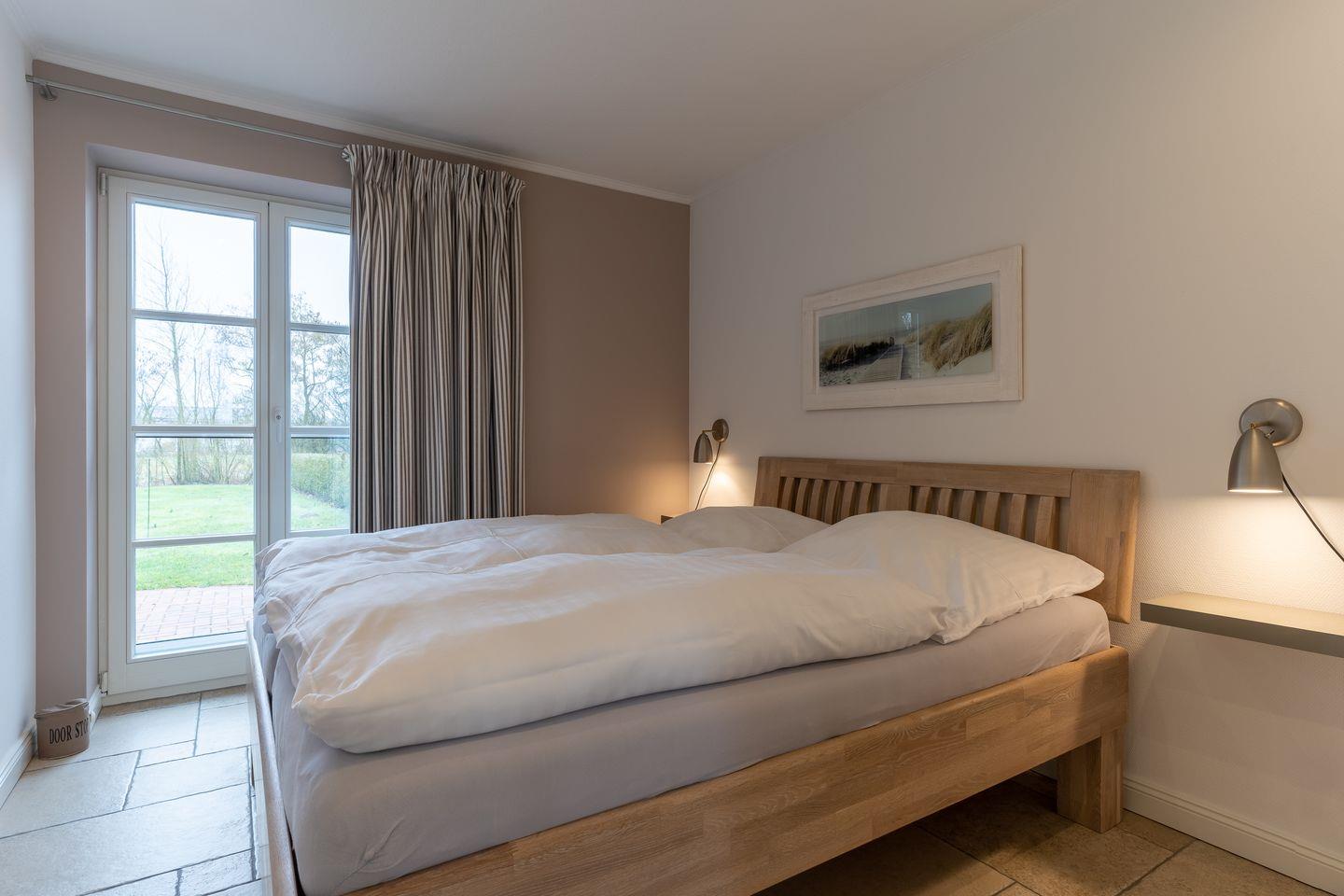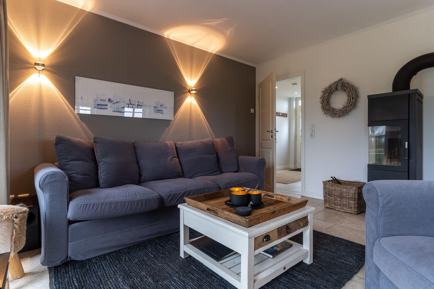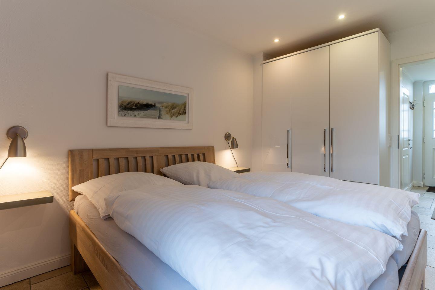 Eine Haushälfte unter Reet, ca. 100 m² Wohnfläche auf 2 Ebenen, auf großzügigem Grundstück mit ca. 1.200 m² und Terrasse. Im EG befinden sich ein Duschbad mit barrierefreier Dusche und WC, ein Schlafzimmer mit einem 1,60 x 2 m Doppelbett, das gemütliche Wohn/Esszimmer mit Kaminofen, offener, hochwertiger Küche sowie einem Wirtschaftsraum mit Waschmaschine. Im OG befinden sich das großzügige Elternschlafzimmer mit Boxspringbett 1,80 x 2 m und einem Einbauschrank, ein Kinderzimmer mit zwei Einzelbetten 1 x 2 m plus Einbauschrank sowie einem Duschbad mit Komfortdusche, Doppelwaschbecken und Handtuchheizung und WC. Im gesamten Haus liegt eine Fußbodenheizung, im EG unter Fliesen im OG unter weiß gekalkten Eichendielen.