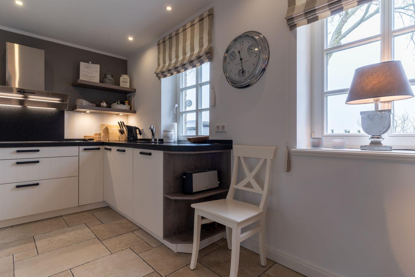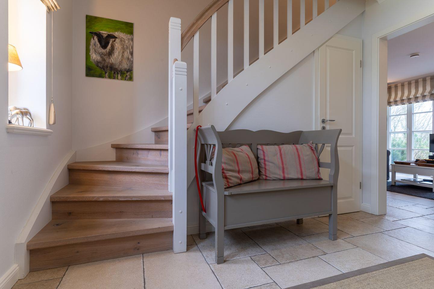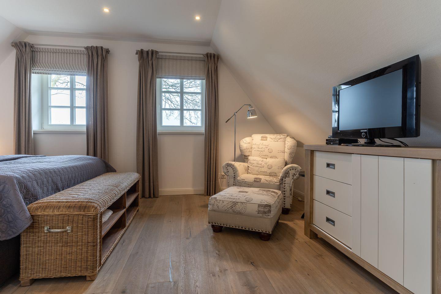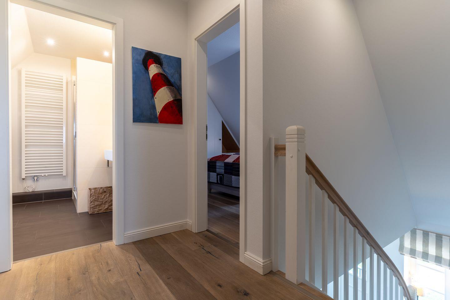 Eine Haushälfte unter Reet, ca. 100 m² Wohnfläche auf 2 Ebenen, auf großzügigem Grundstück mit ca. 1.200 m² und Terrasse. Im EG befinden sich ein Duschbad mit barrierefreier Dusche und WC, ein Schlafzimmer mit einem 1,60 x 2 m Doppelbett, das gemütliche Wohn/Esszimmer mit Kaminofen, offener, hochwertiger Küche sowie einem Wirtschaftsraum mit Waschmaschine. Im OG befinden sich das großzügige Elternschlafzimmer mit Boxspringbett 1,80 x 2 m und einem Einbauschrank, ein Kinderzimmer mit zwei Einzelbetten 1 x 2 m plus Einbauschrank sowie einem Duschbad mit Komfortdusche, Doppelwaschbecken und Handtuchheizung und WC. Im gesamten Haus liegt eine Fußbodenheizung, im EG unter Fliesen im OG unter weiß gekalkten Eichendielen.