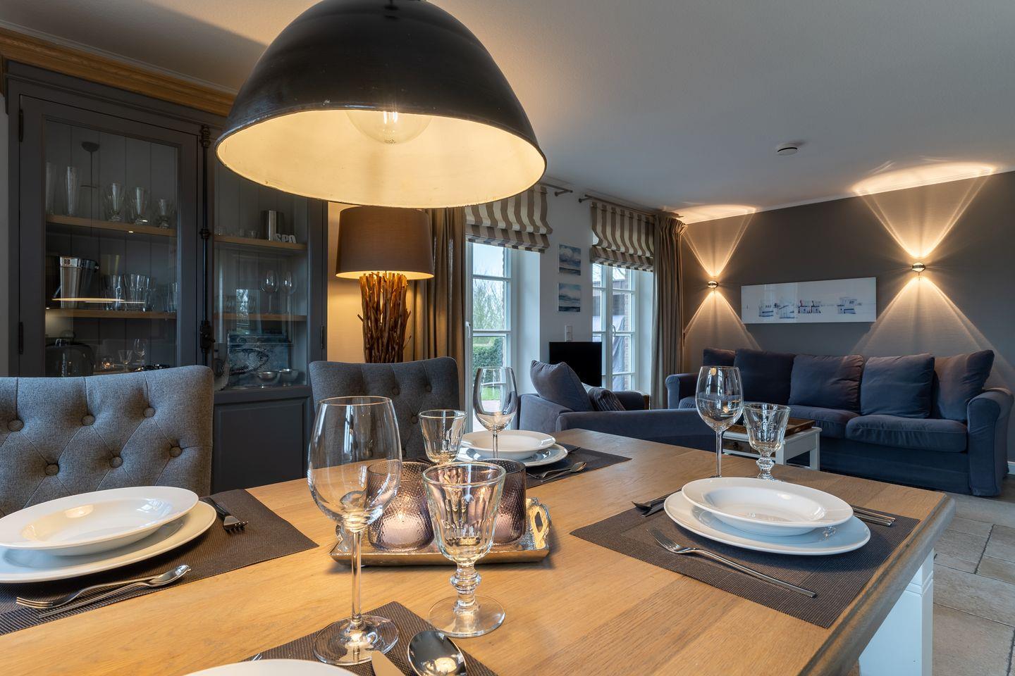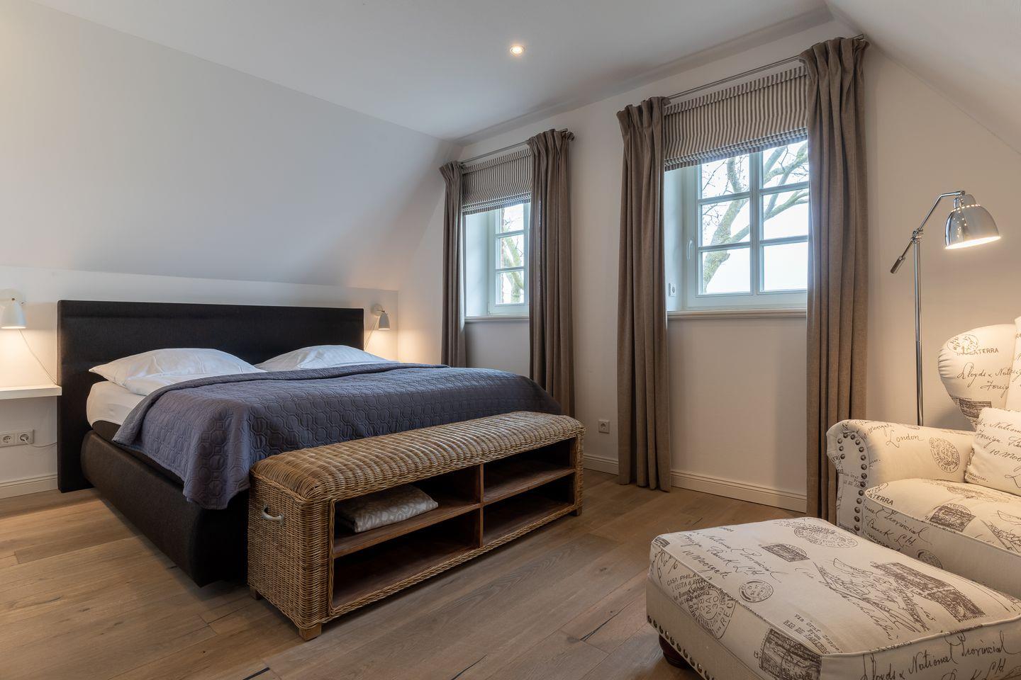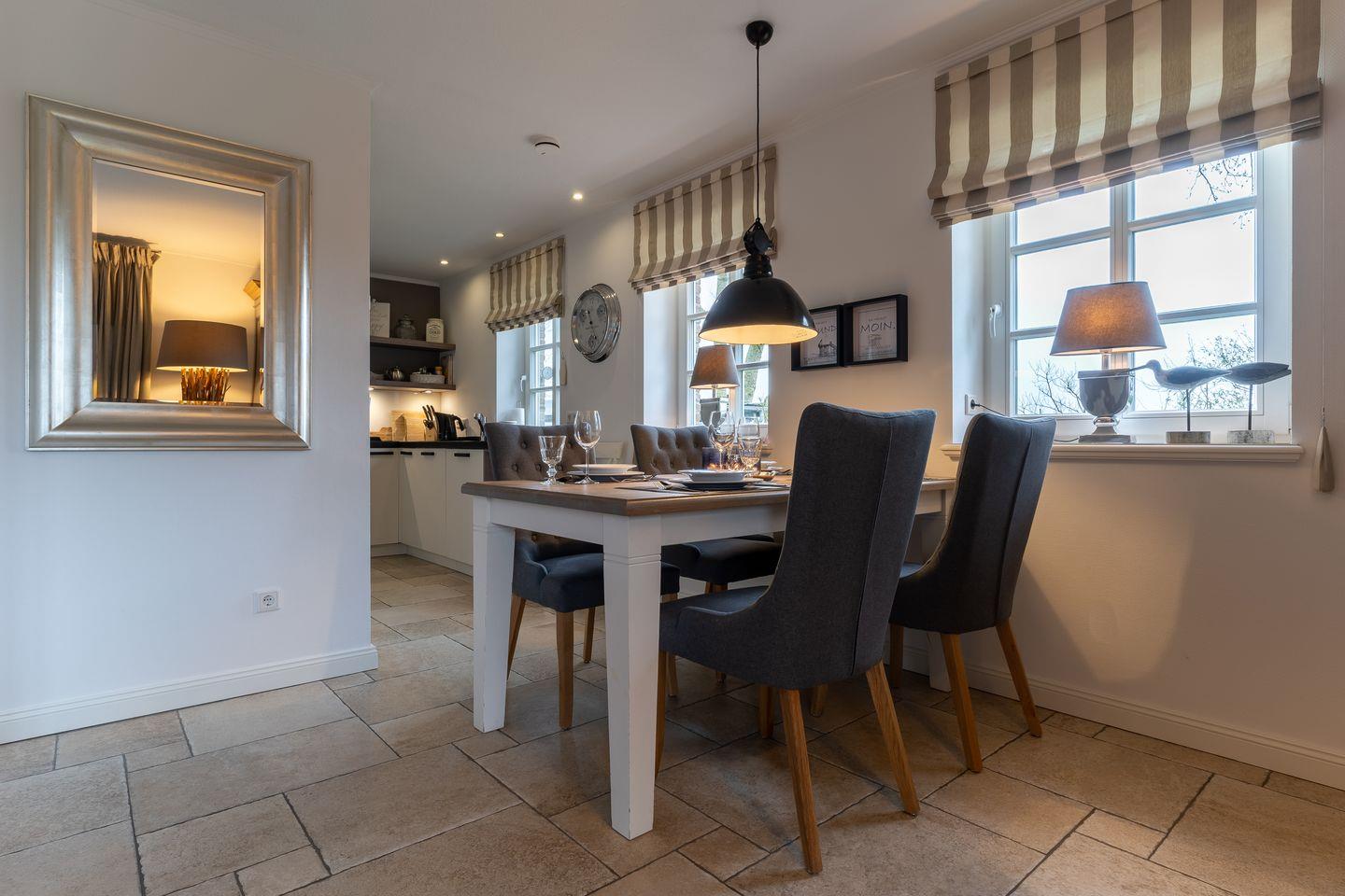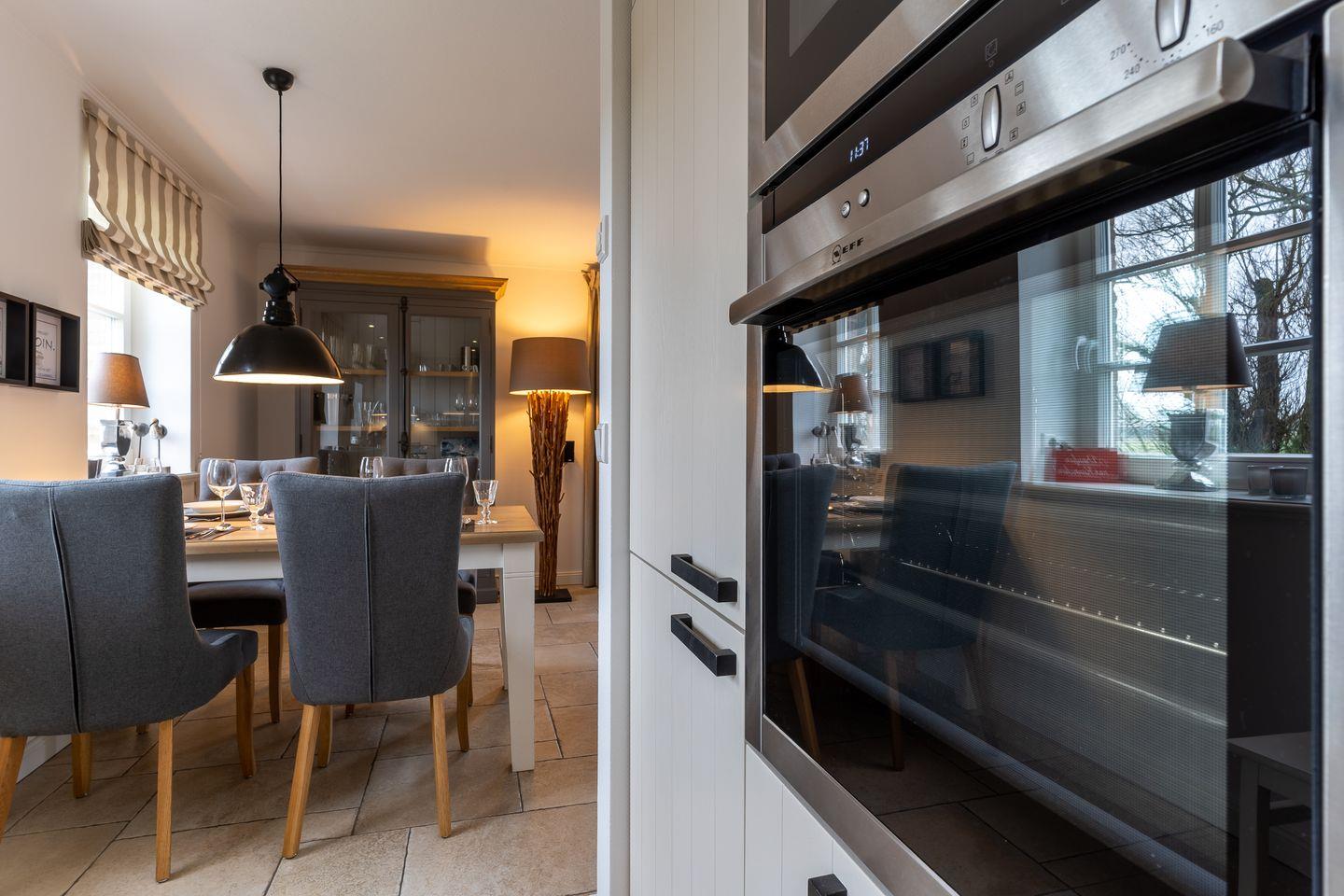 Eine Haushälfte unter Reet, ca. 100 m² Wohnfläche auf 2 Ebenen, auf großzügigem Grundstück mit ca. 1.200 m² und Terrasse. Im EG befinden sich ein Duschbad mit barrierefreier Dusche und WC, ein Schlafzimmer mit einem 1,60 x 2 m Doppelbett, das gemütliche Wohn/Esszimmer mit Kaminofen, offener, hochwertiger Küche sowie einem Wirtschaftsraum mit Waschmaschine. Im OG befinden sich das großzügige Elternschlafzimmer mit Boxspringbett 1,80 x 2 m und einem Einbauschrank, ein Kinderzimmer mit zwei Einzelbetten 1 x 2 m plus Einbauschrank sowie einem Duschbad mit Komfortdusche, Doppelwaschbecken und Handtuchheizung und WC. Im gesamten Haus liegt eine Fußbodenheizung, im EG unter Fliesen im OG unter weiß gekalkten Eichendielen.