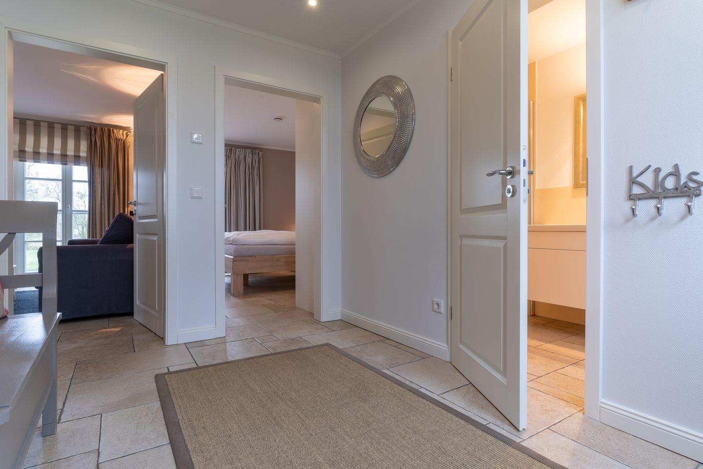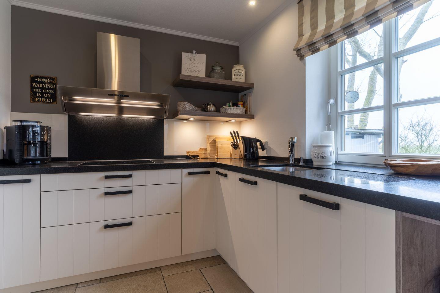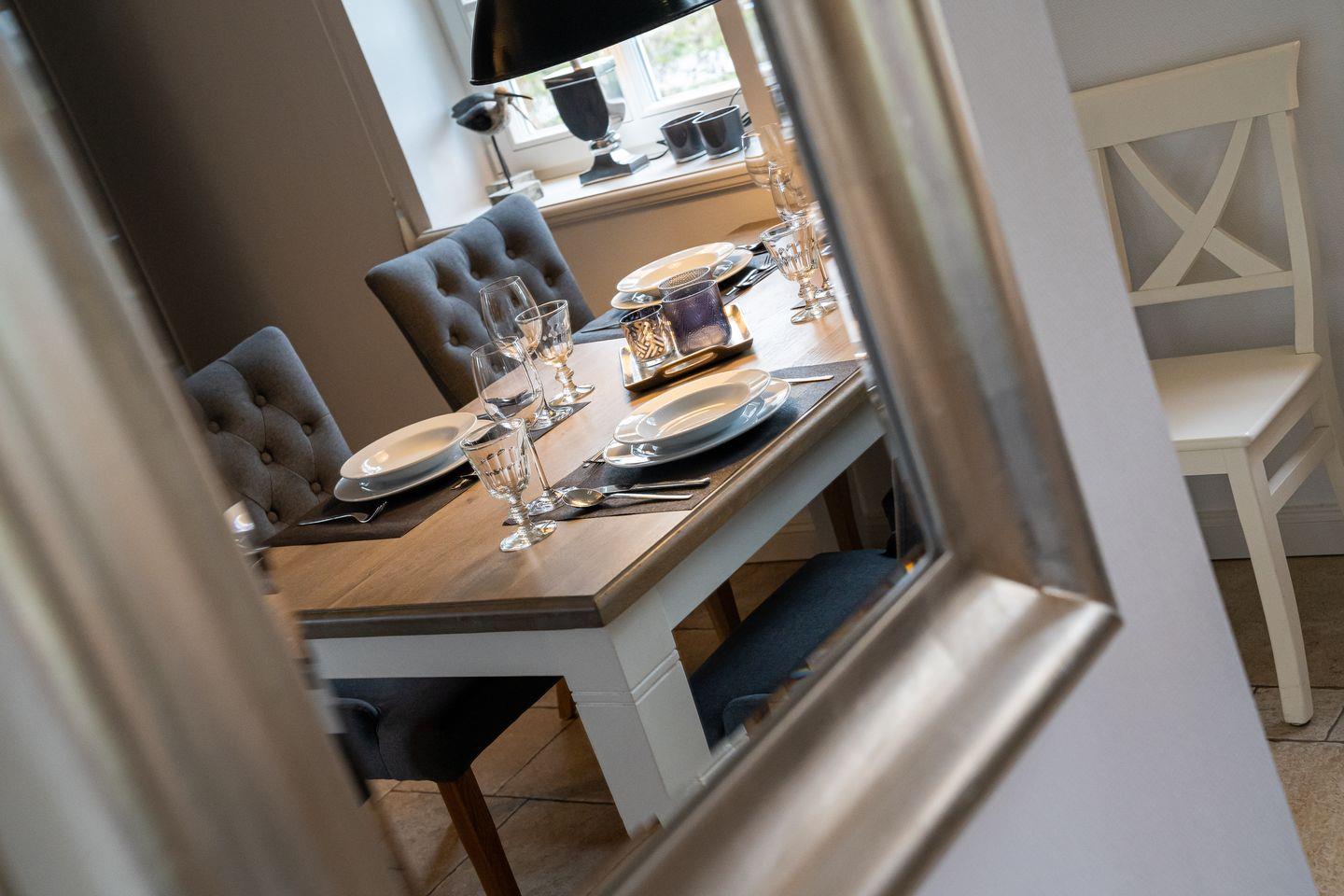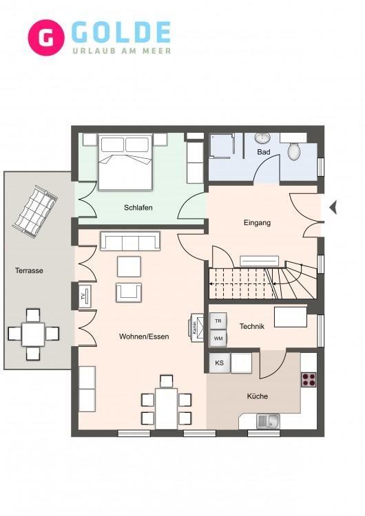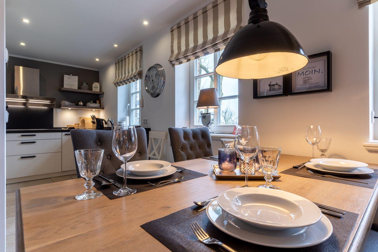Eine Haushälfte unter Reet, ca. 100 m² Wohnfläche auf 2 Ebenen, auf großzügigem Grundstück mit ca. 1.200 m² und Terrasse. Im EG befinden sich ein Duschbad mit barrierefreier Dusche und WC, ein Schlafzimmer mit einem 1,60 x 2 m Doppelbett, das gemütliche Wohn/Esszimmer mit Kaminofen, offener, hochwertiger Küche sowie einem Wirtschaftsraum mit Waschmaschine. Im OG befinden sich das großzügige Elternschlafzimmer mit Boxspringbett 1,80 x 2 m und einem Einbauschrank, ein Kinderzimmer mit zwei Einzelbetten 1 x 2 m plus Einbauschrank sowie einem Duschbad mit Komfortdusche, Doppelwaschbecken und Handtuchheizung und WC. Im gesamten Haus liegt eine Fußbodenheizung, im EG unter Fliesen im OG unter weiß gekalkten Eichendielen.