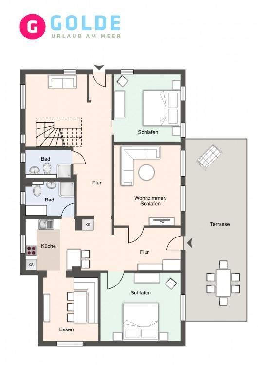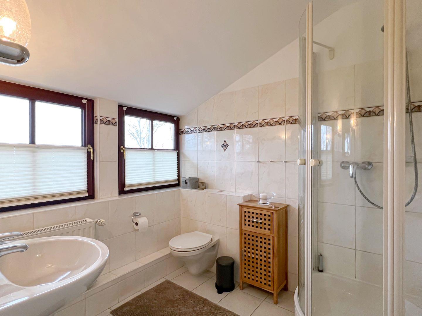 Sie betreten das Haus durch eine schöne Landhaustür und gelangen über einen stilvoll eingerichteten Flur direkt in die Küche, wo sich eine gemütliche und einladende Essecke befindet. Hier können Sie nach dem gemeinsamen Kochen die Abende genießen. Im Erdgeschoss haben Sie 2 Doppelschlafzimmer, 1 Wohn-Schlafraum sowie 2 Bäder. Aus dem zweiten weiträumigen Flur gelangen Sie in das Obergeschoss - direkt in den Wohnbereich mit traumhaftem Blick über die Felder. Hier grenzt ein weiteres großzügiges Doppelschlafzimmer mit separatem Duschbad an. Dieses wundervolle Chalet bietet Ihnen hinreichend Platz zum Urlauben. Die große Terrasse mit Strandkorb, Gartenmöbeln und Liegen bietet Ihnen beste Sonnenauslastung. Der große Garten lädt die Kleinen und Großen zum Spielen ein.