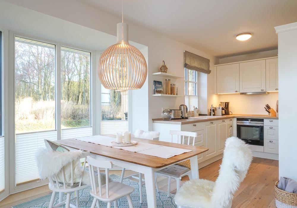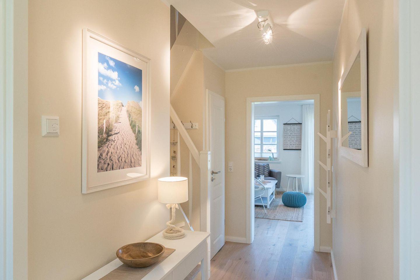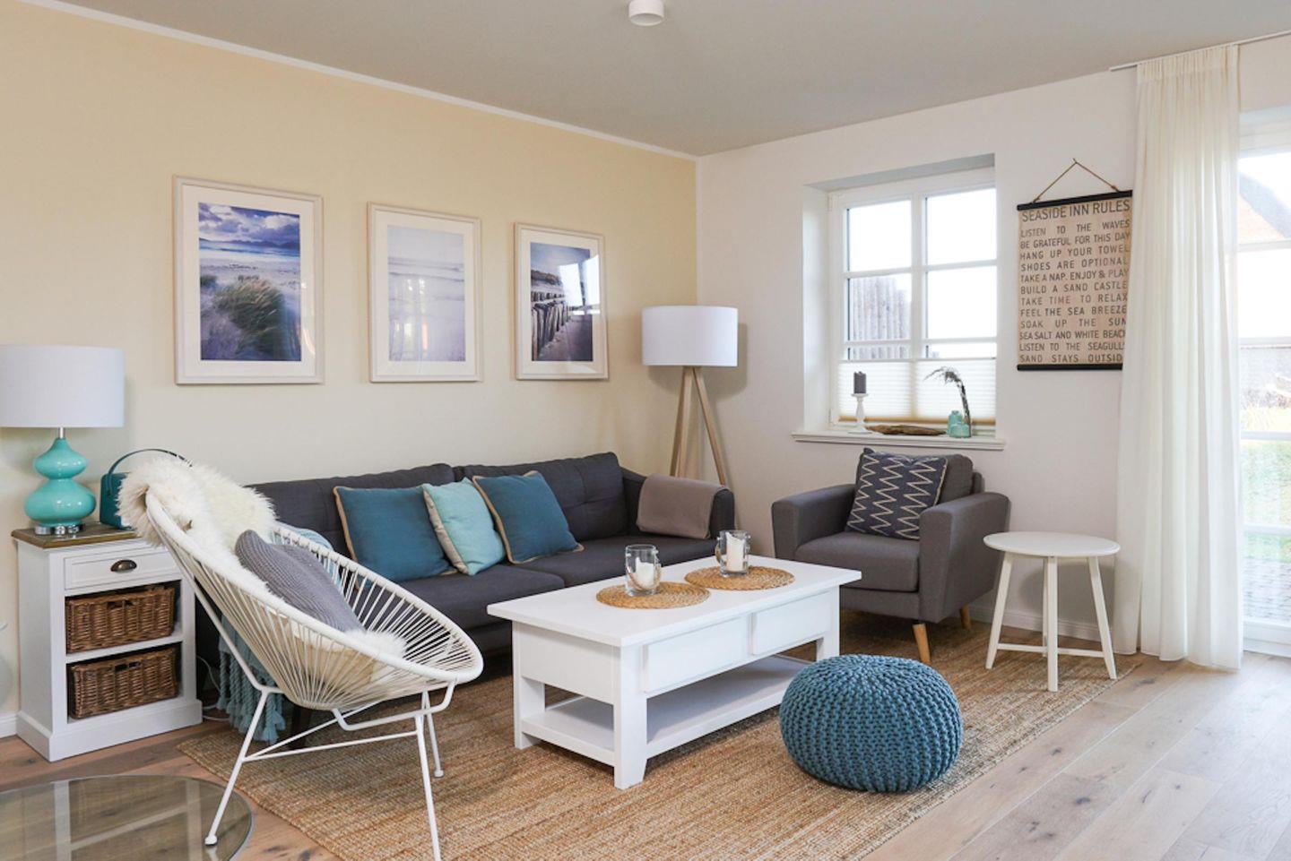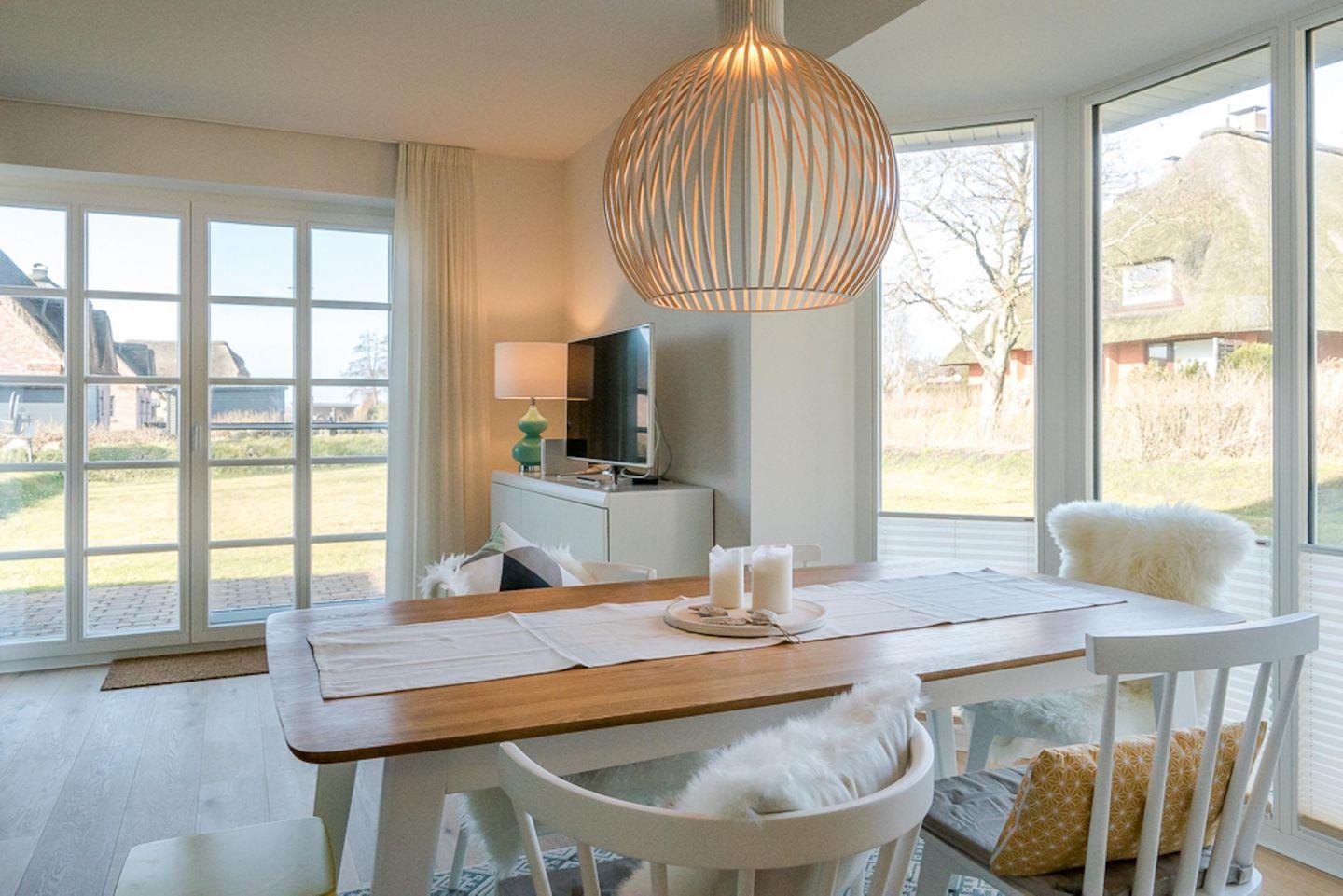 Im Erdgeschoss befindet sich der lichtdurchflutete Wohnraum mit TV, Apple TV, kleine Musikanlage mit Dockingstation für iPhone, Kaminofen, einer offenen Küche sowie einem stilvollen hellen Essbereich mit Blick auf die Düne. Die Wohnräume sind mit exklusiven Möbeln ausgestattet. Die Küche verfügt über hochwertige Elektrogeräte und lässt von der Nespressomaschine über ein Waffeleisen bis zur Salatschleuder keinen Wunsch offen. An den Wohnbereich schließen sich ein Flur mit eingebauter Garderobe, ein Hauswirtschaftsraum mit Waschmaschine und Trockner und ein Duschbad an. Das gesamte Erdgeschoss verfügt über ein hochwertiges weiß gekalktes Eichenparkett, welches über Fußbodenheizung beheizt werden kann.