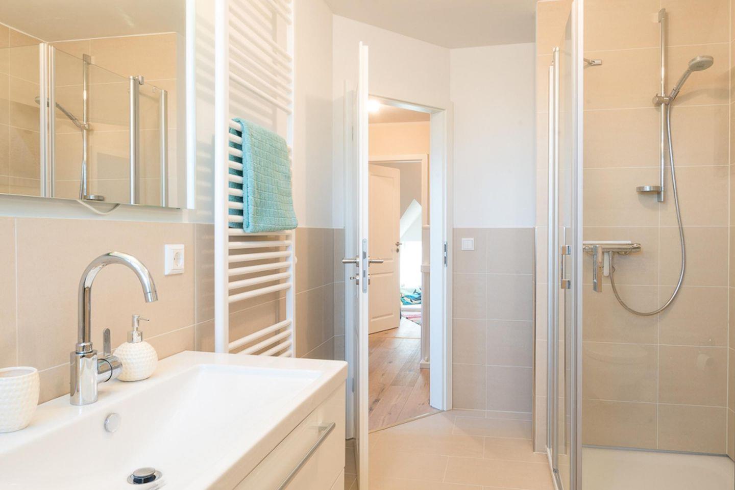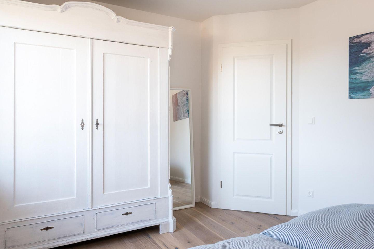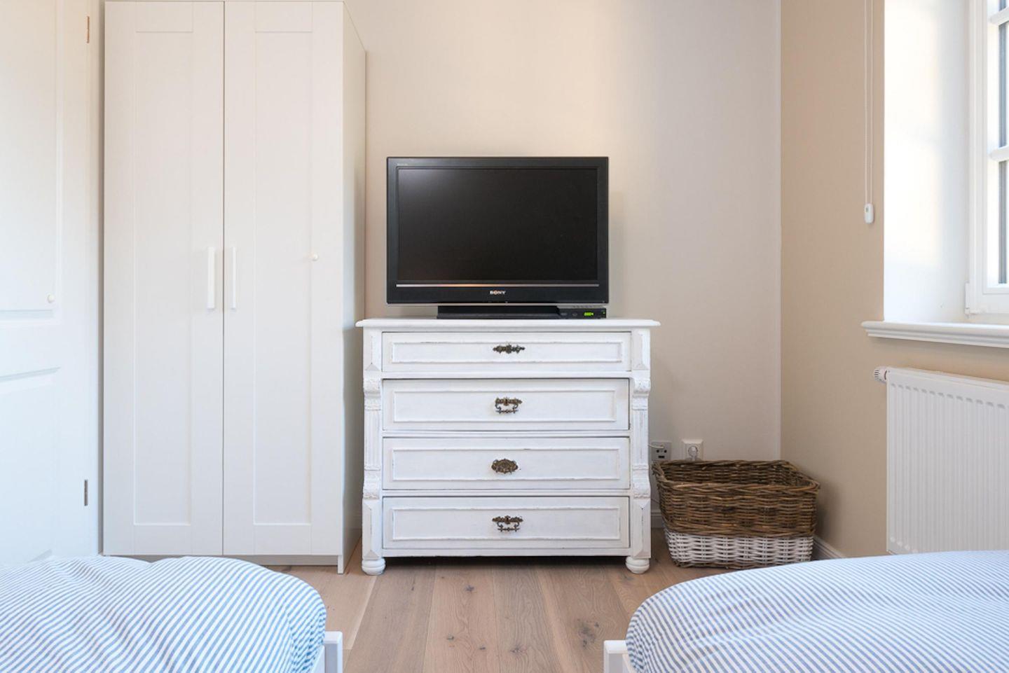 Über eine schöne weiße Holztreppe gelangt man in das mit Parkett ausgelegte Obergeschoss. Hier befinden sich ein Schlafzimmer mit einem Doppelbett (180 x 200cm), ein Schlafzimmer mit 2 Einzelbetten (je 90 x 200cm) und TV. Außerdem ist im Obergeschoss eine Kuschelkoje mit einem Einzelbett (90 x 200cm) vorhanden zum Zurückziehen oder Spielen. Alle Schlafzimmer verfügen über ein Verdunkelungsrollo und sehr gut getestete Matratzen für einen angenehmen gesunden Schlaf. Schränke gewähren Ihnen hinreichend Ablageflächen. Darüber hinaus befindet sich im Obergeschoss ein weiteres, geräumiges Bad mit Dusche. Auch für die kleinen Gäste ist gesorgt: Es gibt Spielzeug, ein Reisebett, einen Kinderhochstuhl, Kindernachtleuchten, einen Kinderhocker im Bad und einen Kinder-WC-Sitz.