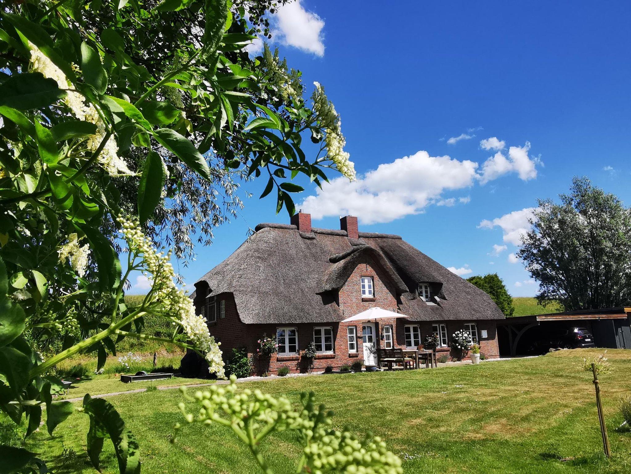 Erleben Sie erholsamen Nordseeurlaub in einer gemütlichen Reetkate mit herrlichem Blick auf Wiesen und Felder.