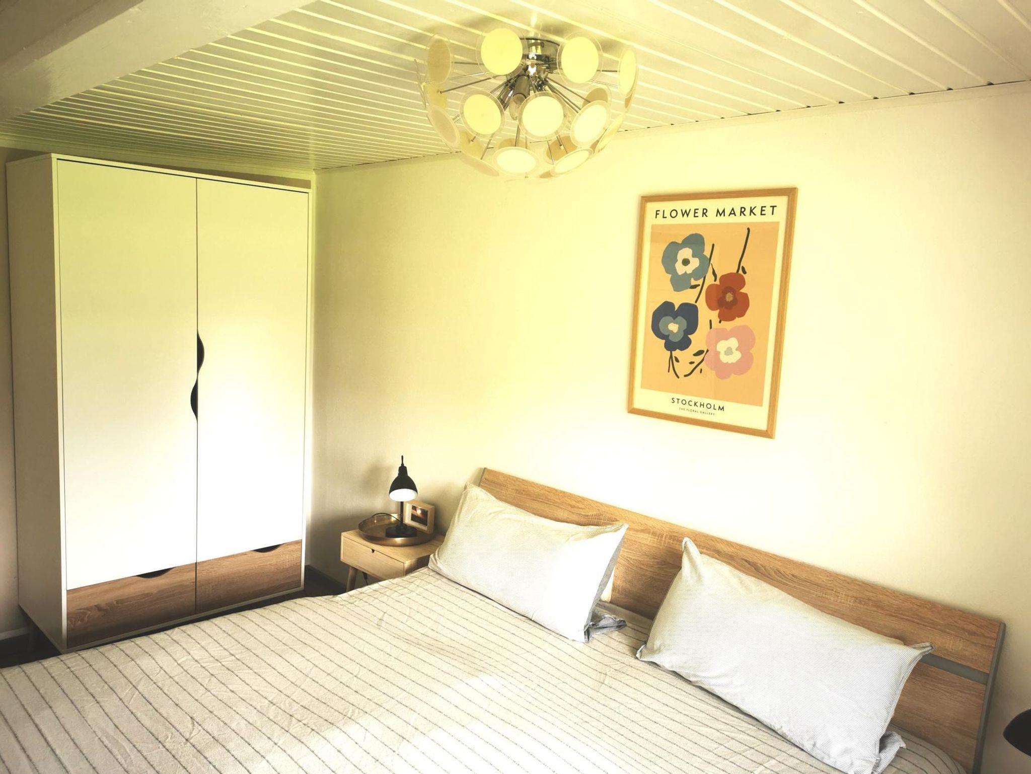 Der helle Schlafraum verfügt über ein komfortables Doppelbett und viel Stauraum für Ihre Urlaubsgarderobe.