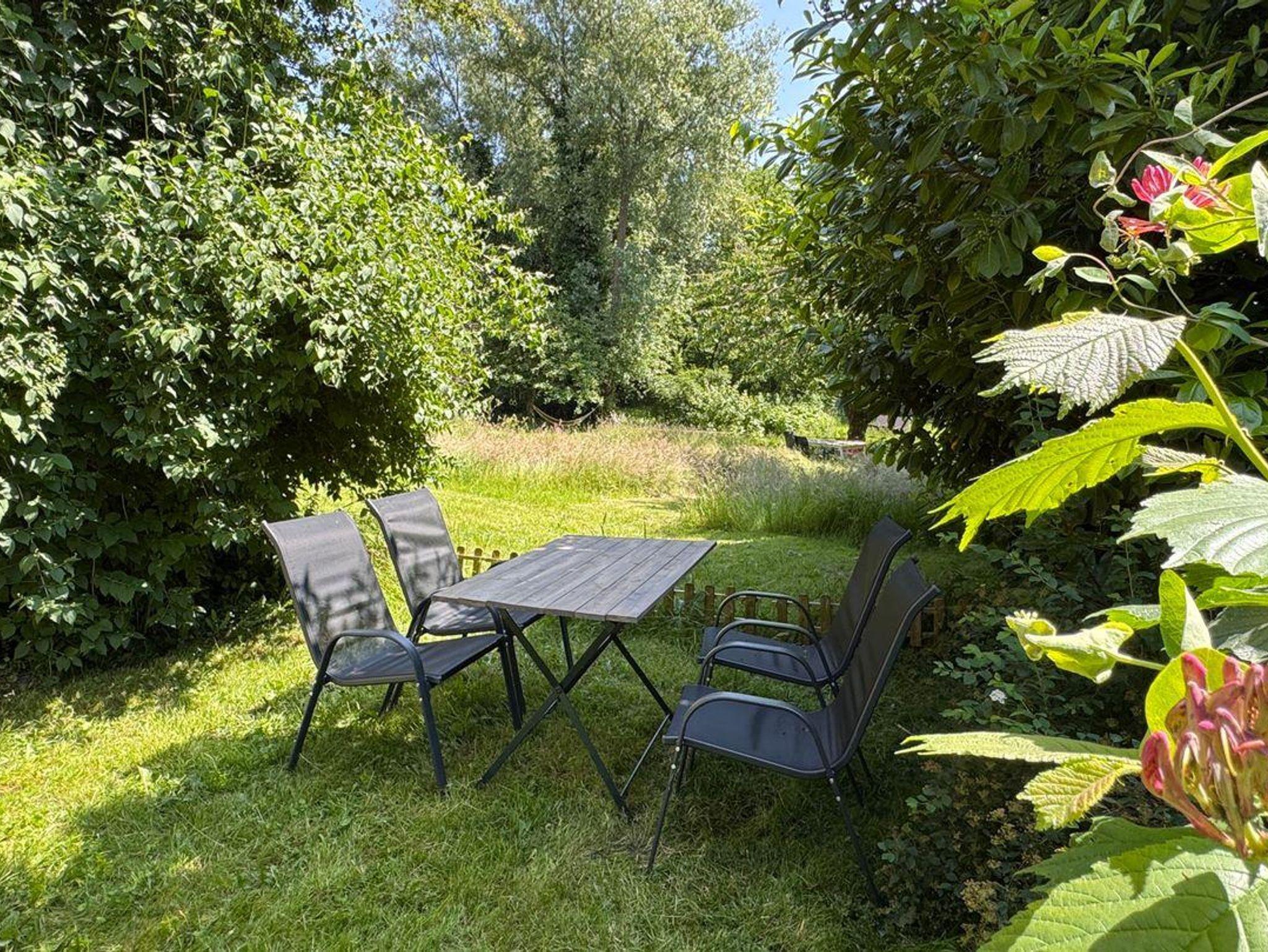 Gartenstühle und ein Gartentisch stehen bereit um flexibel versetzt zu werden.