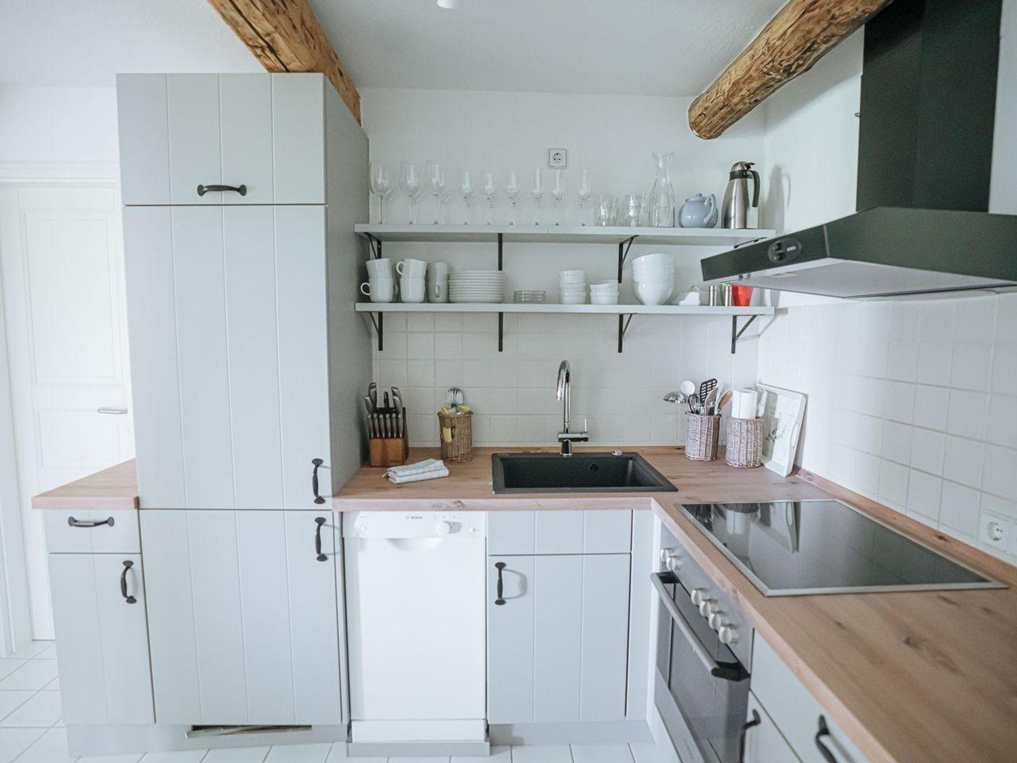 Die Küche ist zum Wohnzimmer offen gestaltet, voll ausgestattet und somit ist eine komplette Selbstversorgung möglich. Cerankochfeld, Backofen, Kühlschrank mit Gefrierfach, Spülmaschine, Kaffeemaschine , Wasserkocher, Toaster, Mixer und Küchenutensilien. Das Badezimmer verfügt über eine bodengleiche Dusche, WC, Waschbecken, Spiegel und Haartrockner.