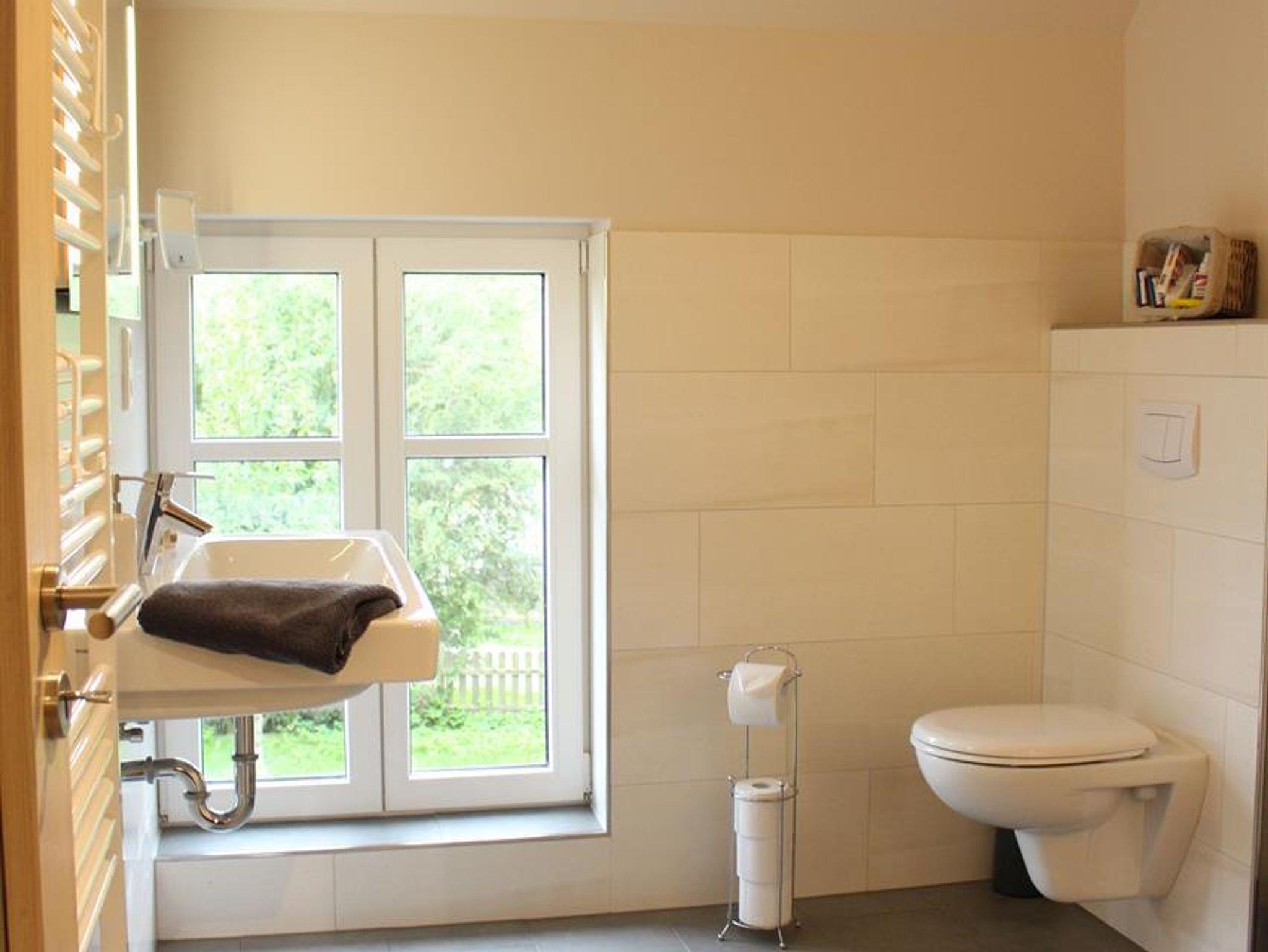 Am Morgen erwartet Sie das Tageslichtbad mit großem Waschbecken, einem modernen Duschbereich und einem weiten Blick über die Wiesen und Felder.