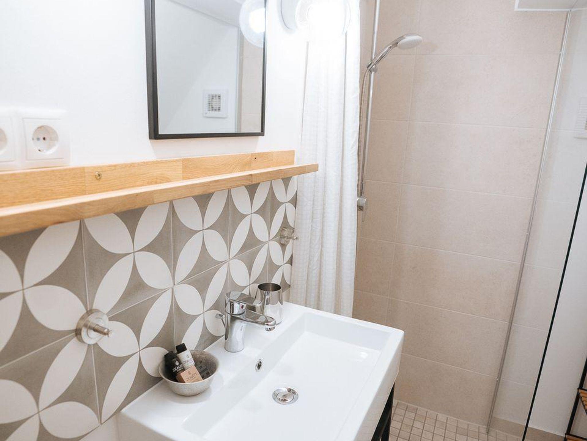 Die offene Küche zum Wohnzimmer ist funktional ausgestattet und eignet sich bestens für die Selbstversorgung: Ceranherd, Backofen, Kühlschrank mit Gefrierfach, Spülmaschine, Kaffeemaschine, Wasserkocher, Toaster, Mixer und umfassende Küchenutensilien runden die Ausstattung ab. Das Badezimmer bietet eine bodengleiche Dusche, WC, Waschbecken, Spiegel und Haartrockner.
