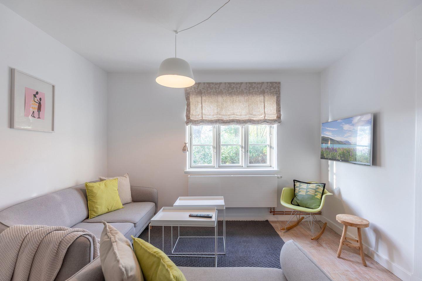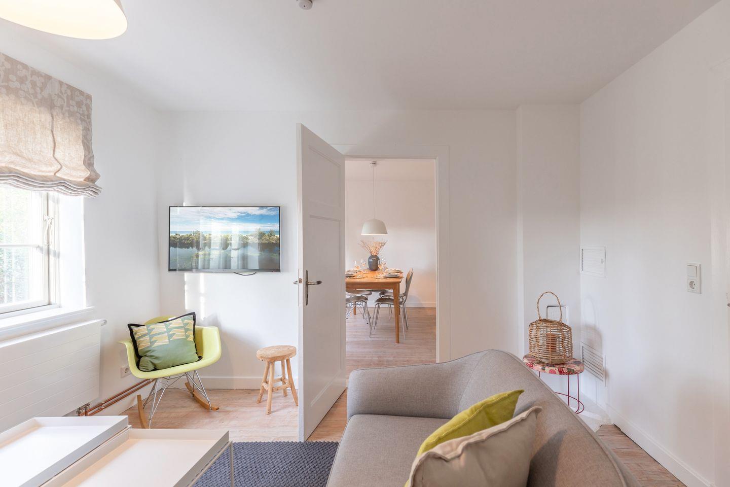 Sie betreten das Haus und gelangen sogleich in einen hell und freundlich gestalteten Flur mit Sisalteppich und Garderobe. Im großzügigen Wohnraum finden Sie Ruhe in einem gemütlichen Sitzbereich mit Fernseher.