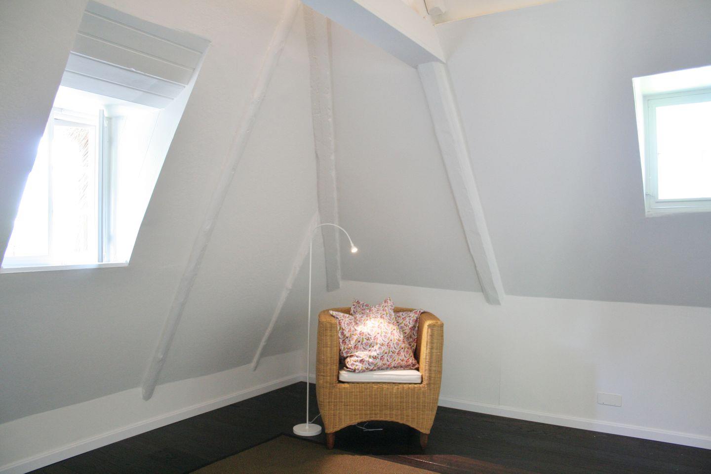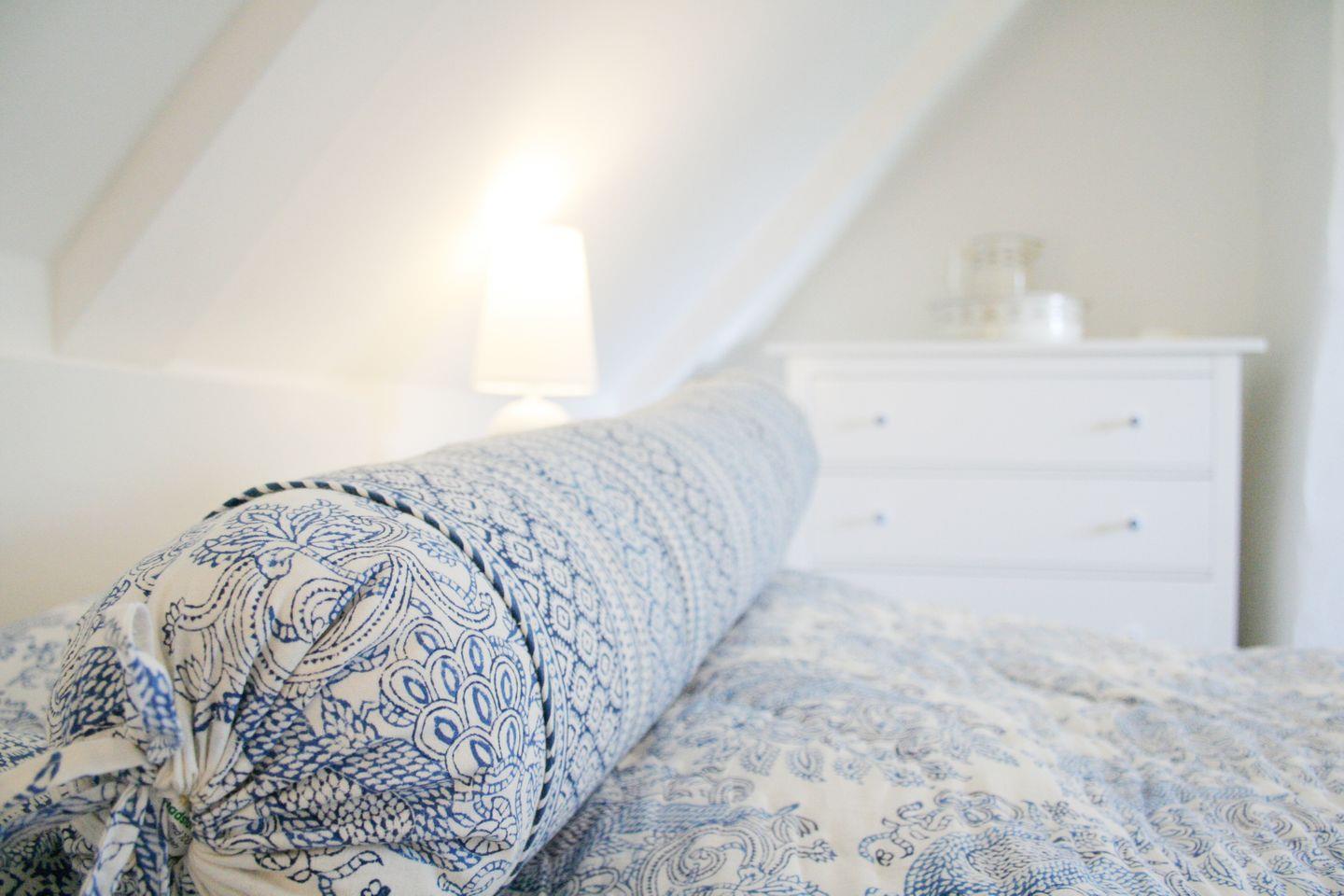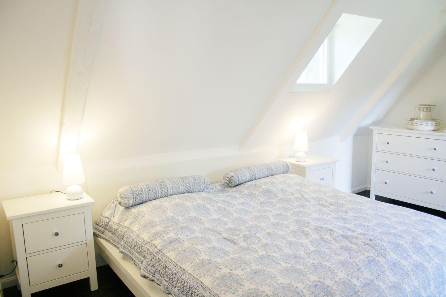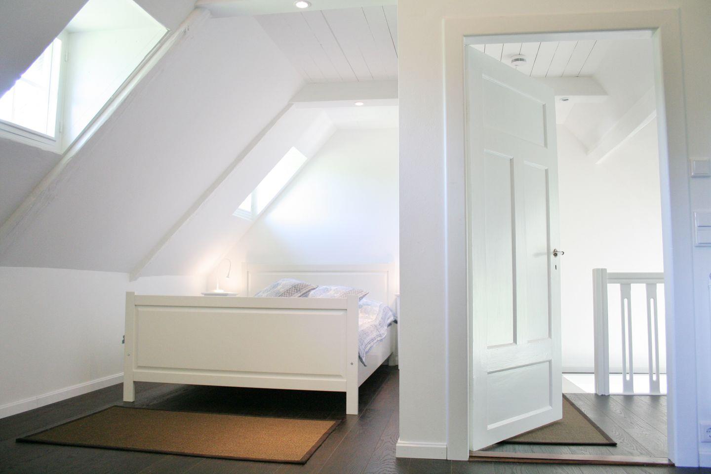 1 Schlafzimmer mit Doppelbett (200x160cm) und Hoch-Schlafkoje (200x160cm) im Hausgiebel, direkt unter dem Reetdach, für Piraten, Räuber und Prinzessinnen.