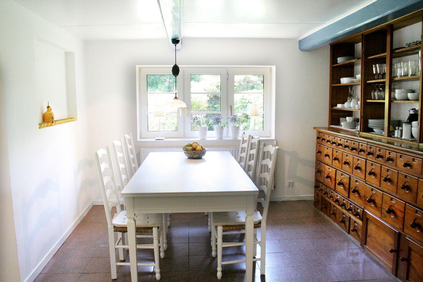Küche ausgestattet mit Cerankochfeld, Backofen, Geschirrspülmaschine, Mikrowelle, Kühlschrank mit Gefriermöglichkeit, großer Küchentisch und Kinderhochstuhl.