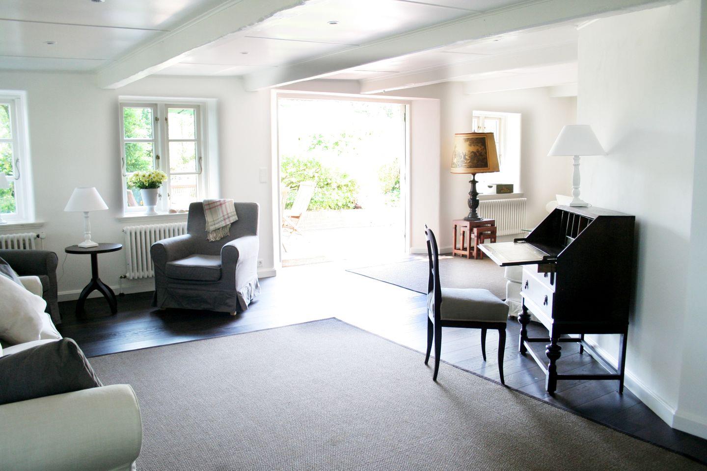 Großes Wohnzimmer mit 2 Sitzgruppen, Sekretär, Sessel und direktem Ausgang in den Garten, SAT-TV und Musikanlage