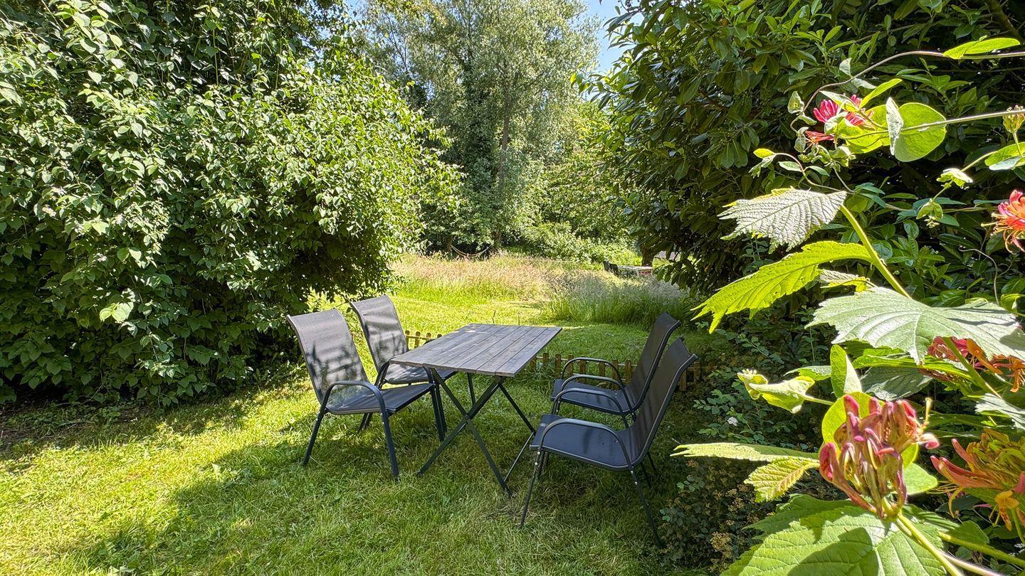 Der Garten zur Straße hin bietet einen Rückzugsort unter einer alten Kastanie, einer seltenen Elsbeere und einem großen Walnussbaum. Hier genießen Sie eine „Coolcation“ im Grünen, fernab der prallen Sonne – ideal für entspannte Stunden mit einem Buch oder geselligen Abenden bei einem Glas Wein. Lassen Sie sich im Frühjahr von der Krokuswiese und den Osterglocken verzaubern oder genießen Sie die blühenden Rhododendren im Mai.