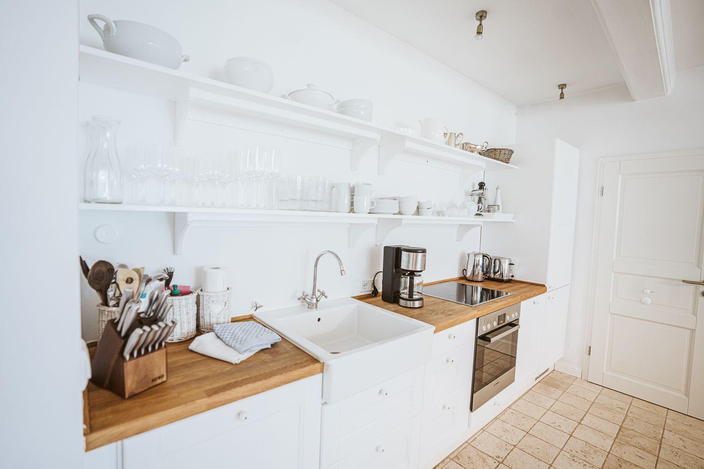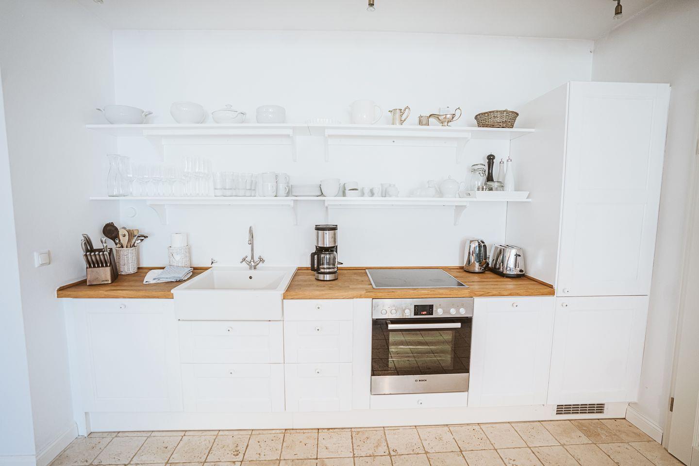 Die offene Küche ist zum Wohnzimmer hin gestaltet und vollständig ausgestattet: Ceran-Herd, Backofen, Kühlschrank mit Gefrierfach, Spülmaschine sowie Wasserkocher, Toaster, Mixer und Kaffeemaschine. Küchenutensilien sind in jeglicher Form reichlich vorhanden, sodass Sie sich unkompliziert selbst versorgen können.