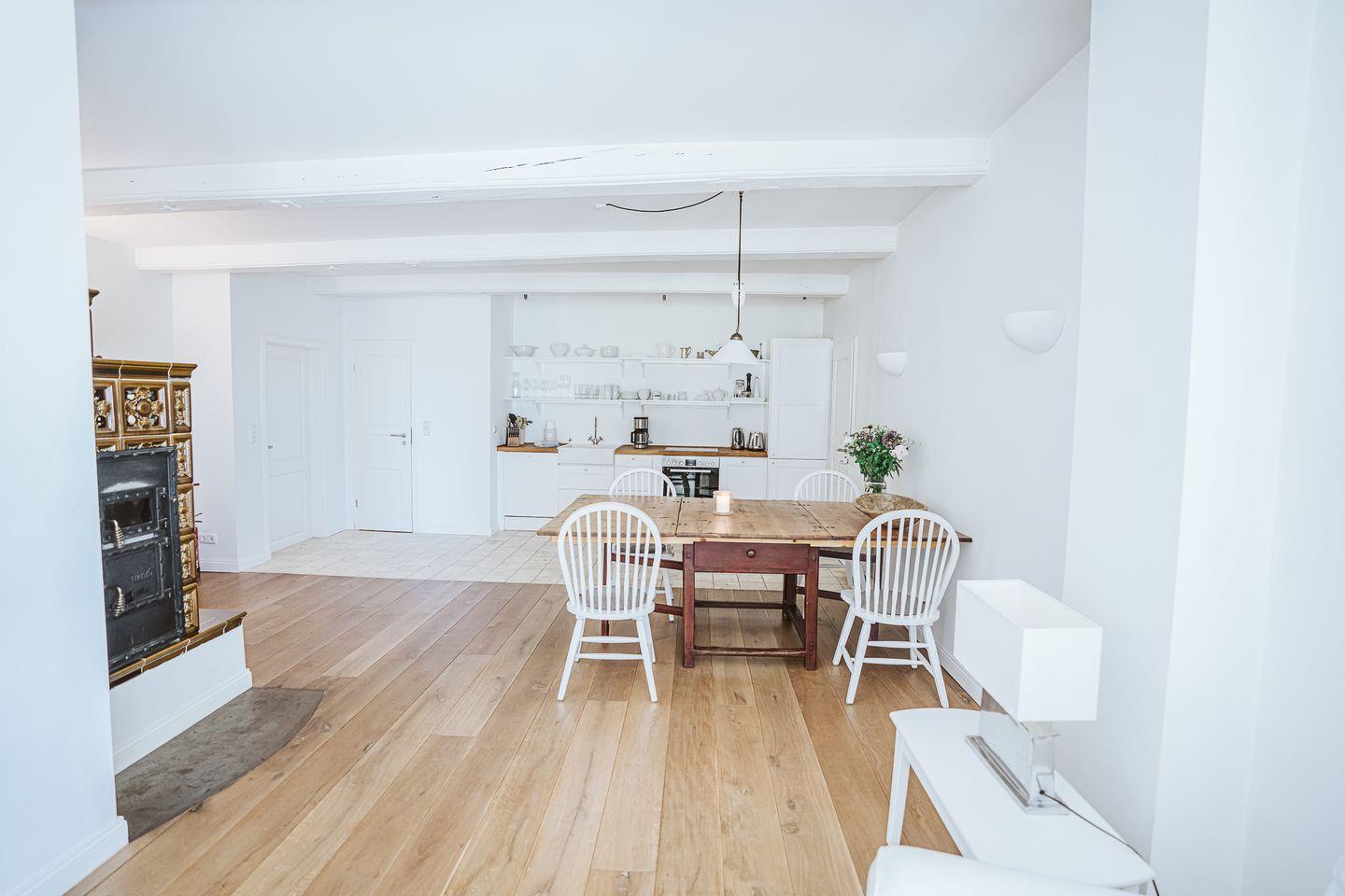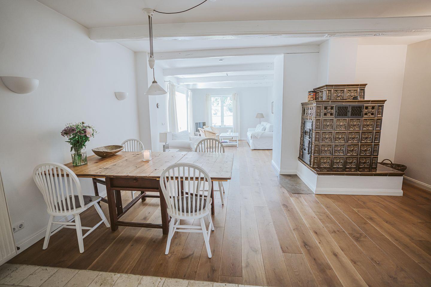 75 qm, 2 Personen plus 1 Kind (Reisebett im Schlafzimmer, Maximalgewicht Kind 15 kg, bis 3 Jahre), EG, eigener Garten, hohe Decken, Holzdielen und Sichtgebälk, sehr großzügiger Wohn-Essraum mit altem Kachelofen sowie antikem, großen Slagboard-Esstisch, Schlafzimmer mit Doppelbett, neues Bad mit ebenerdiger Dusche. Komplett ausgestattete Küche mit Backofen und Geschirrspüler.
