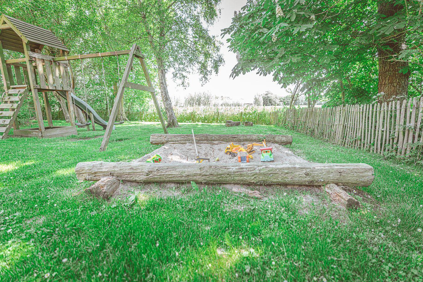 Im Außenbereich laden Terrasse, Gartenmöbel und Sonnenliegen zum Verweilen ein. Die Liegewiese sowie zahlreiche Spielmöglichkeiten wie Rutsche, Sandkasten, Schaukel, Fußballtor, Basketballkorb, Trampolin und ein Spielplatz bieten abwechslungsreiche Freizeit direkt am Haus.