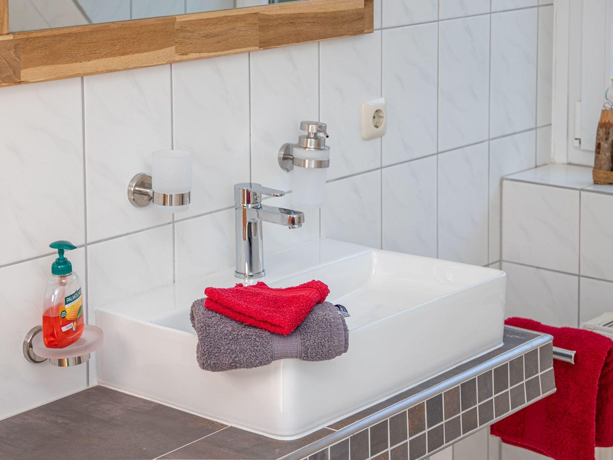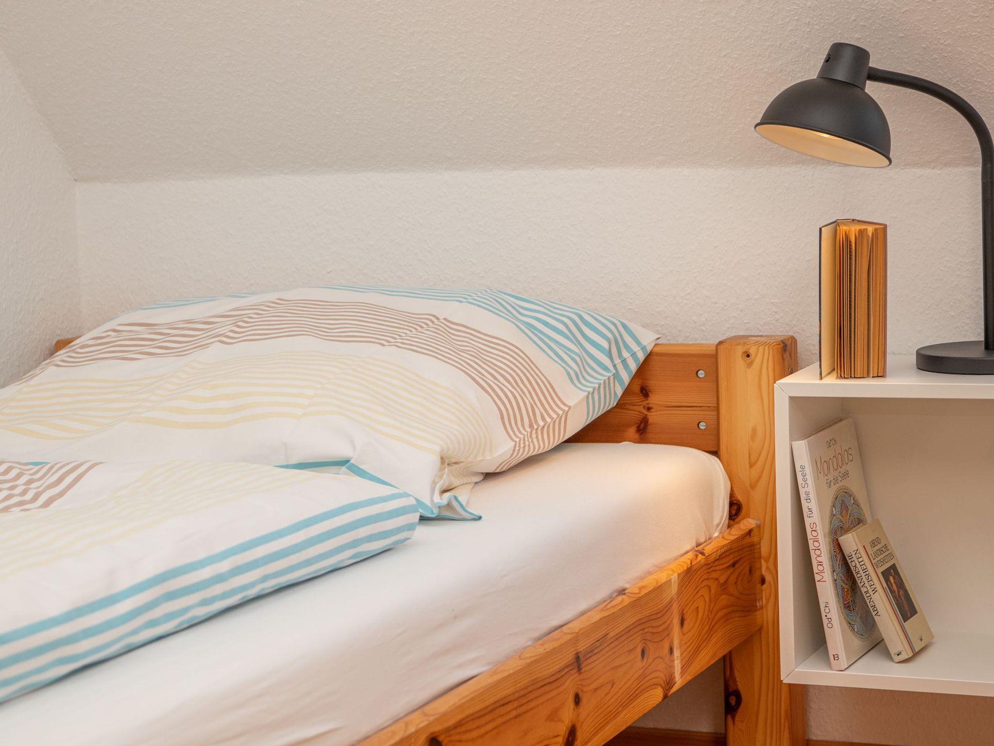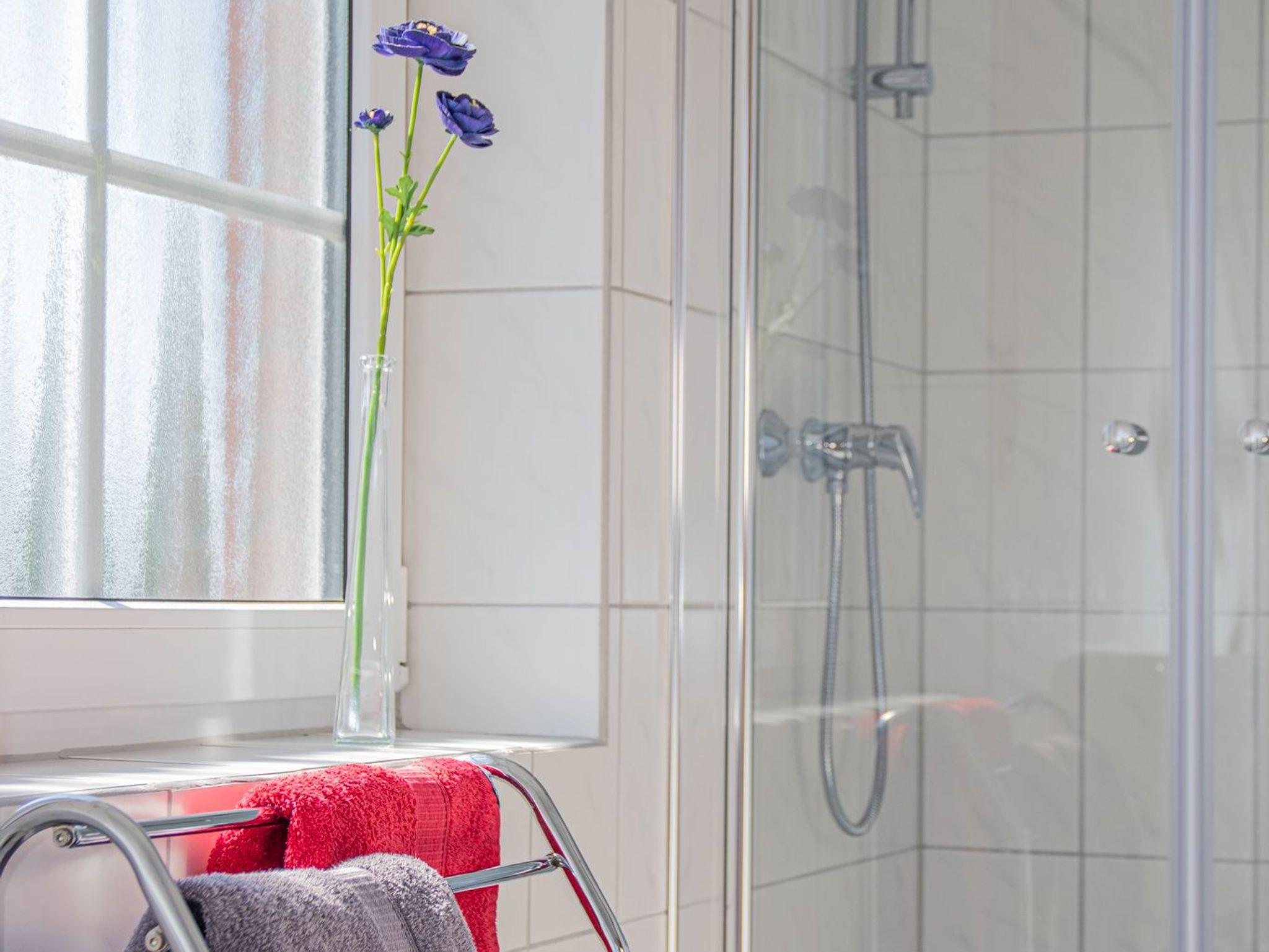 Schlafzimmer/Kinderzimmer mit Einzelbett Badezimmer mit Dusche, Waschtisch