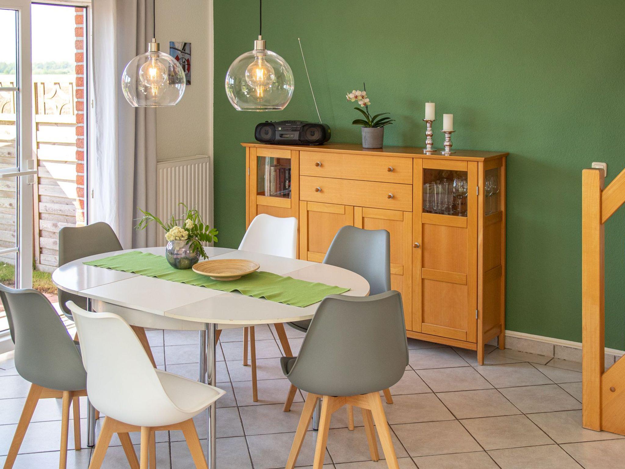 Das Haus verfügt über einen großen Wohn. und Eßebereich, von dort kommen Sie direkt auf die Terrasse mit dem herlichen Blick über die Felder bis hin zum weit entlegenden Stadtrand von Esens.