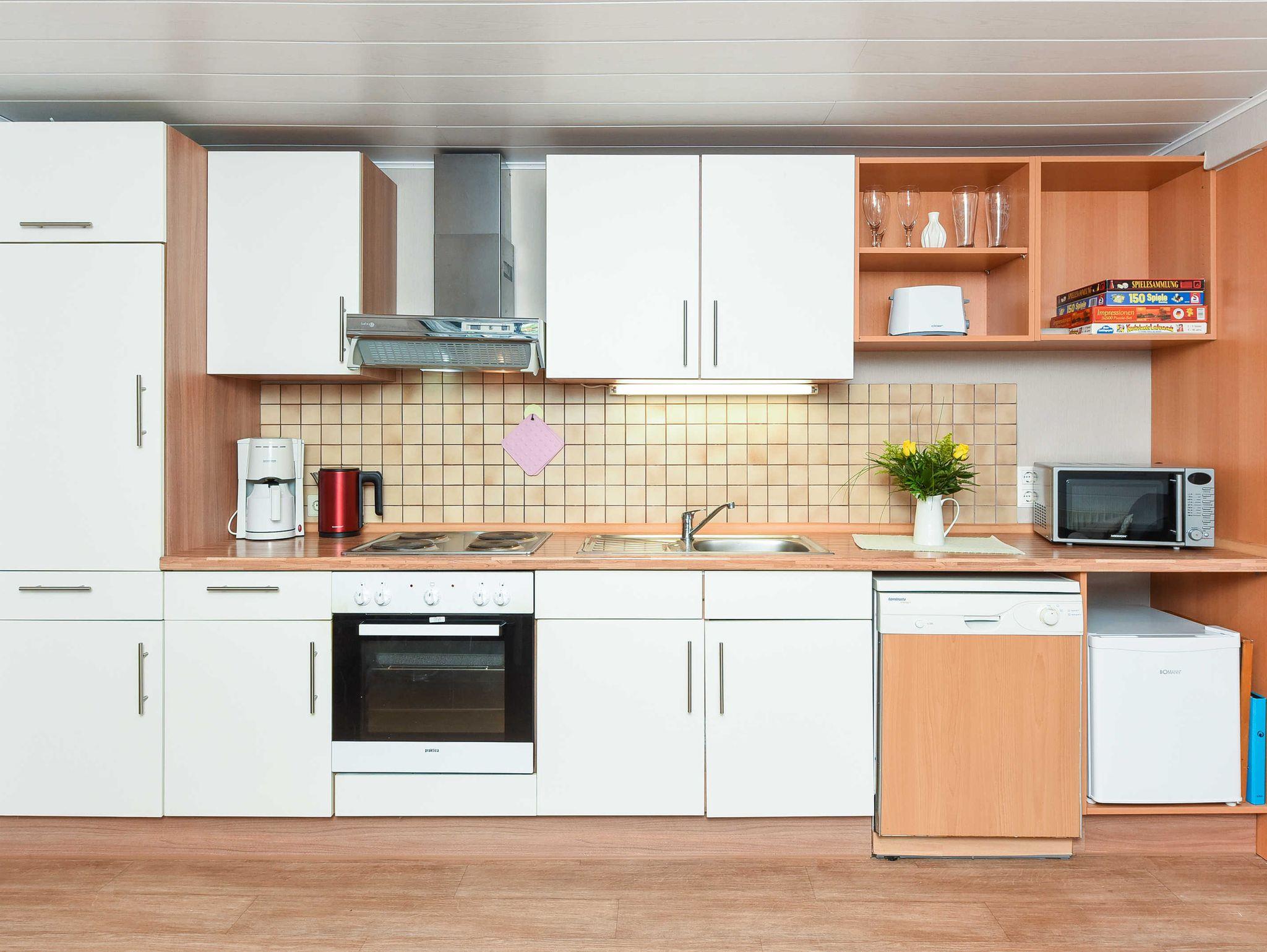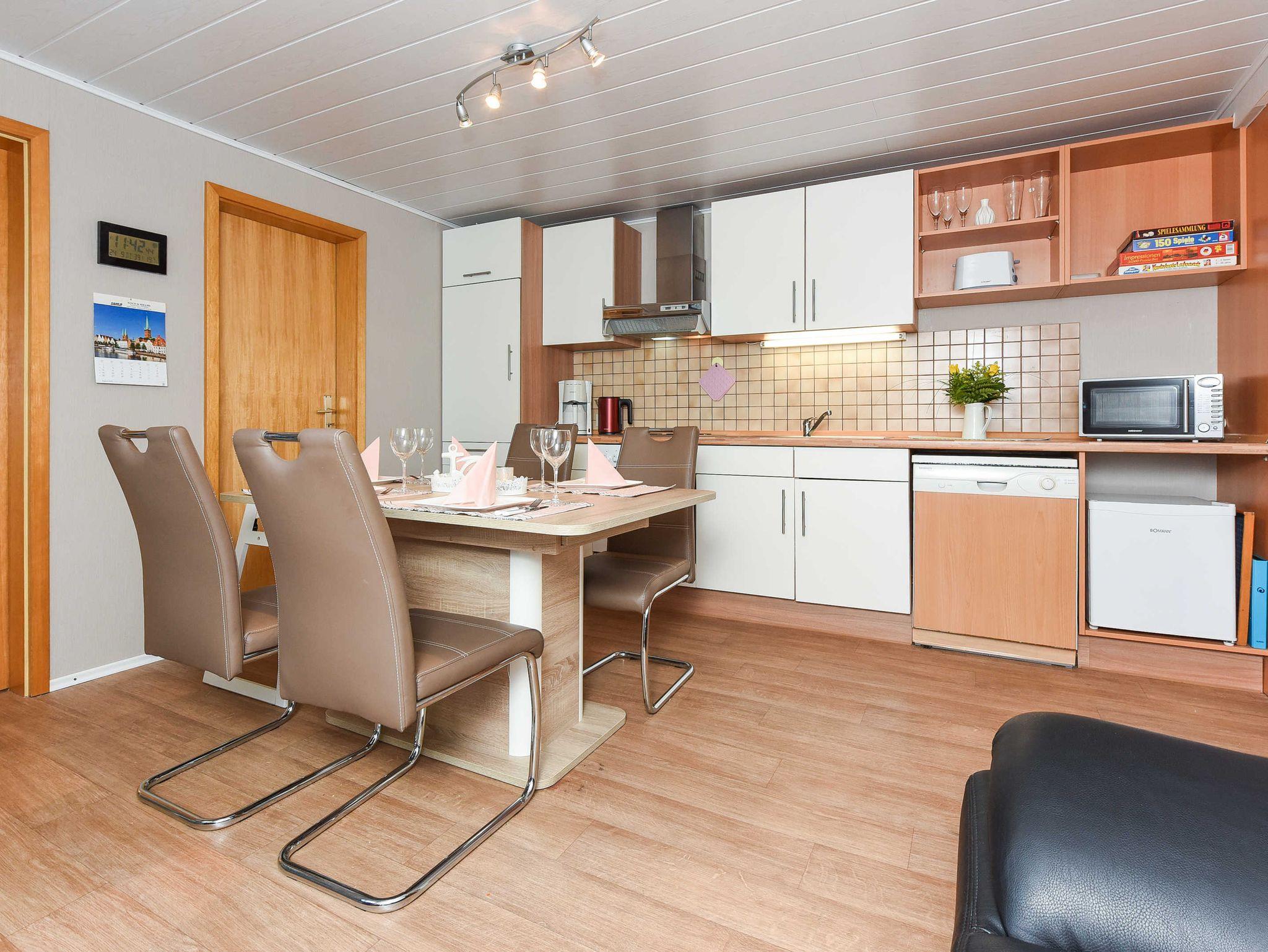 Größe ca. 45 Quadratmeter, Wohnraum mit integrierter Küche, Schlafzimmer, zweites separates Schlafzimmer/Kinderzimmer, Badezimmer mit Dusche, Waschtisch und WC, Obergeschoss, Internetzugang über WLAN möglich, optimal für 2 bis 4 Personen und zusätzlich ein Kleinkind.